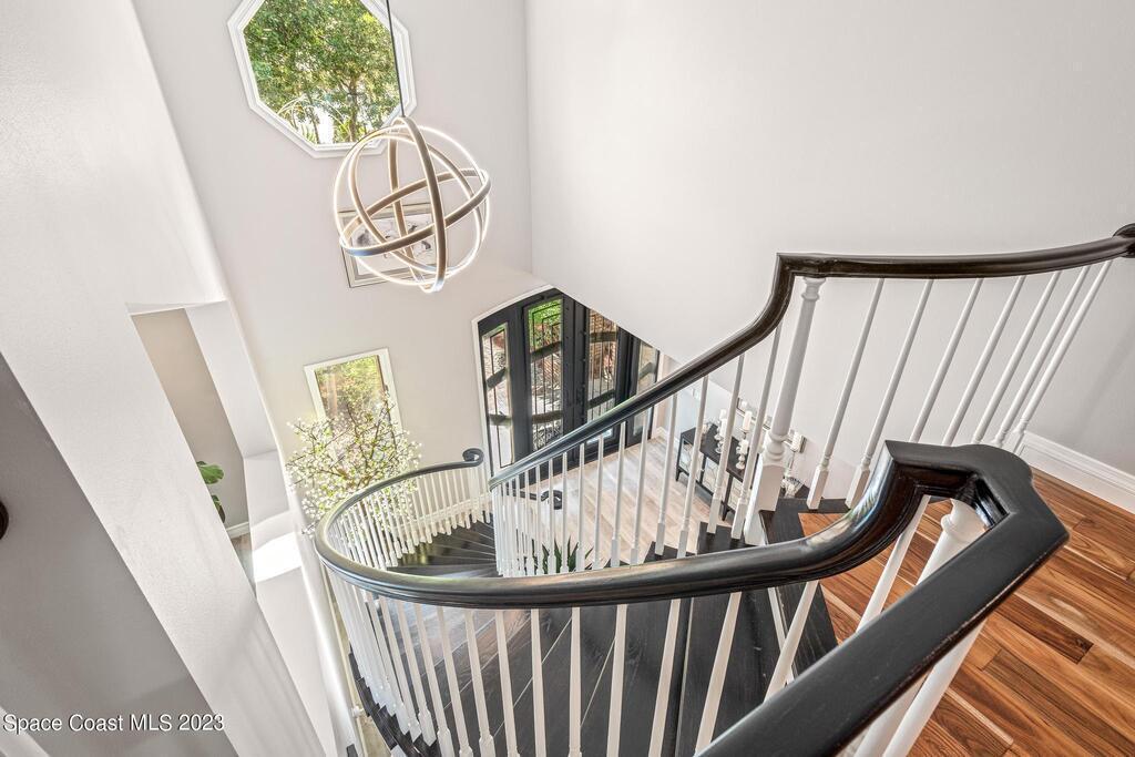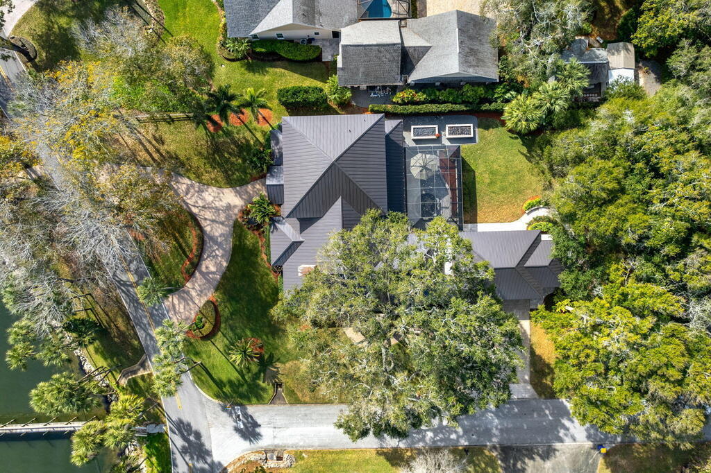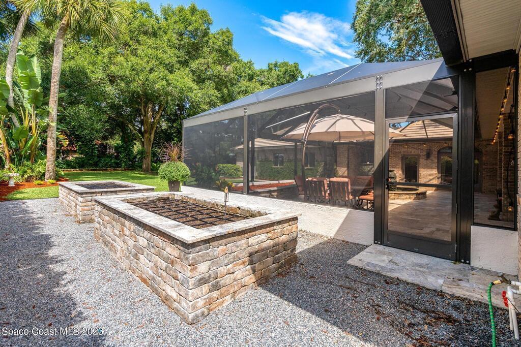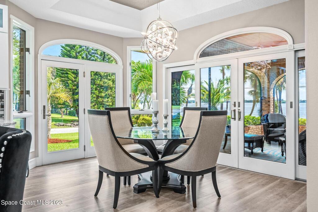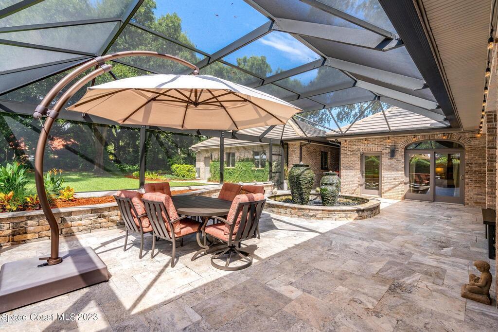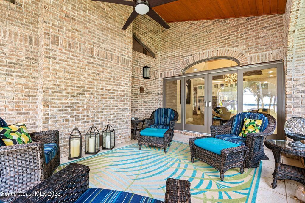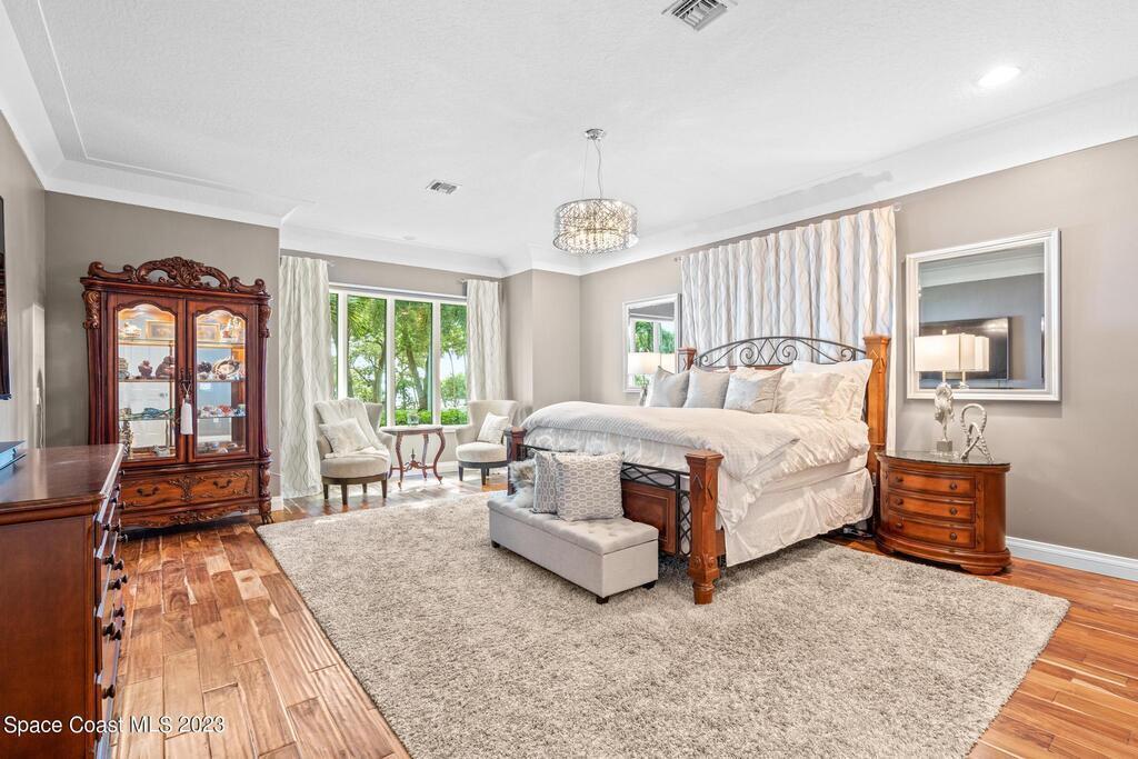 130ft of Indian Riverside frontage, a private boat dock & an elegant estate full of classic beauty! Softly lit ceilings tower over big windows streaming natural light throughout. Solid teak hardwood & LVP floors span open, sophisticated living & dining spaces. Bay windows, a marble fireplace & luxury finishes add custom flair. Showcasing a quartz waterfall-edge island, the kitchen exhibits white glass-accented cabinetry, a butler's pantry, Bosch SS appliances, double wall ovens, a gas stove & wine cooler. The 1st-floor owner's retreat features a sitting area w/riverfront views, floating vanities, a jetted tub & bench shower. A curved staircase leads up to a loft, 2bdrms & full bath. A 2024 metal roof. 2 breezy screened lanais offer tranquil water features, backyard & river views!