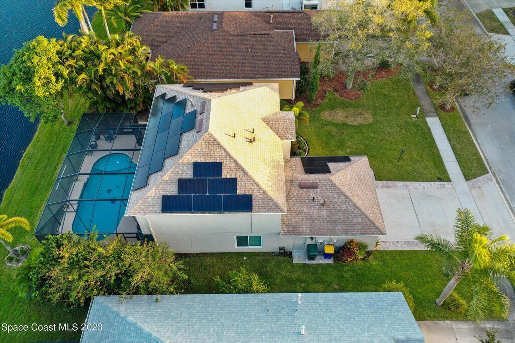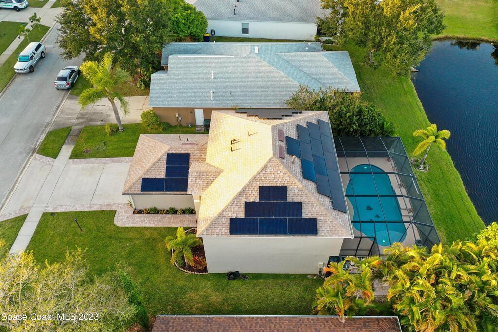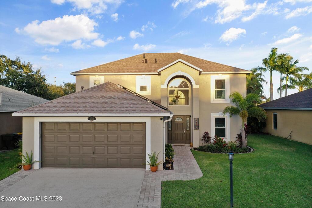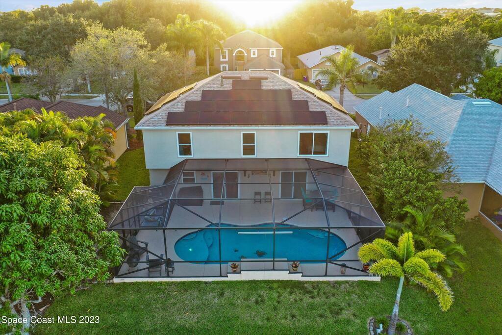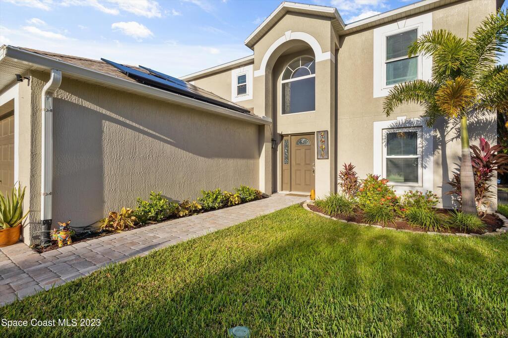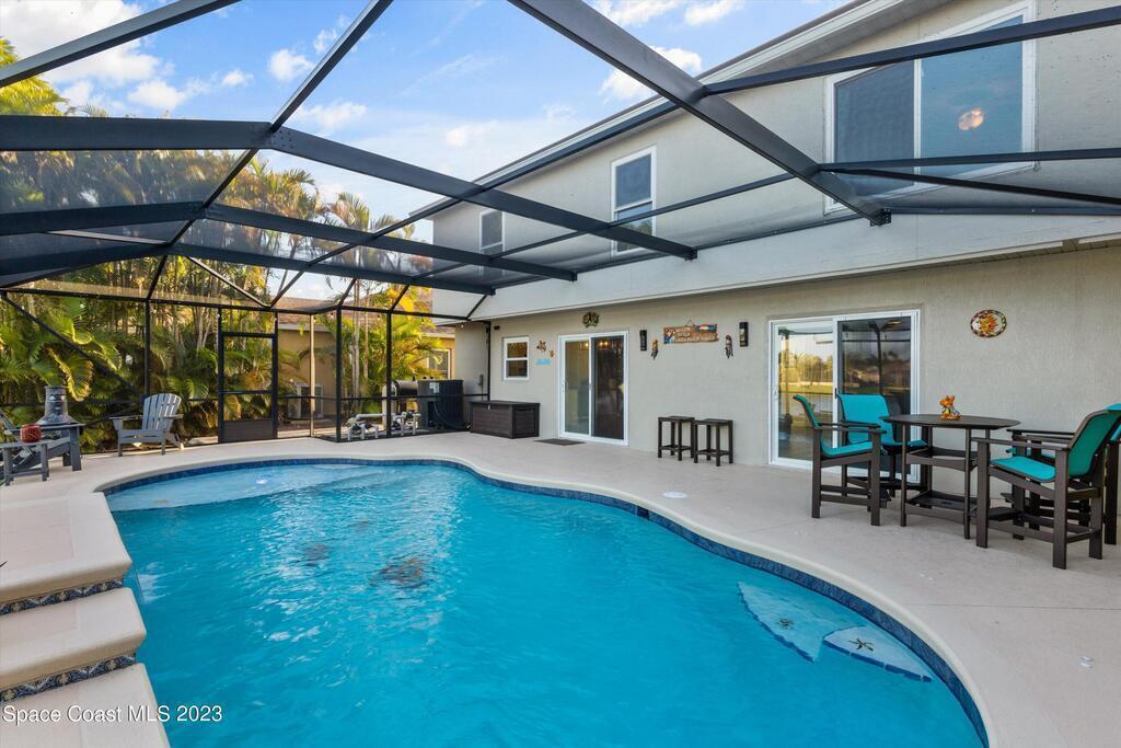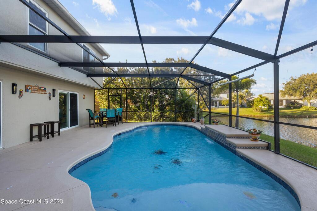 Welcome to your dream home! This 5 bed, 2.5 bath gem offers luxury living. Dive into the 2yr old saltwater pool, enjoy the updated kitchen with sleek finishes. Pond views, hurricane-proof windows ensure safety. New AC, roof in 2019, water heater in 2018. Luxury vinyl plank flooring, solar panels for efficiency. Appliances stay. 10 mins to Viera Avenues, 15 mins to beaches, 45 mins to Orlando Airport, 30 mins to Port Canaveral. Oversized bedroom on main level with half bath. Updated fixtures, gas line access for pool heating & outdoor kitchen. Don't miss this luxury, convenience, potential!