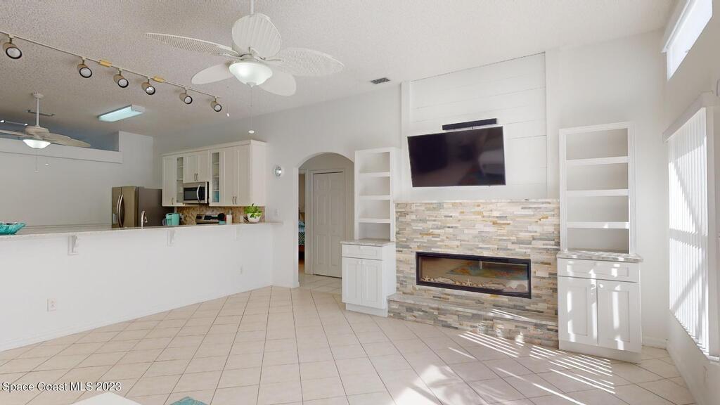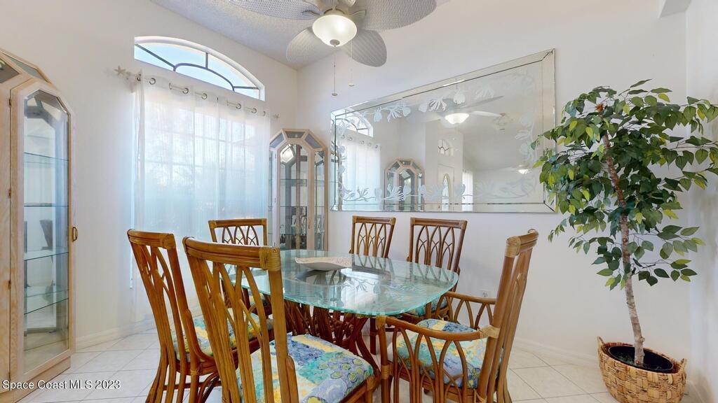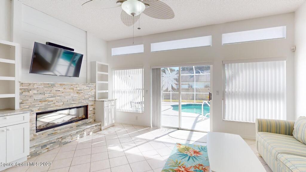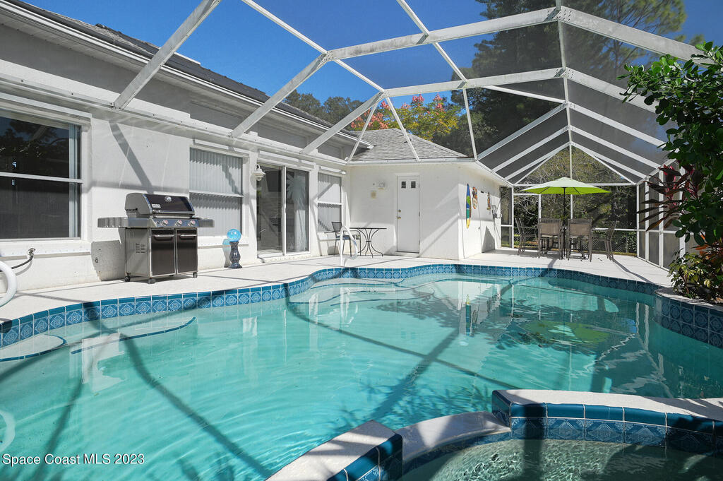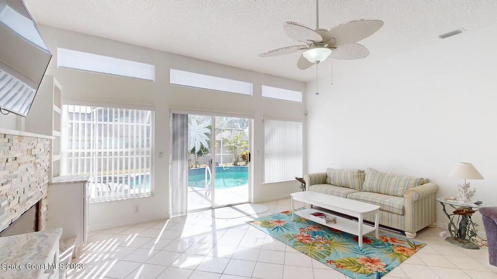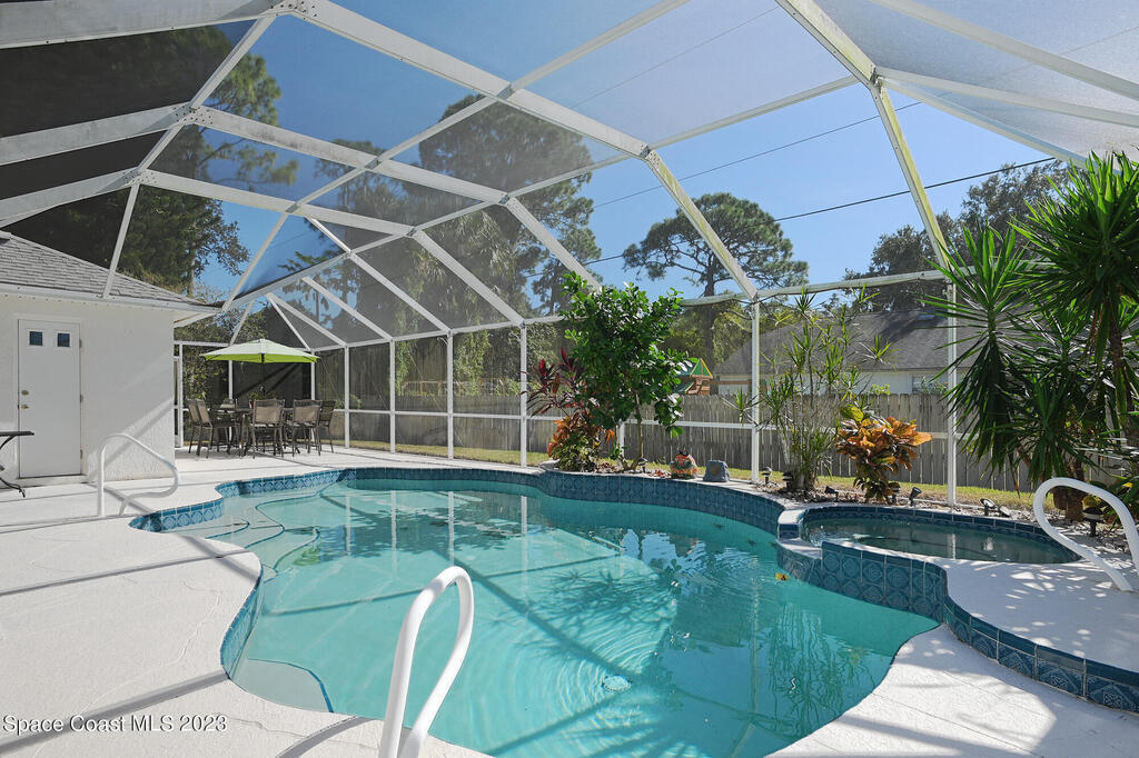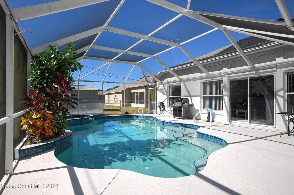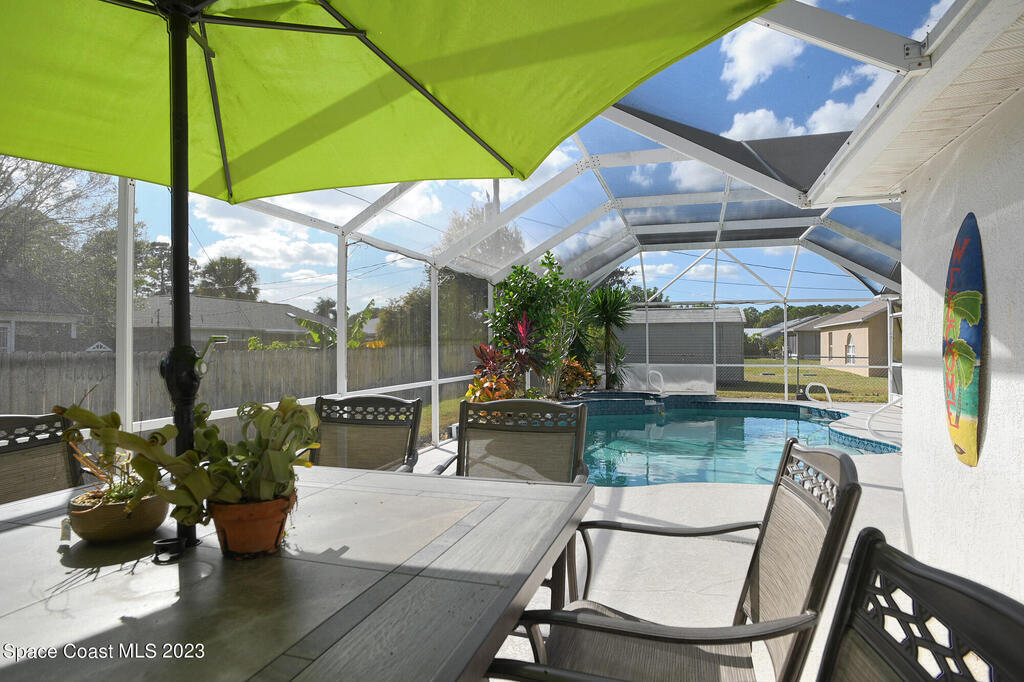 This Palm Bay pool home is a sunlit oasis with an open floor plan of the spacious living area that flows into the updated kitchen, a custom multi-color electric fireplace, creating a nautical ambiance that overlooks the pool area, complete with a cabana bathroom and a fully fenced backyard. The master bedroom is generously sized, plus there's an en-suite bedroom with a separate entrance in the guest wing. The screened-in garage with laundry area offers expansion potential. This home offers the best of both worlds, a tranquil suburban lifestyle with easy access to all the amenities and attractions of the Space Coast, nearby beaches, exploring nature reserve, great schools, & restaurants. NEW ROOF before closing.Rm sz subj to error.