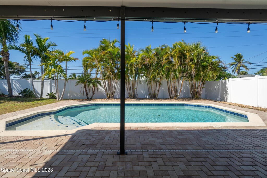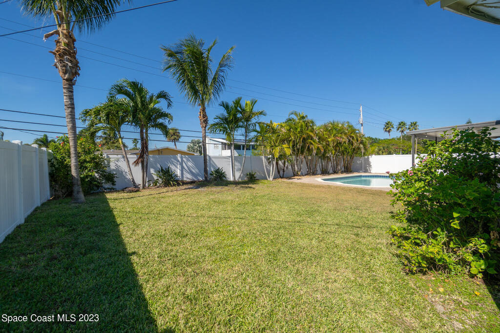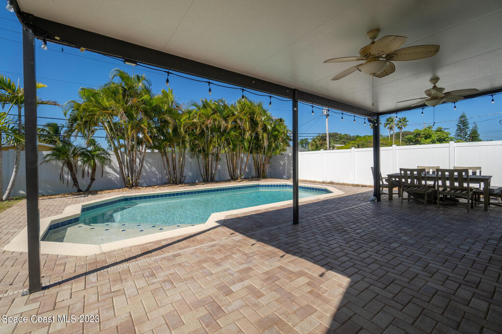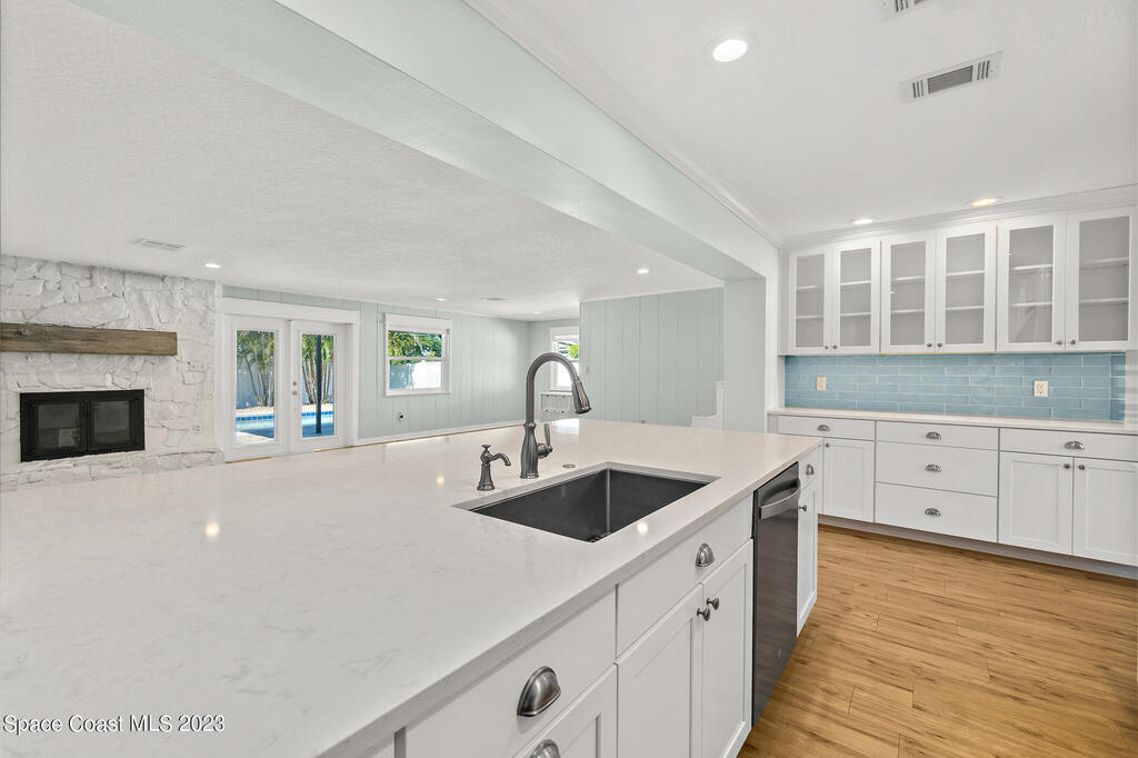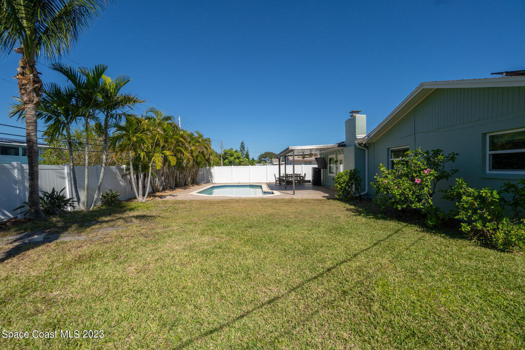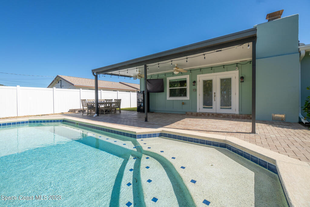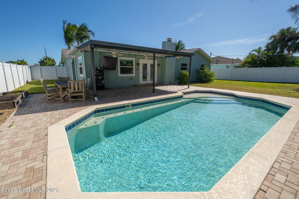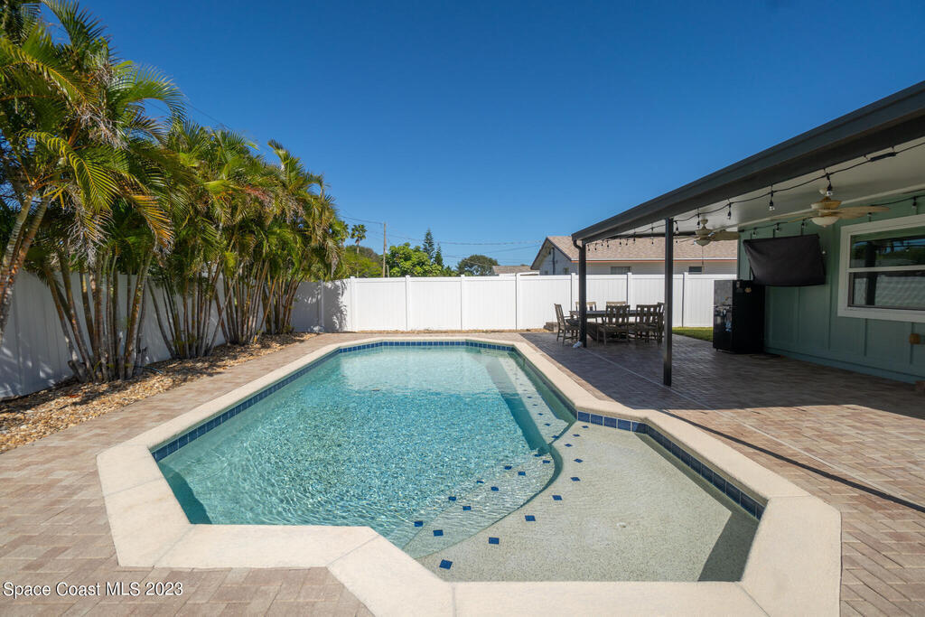 Nestled in the heart of the tranquil coastal community of Indian Harbour Beach, this immaculate POOL home boasts a prime location, just a short half-mile to the sun-kissed shores of the Atlantic Ocean. With no HOA, this home is the embodiment of relaxed coastal living. As you step inside, you're immediately greeted by a warm & inviting ambiance. The kitchen is a highlight w/crown molding, a generous pantry, sleek stainless farmhouse sink & striking blue tile backsplash that adds a vibrant touch. The large Quartz island serves as ample cooking space & convenient breakfast bar, making it ideal for both meals & entertaining guests. The comfortable living area includes a cozy fireplace w/stone mantle & newer French doors leading to the covered patio/backyard where you will discover your own