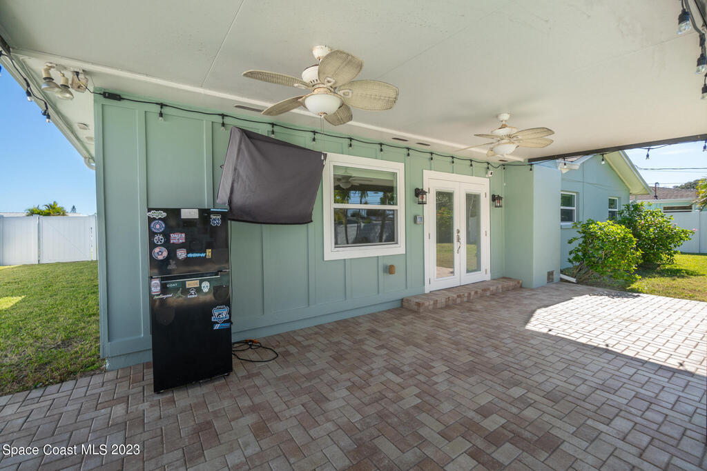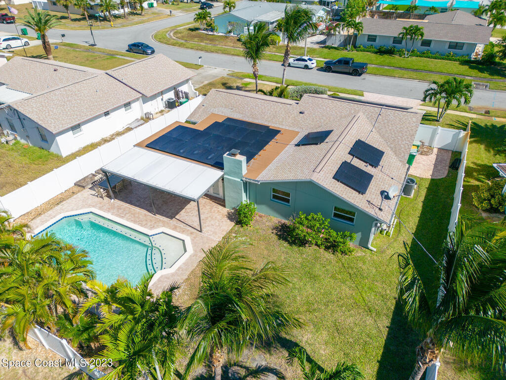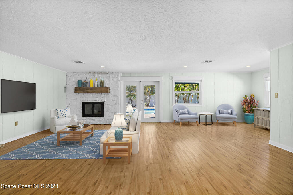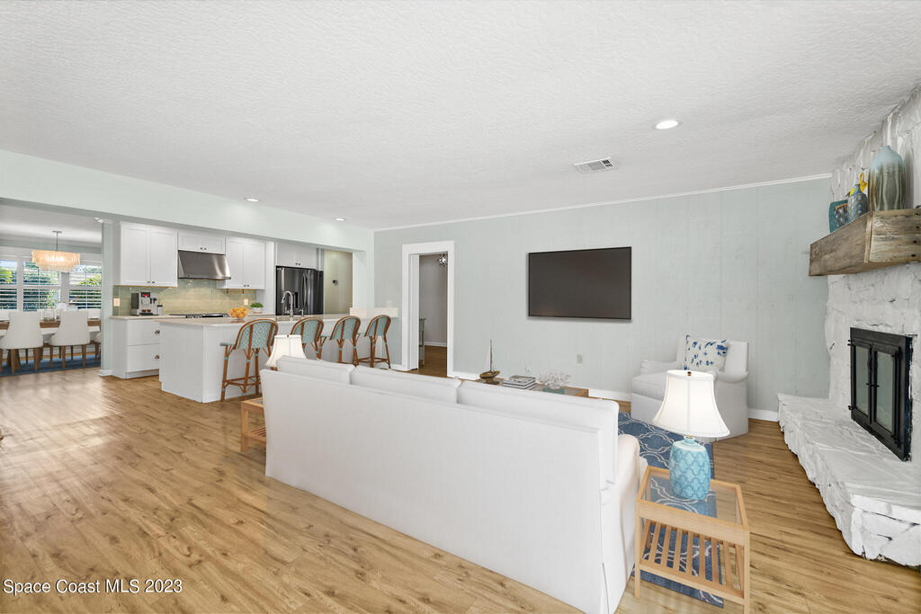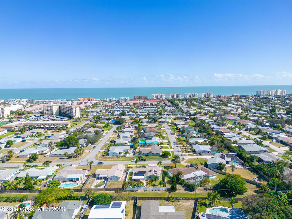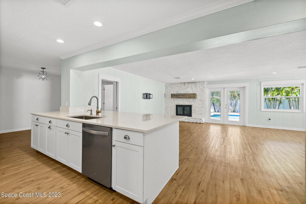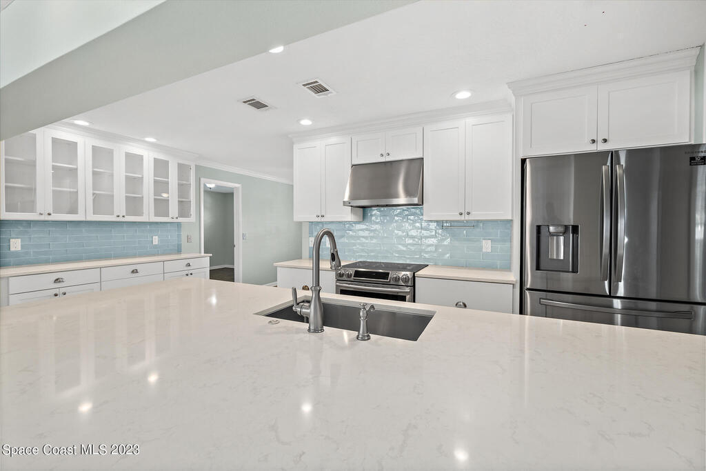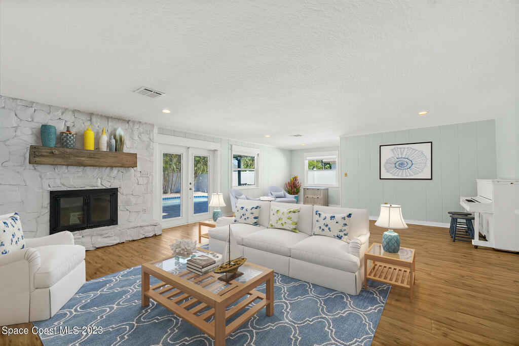 Nestled in the heart of the tranquil coastal community of Indian Harbour Beach, this immaculate POOL home boasts a prime location, just a short half-mile to the sun-kissed shores of the Atlantic Ocean. With no HOA, this home is the embodiment of relaxed coastal living. As you step inside, you're immediately greeted by a warm & inviting ambiance. The kitchen is a highlight w/crown molding, a generous pantry, sleek stainless farmhouse sink & striking blue tile backsplash that adds a vibrant touch. The large Quartz island serves as ample cooking space & convenient breakfast bar, making it ideal for both meals & entertaining guests. The comfortable living area includes a cozy fireplace w/stone mantle & newer French doors leading to the covered patio/backyard where you will discover your own