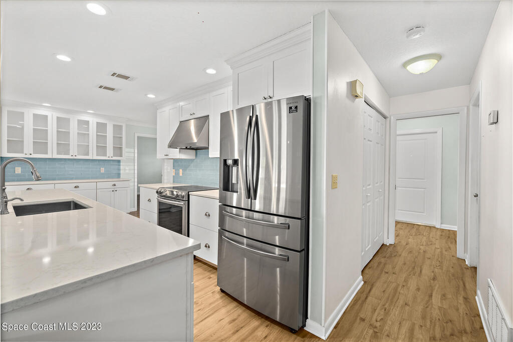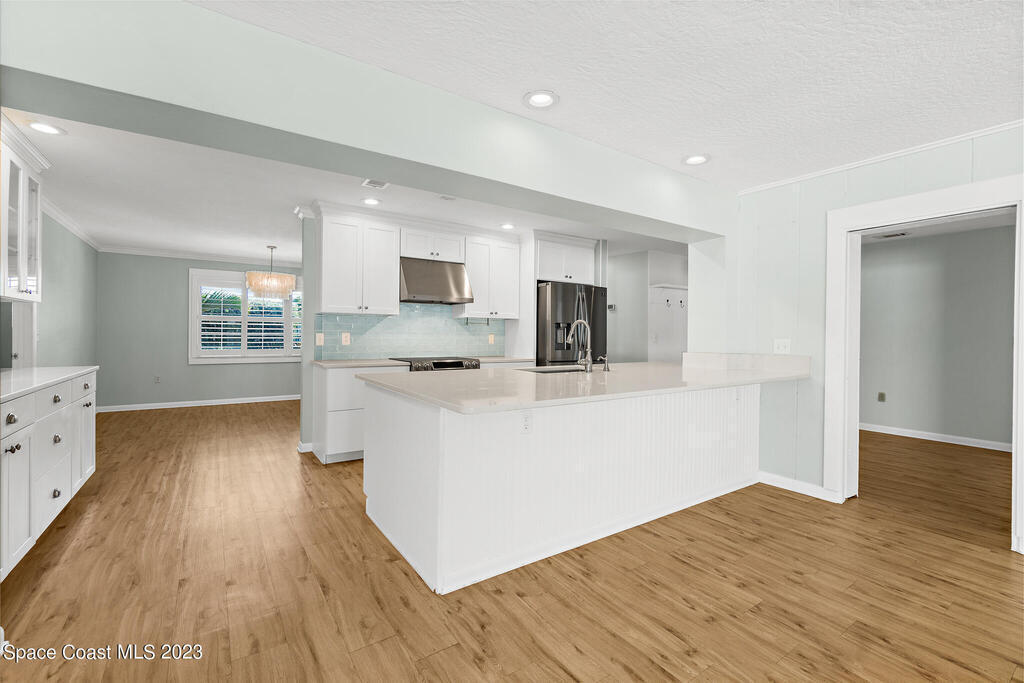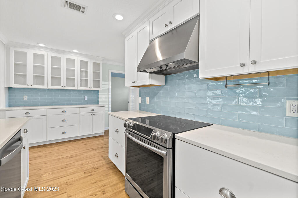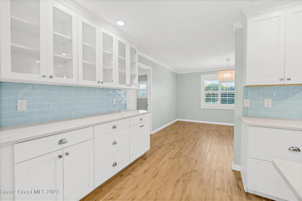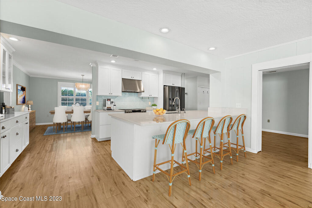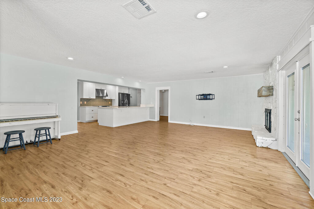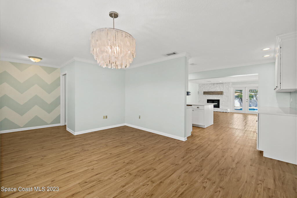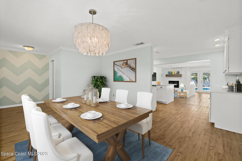 Nestled in the heart of the tranquil coastal community of Indian Harbour Beach, this immaculate POOL home boasts a prime location, just a short half-mile to the sun-kissed shores of the Atlantic Ocean. With no HOA, this home is the embodiment of relaxed coastal living. As you step inside, you're immediately greeted by a warm & inviting ambiance. The kitchen is a highlight w/crown molding, a generous pantry, sleek stainless farmhouse sink & striking blue tile backsplash that adds a vibrant touch. The large Quartz island serves as ample cooking space & convenient breakfast bar, making it ideal for both meals & entertaining guests. The comfortable living area includes a cozy fireplace w/stone mantle & newer French doors leading to the covered patio/backyard where you will discover your own