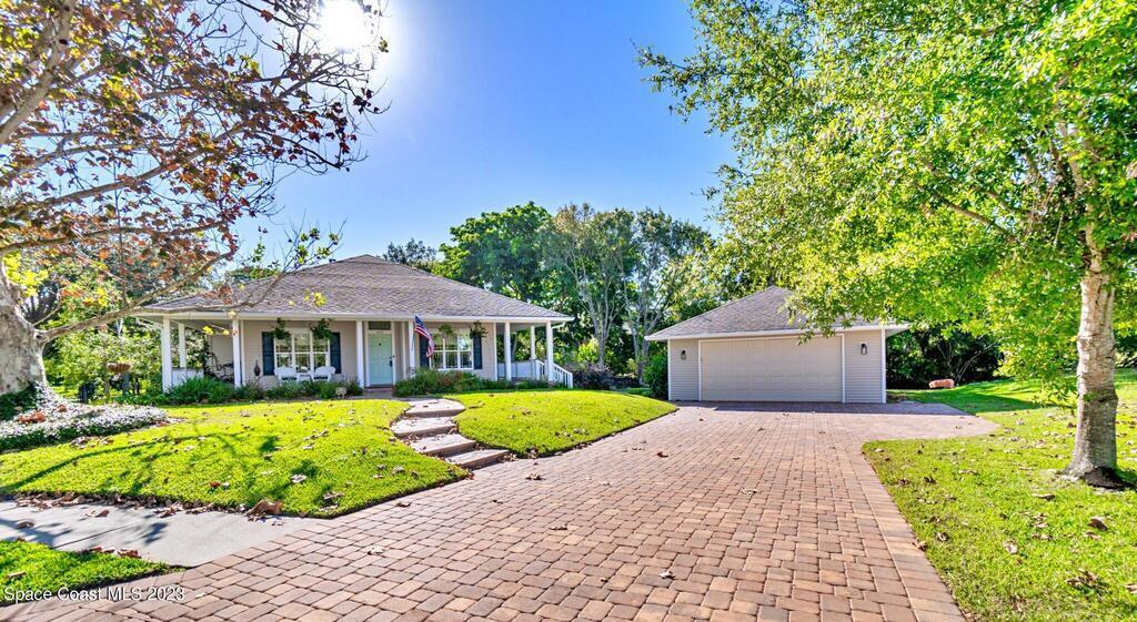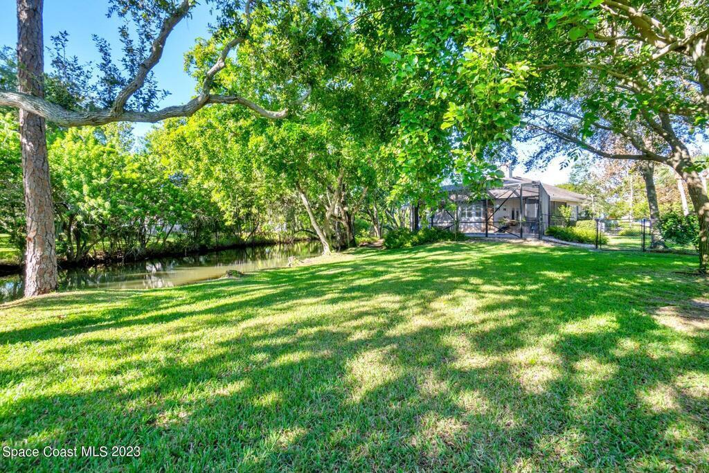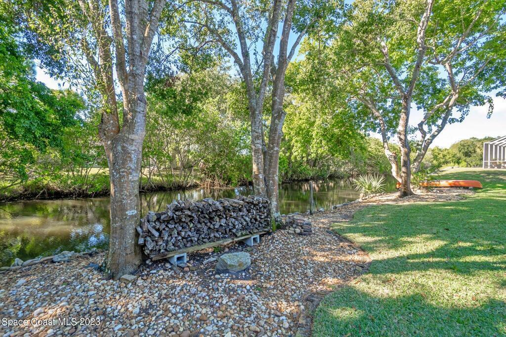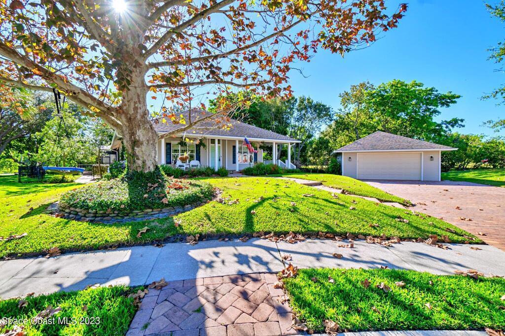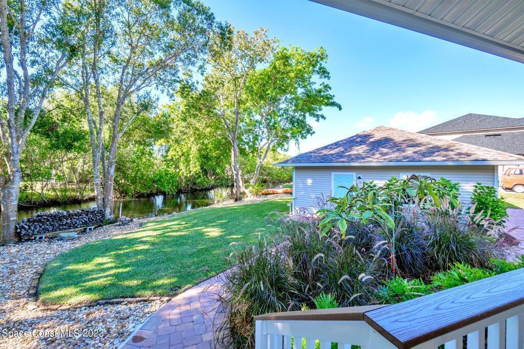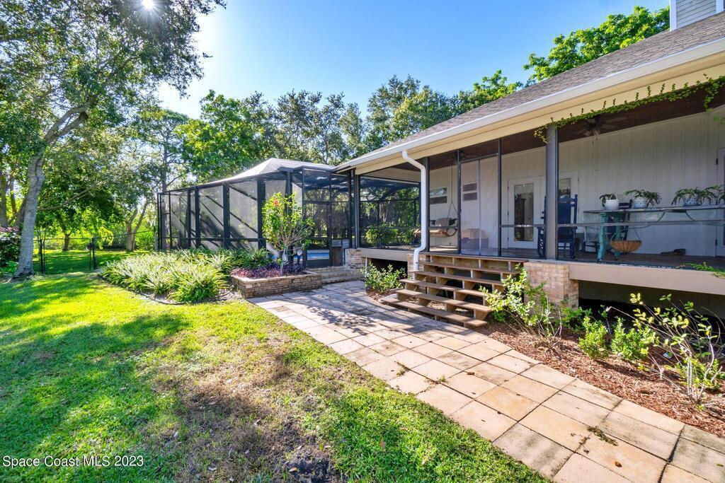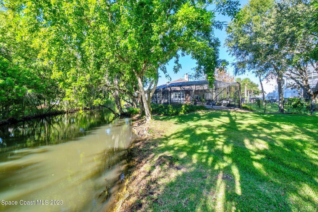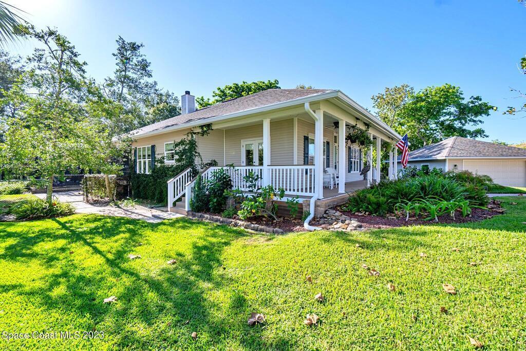 Stunning 4 bedroom 2 bath pool home on navigable canal leading to the Indian River Lagoon! Located at the end of a cul-de-sac on a 0.63 acre lot; this remodeled home features a spacious wraparound porch with water views, detached 2-car garage with new insulated door, new A/C, new wood-look tile throughout, new pool pump for saltwater pool, new gutters, new sprinkler system and more. The completely renovated kitchen boasts quartz counters, soft close cabinets and drawers, high-end appliances, pantry, coffee bar and large center island. Master suite offers large walk-in closet, porch and pool access, luxe bath including double vanities with water view, private toilet and tiled shower. Paddleboard to the river directly from the sizable yard or launch a boat at the community ramp and dock!