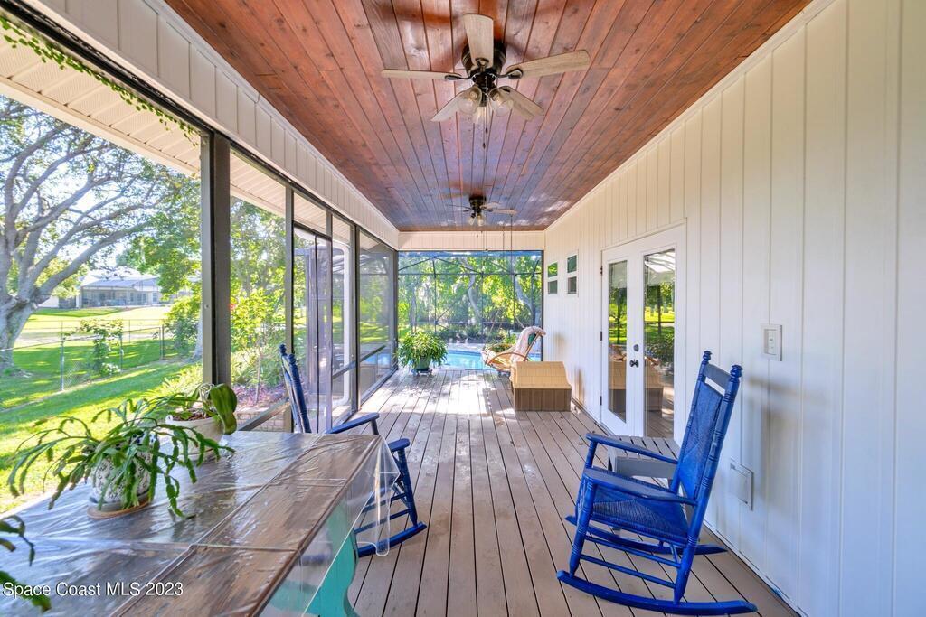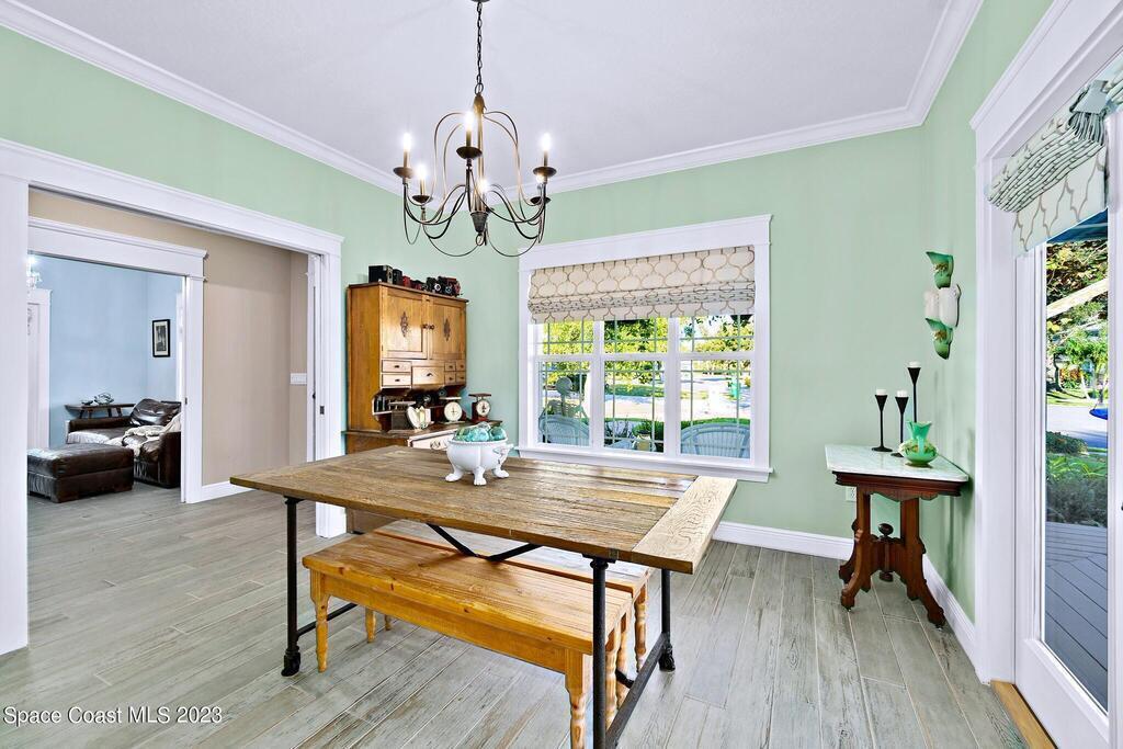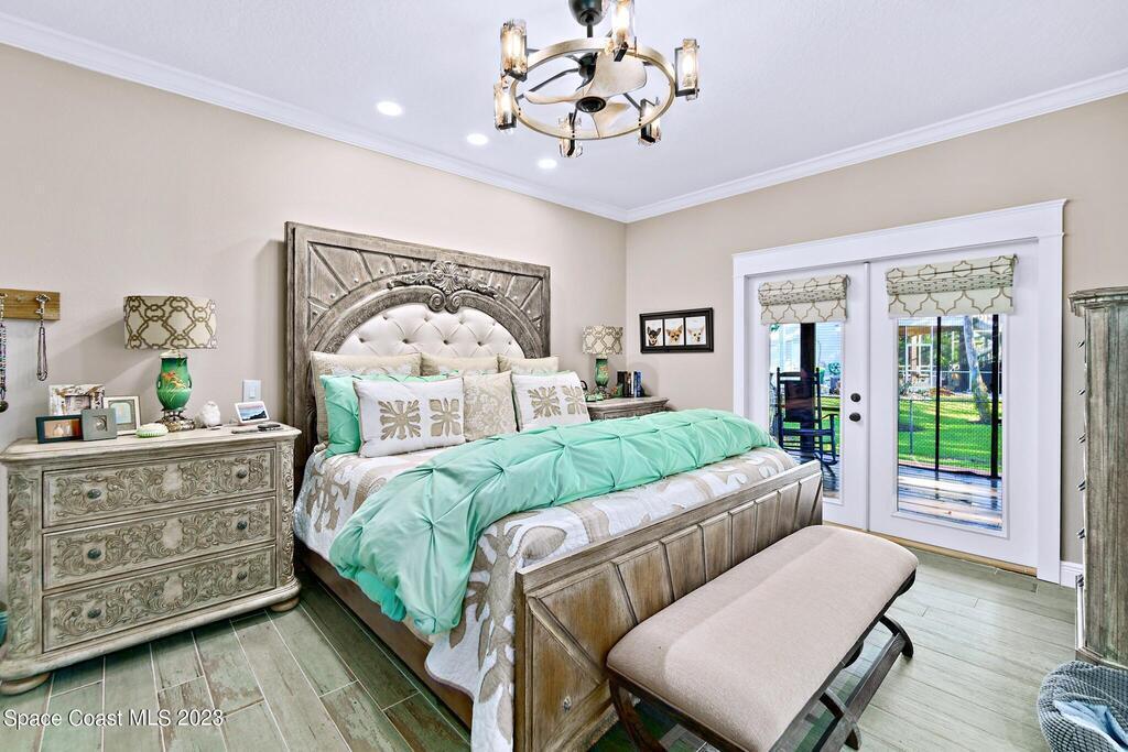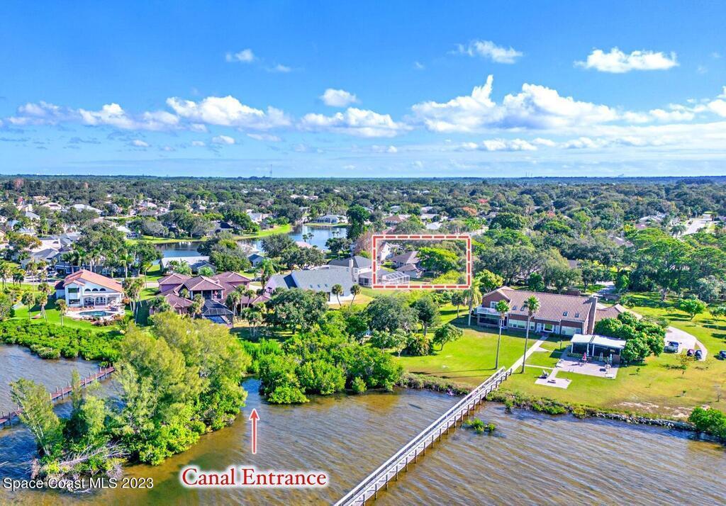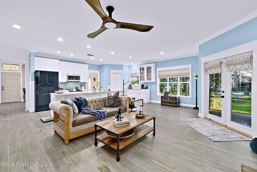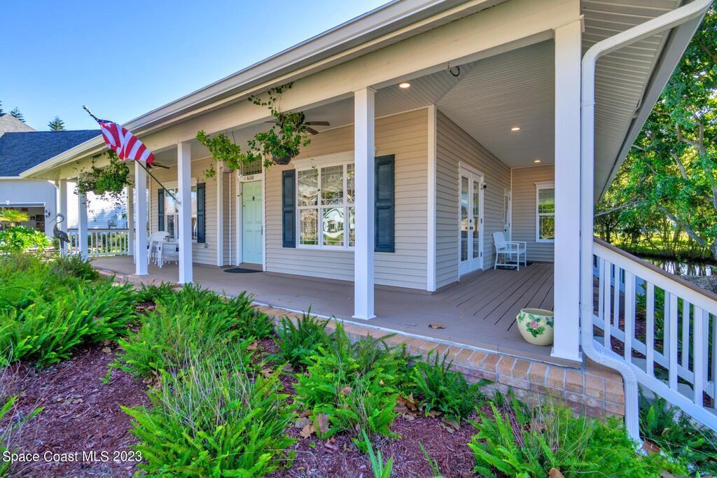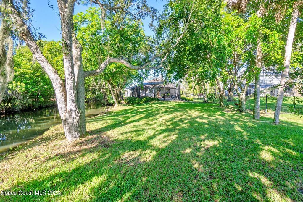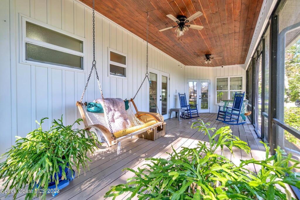 Stunning 4 bedroom 2 bath pool home on navigable canal leading to the Indian River Lagoon! Located at the end of a cul-de-sac on a 0.63 acre lot; this remodeled home features a spacious wraparound porch with water views, detached 2-car garage with new insulated door, new A/C, new wood-look tile throughout, new pool pump for saltwater pool, new gutters, new sprinkler system and more. The completely renovated kitchen boasts quartz counters, soft close cabinets and drawers, high-end appliances, pantry, coffee bar and large center island. Master suite offers large walk-in closet, porch and pool access, luxe bath including double vanities with water view, private toilet and tiled shower. Paddleboard to the river directly from the sizable yard or launch a boat at the community ramp and dock!