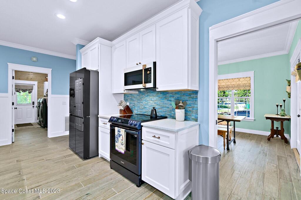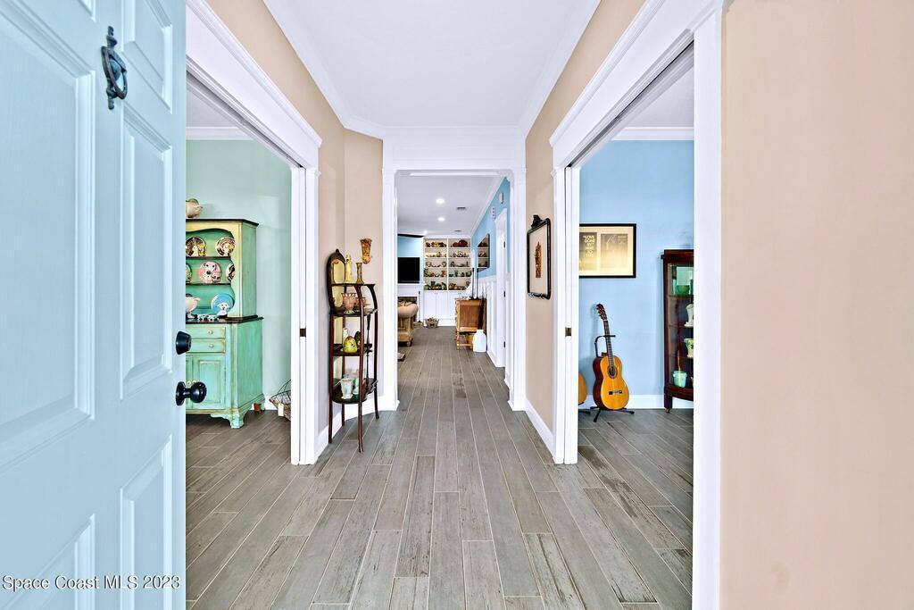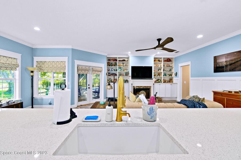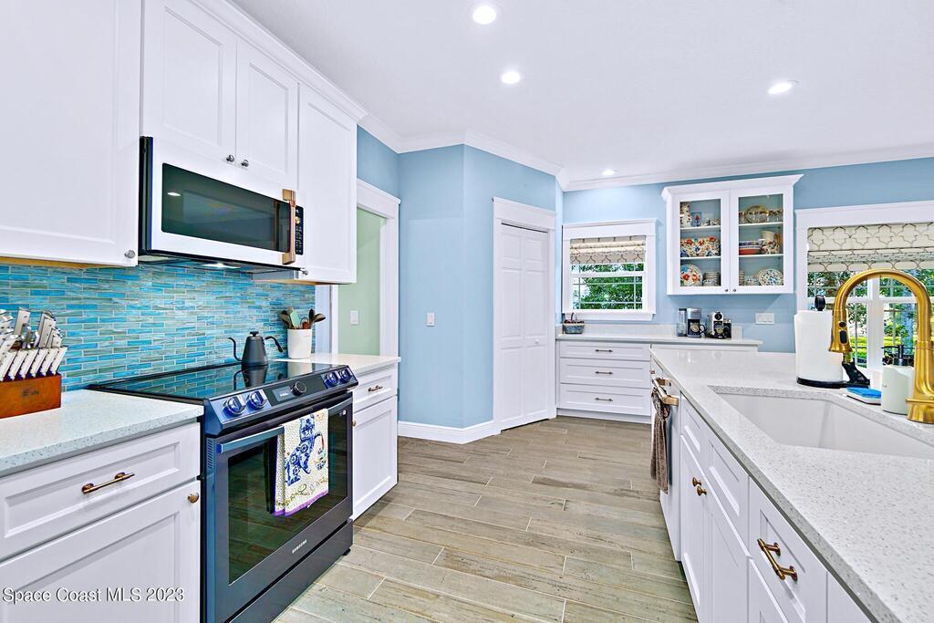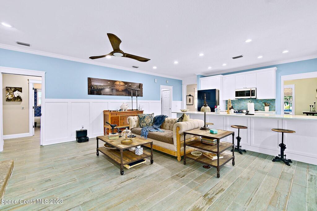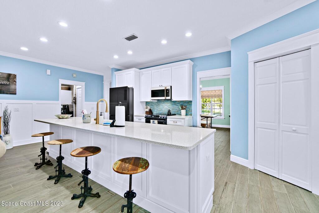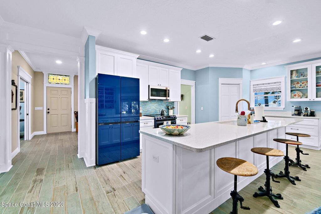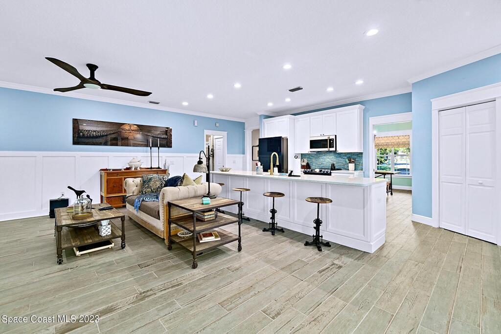 Stunning 4 bedroom 2 bath pool home on navigable canal leading to the Indian River Lagoon! Located at the end of a cul-de-sac on a 0.63 acre lot; this remodeled home features a spacious wraparound porch with water views, detached 2-car garage with new insulated door, new A/C, new wood-look tile throughout, new pool pump for saltwater pool, new gutters, new sprinkler system and more. The completely renovated kitchen boasts quartz counters, soft close cabinets and drawers, high-end appliances, pantry, coffee bar and large center island. Master suite offers large walk-in closet, porch and pool access, luxe bath including double vanities with water view, private toilet and tiled shower. Paddleboard to the river directly from the sizable yard or launch a boat at the community ramp and dock!