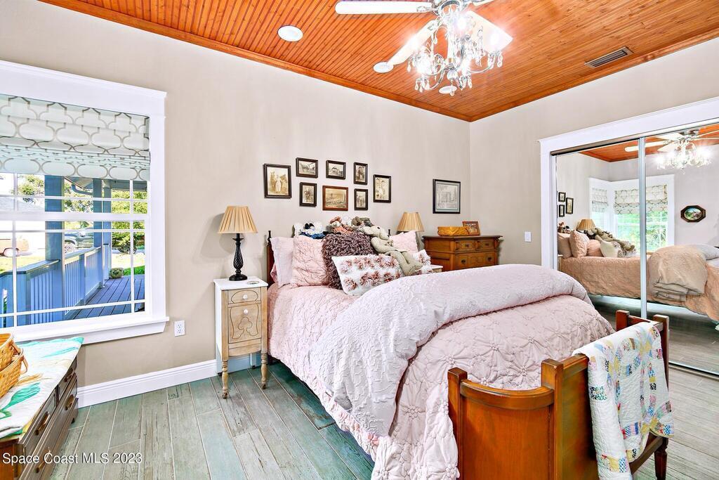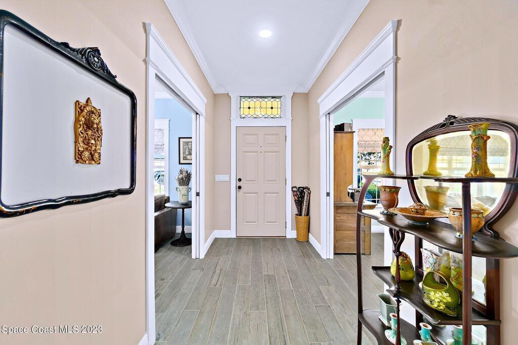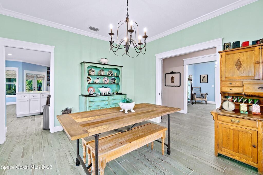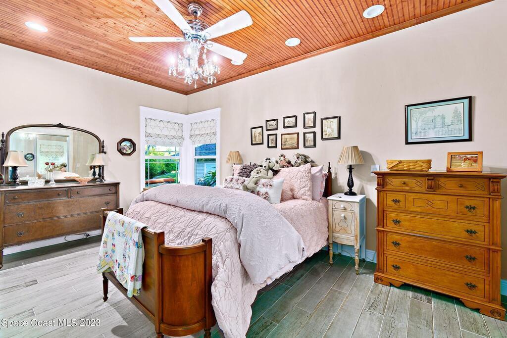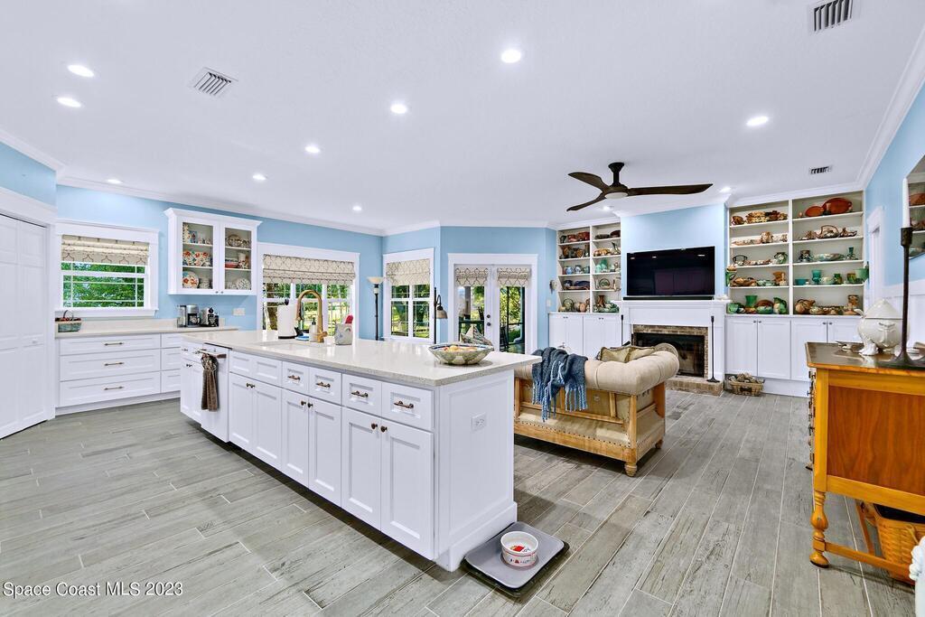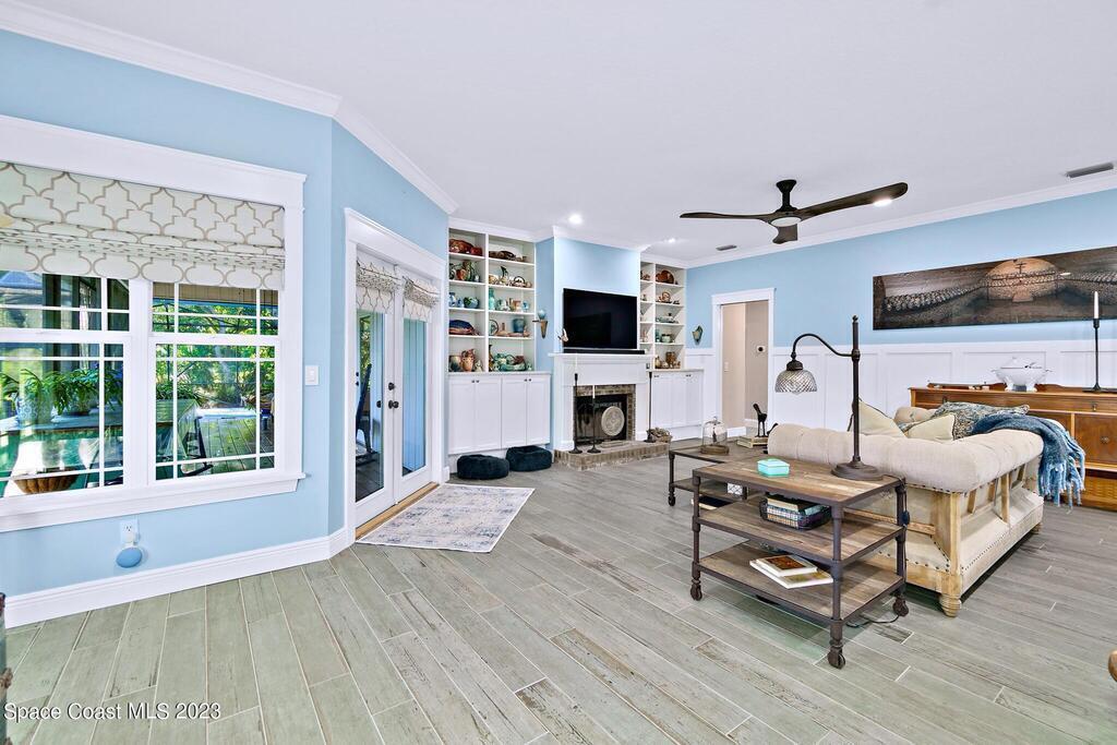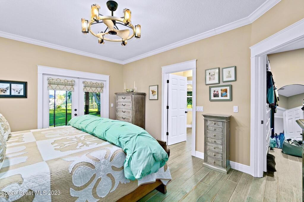 Stunning 4 bedroom 2 bath pool home on navigable canal leading to the Indian River Lagoon! Located at the end of a cul-de-sac on a 0.63 acre lot; this remodeled home features a spacious wraparound porch with water views, detached 2-car garage with new insulated door, new A/C, new wood-look tile throughout, new pool pump for saltwater pool, new gutters, new sprinkler system and more. The completely renovated kitchen boasts quartz counters, soft close cabinets and drawers, high-end appliances, pantry, coffee bar and large center island. Master suite offers large walk-in closet, porch and pool access, luxe bath including double vanities with water view, private toilet and tiled shower. Paddleboard to the river directly from the sizable yard or launch a boat at the community ramp and dock!