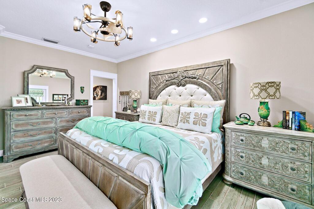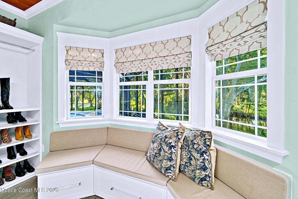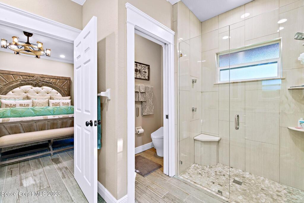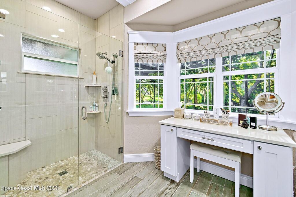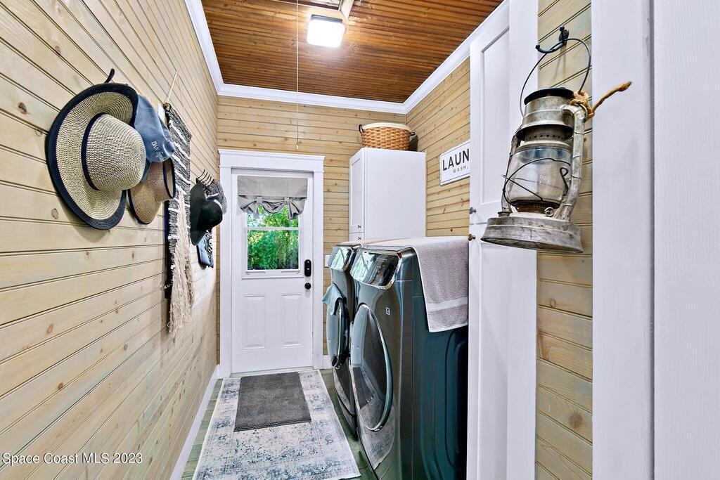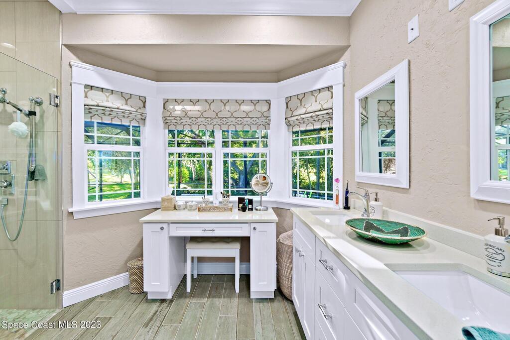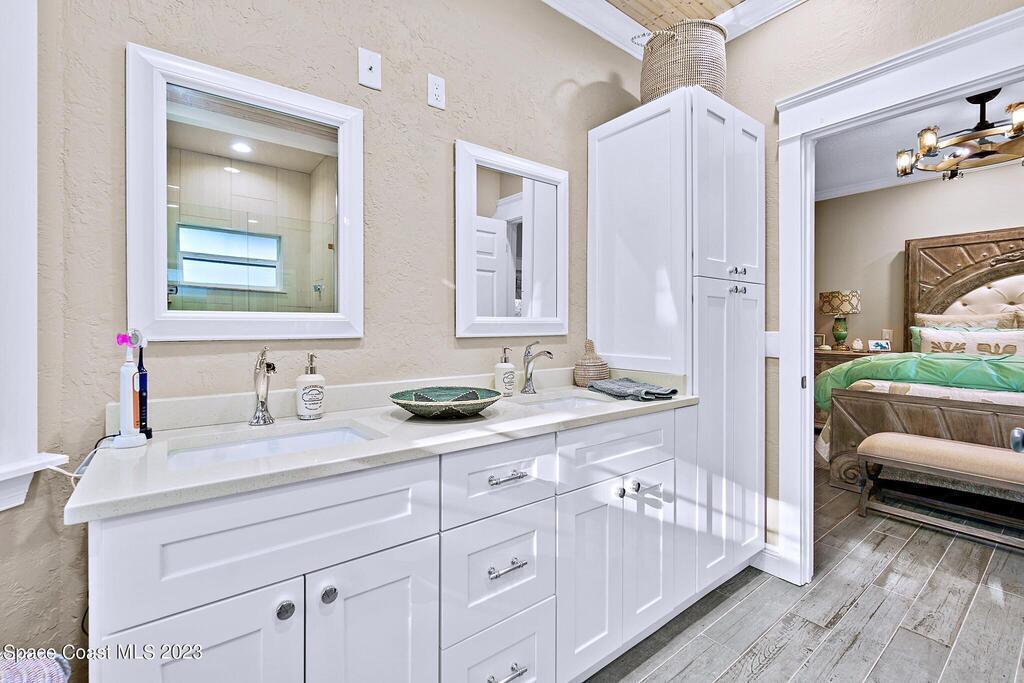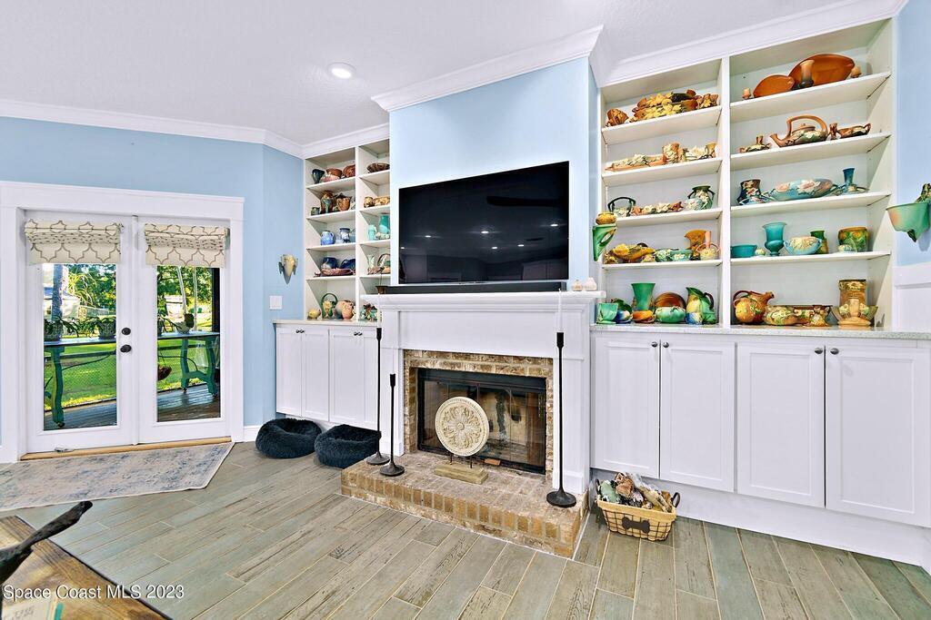 Stunning 4 bedroom 2 bath pool home on navigable canal leading to the Indian River Lagoon! Located at the end of a cul-de-sac on a 0.63 acre lot; this remodeled home features a spacious wraparound porch with water views, detached 2-car garage with new insulated door, new A/C, new wood-look tile throughout, new pool pump for saltwater pool, new gutters, new sprinkler system and more. The completely renovated kitchen boasts quartz counters, soft close cabinets and drawers, high-end appliances, pantry, coffee bar and large center island. Master suite offers large walk-in closet, porch and pool access, luxe bath including double vanities with water view, private toilet and tiled shower. Paddleboard to the river directly from the sizable yard or launch a boat at the community ramp and dock!