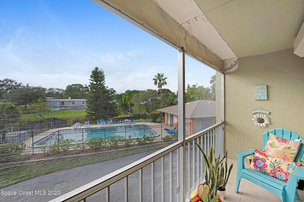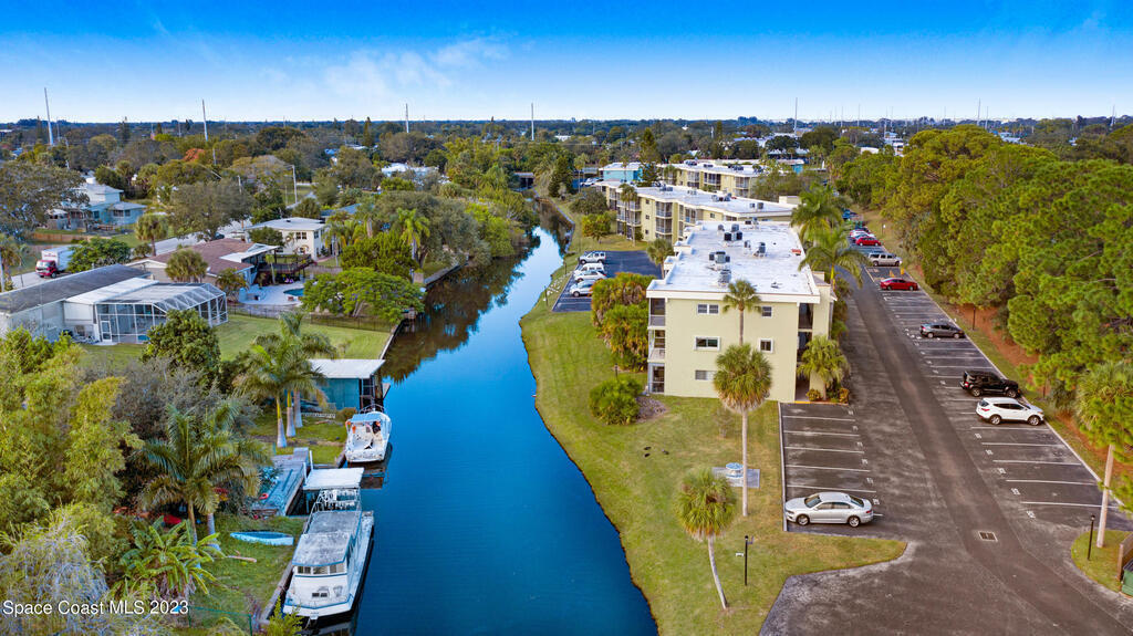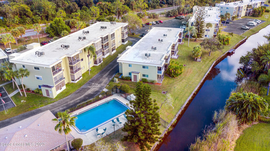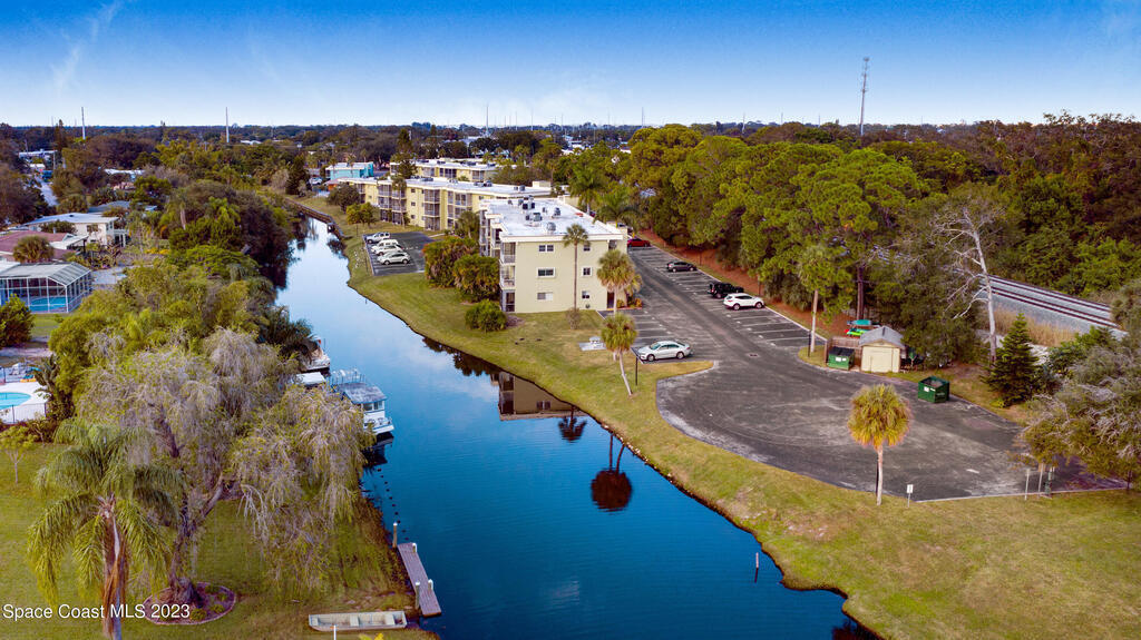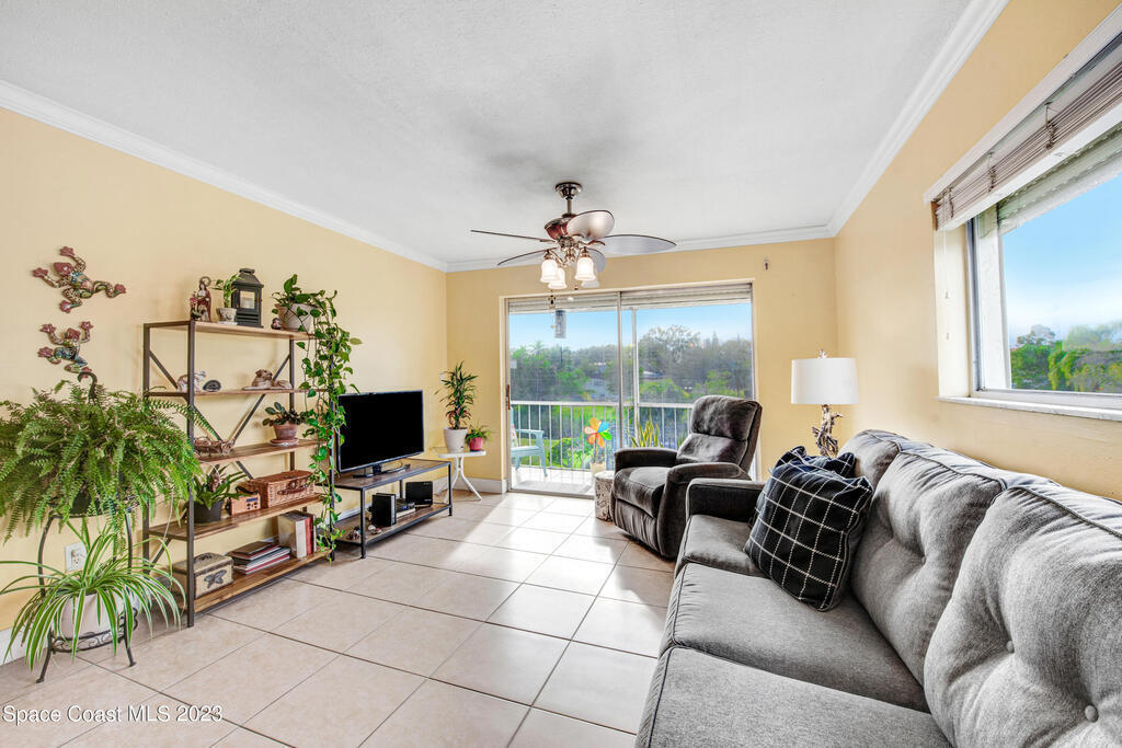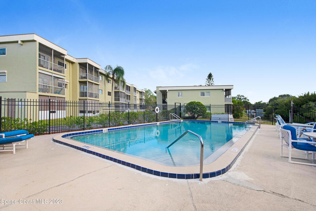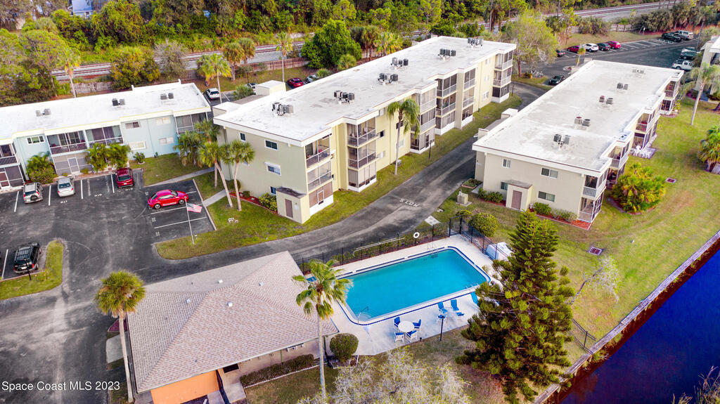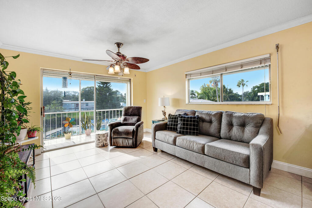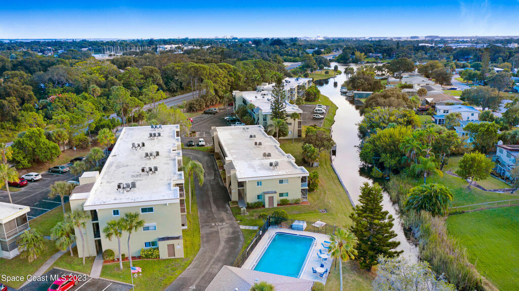This Lovely 1 Bedroom, 1 1/2 Bath end unit condo provides scenic views of the community pool & waterway. Located close to the Clubhouse with just a short walk to the community park & kayak launch & conveniently next to the stairs & the elevator. The white kitchen with beadboard style cabinets & Quartz countertops is modern and stylish and the dishwasher is newer too. Tile runs throughout the condo with a tile wainscot in the bathrooms all are easy-to-maintain & the addition of oversized baseboards & crown molding adds a touch of elegance. Shutters come on all but the East window to provide both privacy & protection from the elements, A/C installed in 2022. The sofa & recliner are negotiable. Close to Beaches, Historic Eau Gallie Arts District & Eau Gallie Causeway