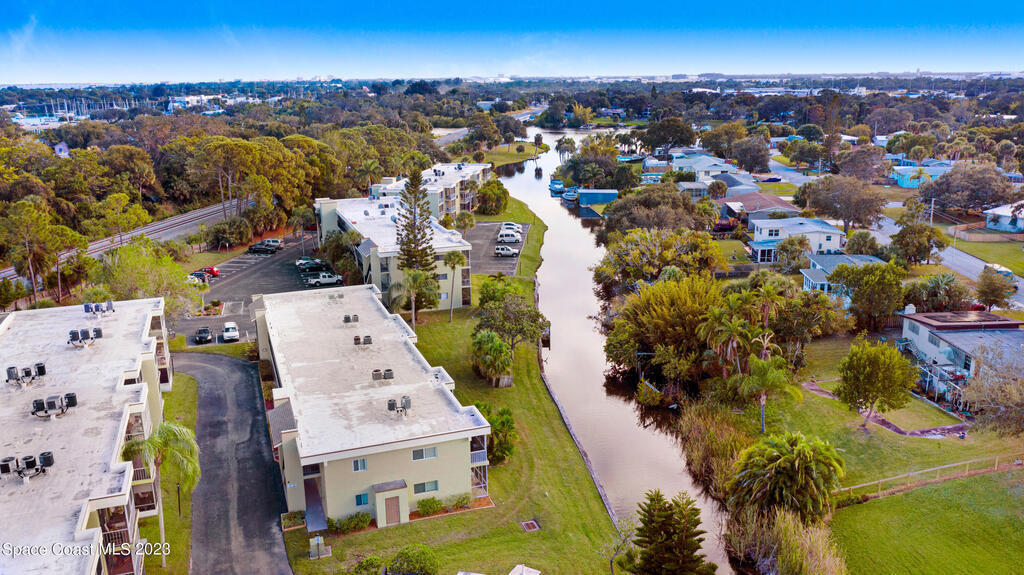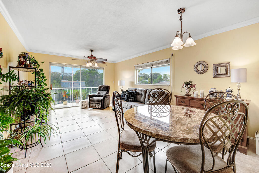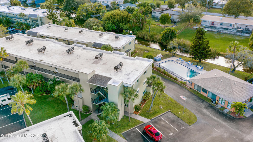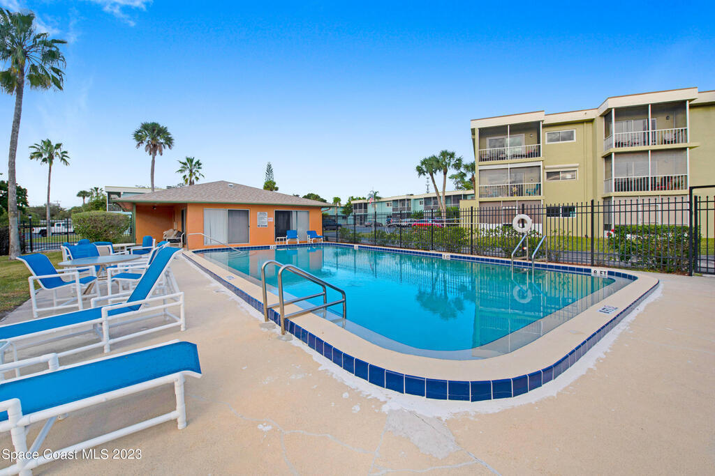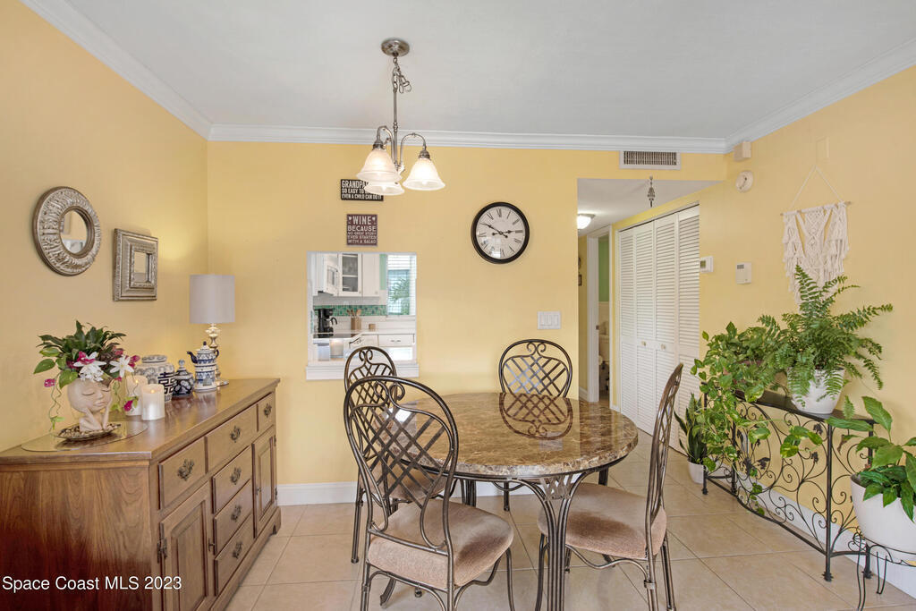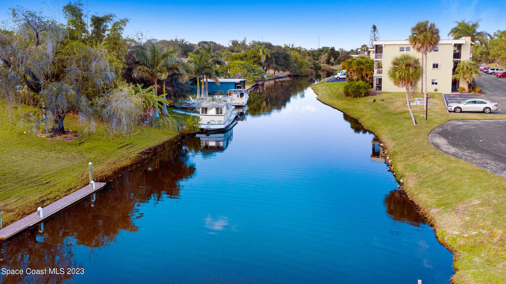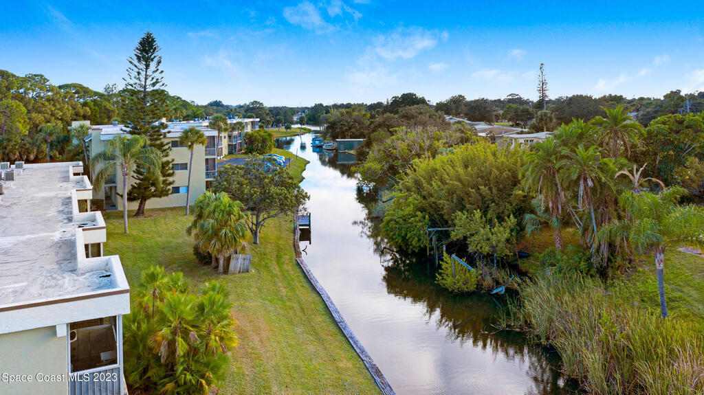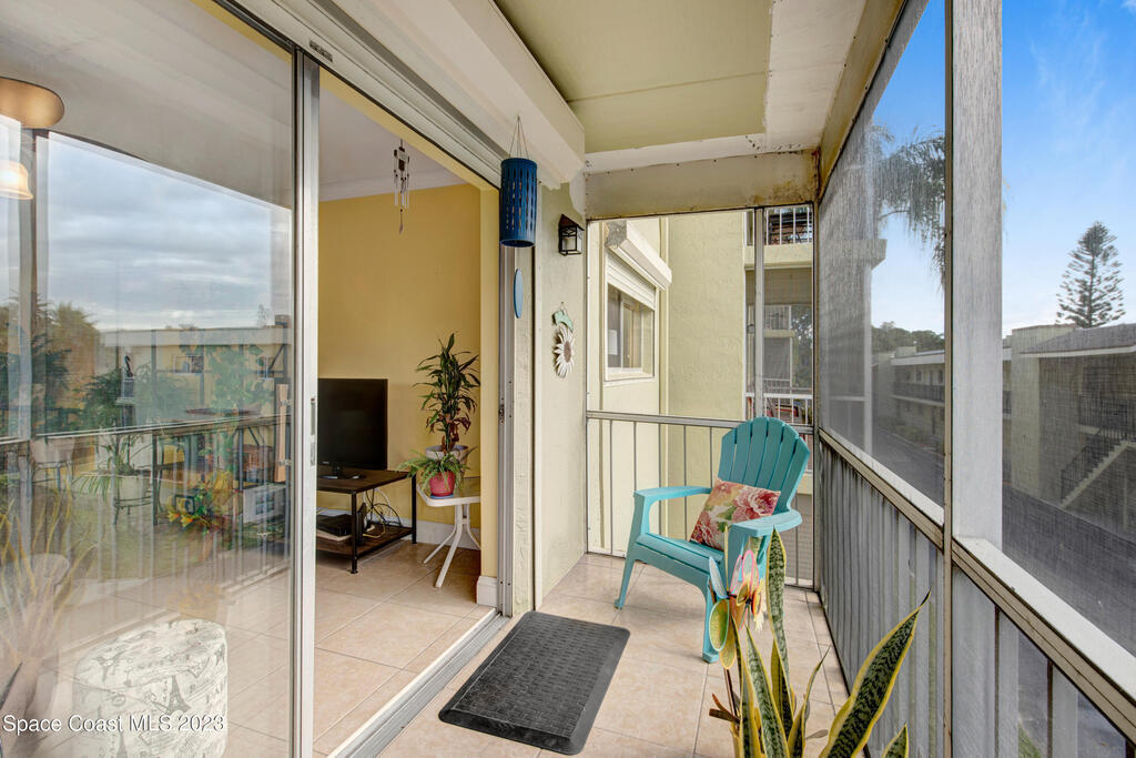 This Lovely 1 Bedroom, 1 1/2 Bath end unit condo provides scenic views of the community pool & waterway. Located close to the Clubhouse with just a short walk to the community park & kayak launch & conveniently next to the stairs & the elevator. The white kitchen with beadboard style cabinets & Quartz countertops is modern and stylish and the dishwasher is newer too. Tile runs throughout the condo with a tile wainscot in the bathrooms all are easy-to-maintain & the addition of oversized baseboards & crown molding adds a touch of elegance. Shutters come on all but the East window to provide both privacy & protection from the elements, A/C installed in 2022. The sofa & recliner are negotiable. Close to Beaches, Historic Eau Gallie Arts District & Eau Gallie Causeway