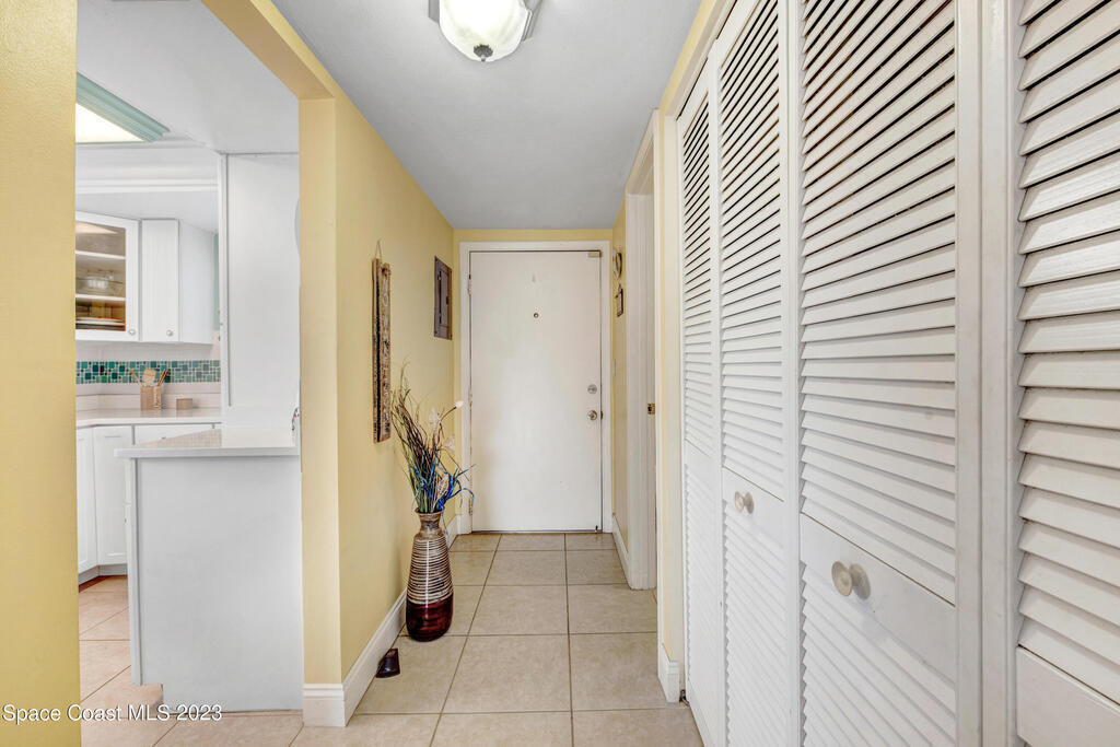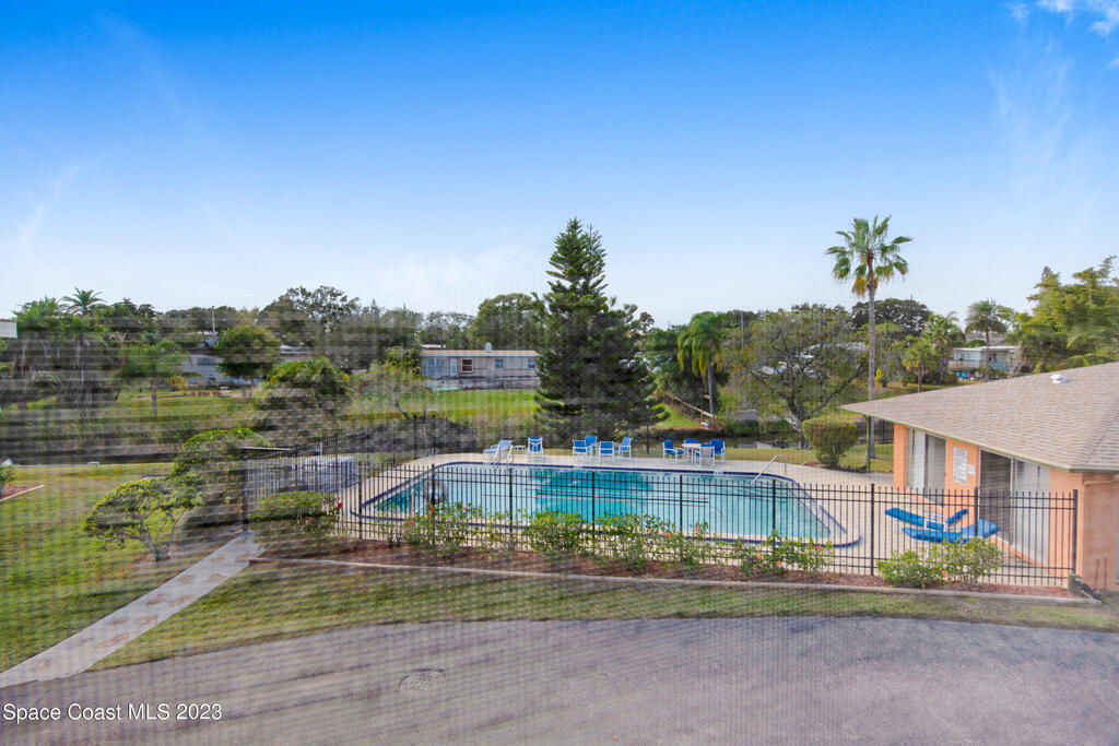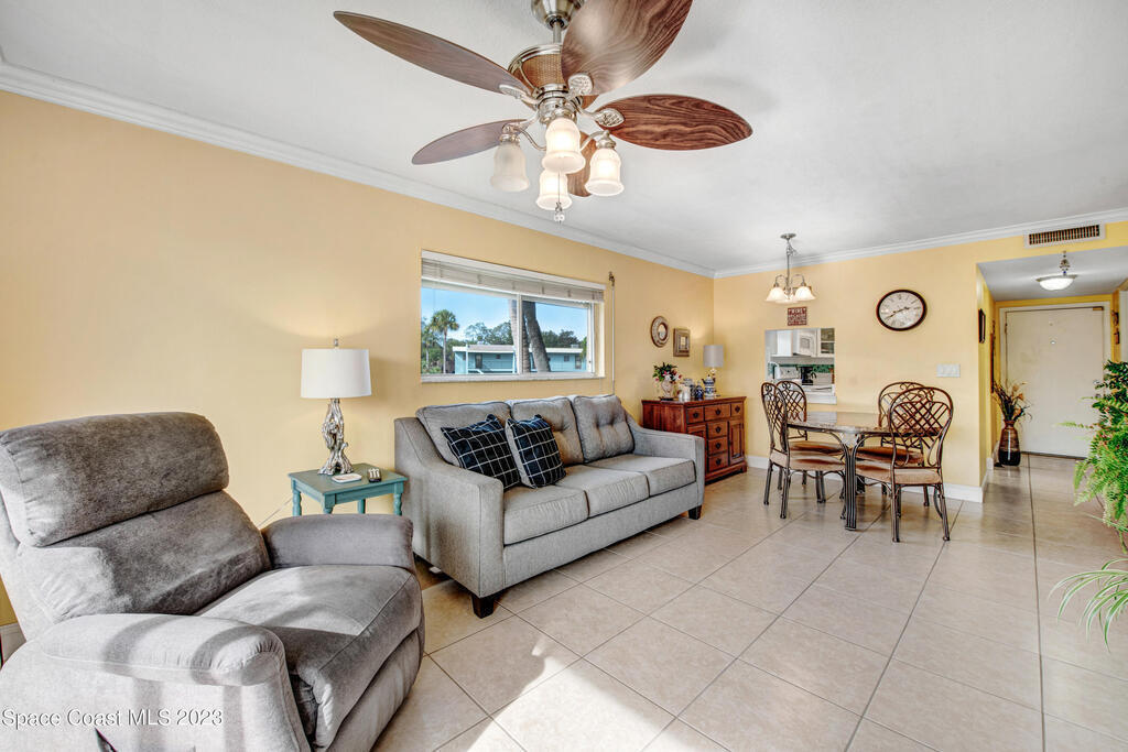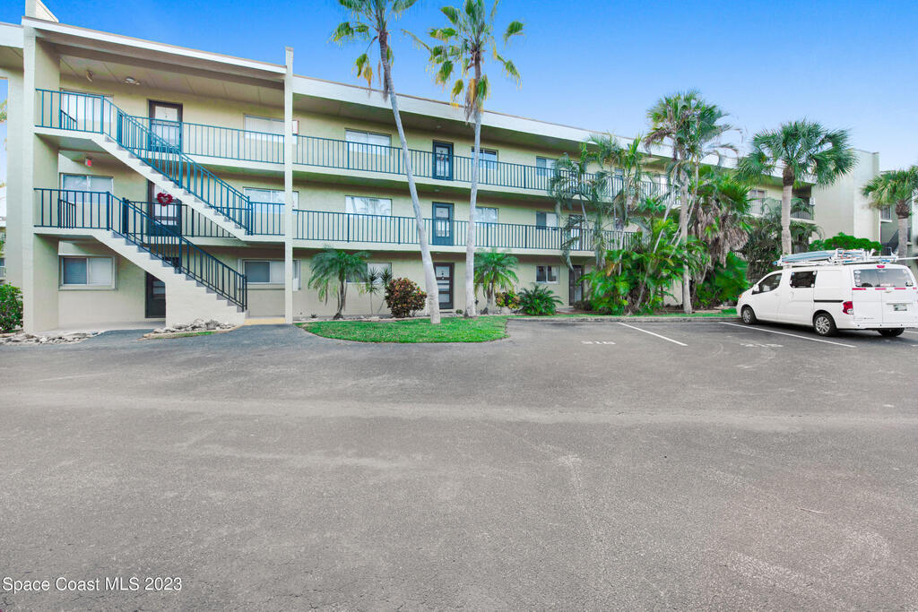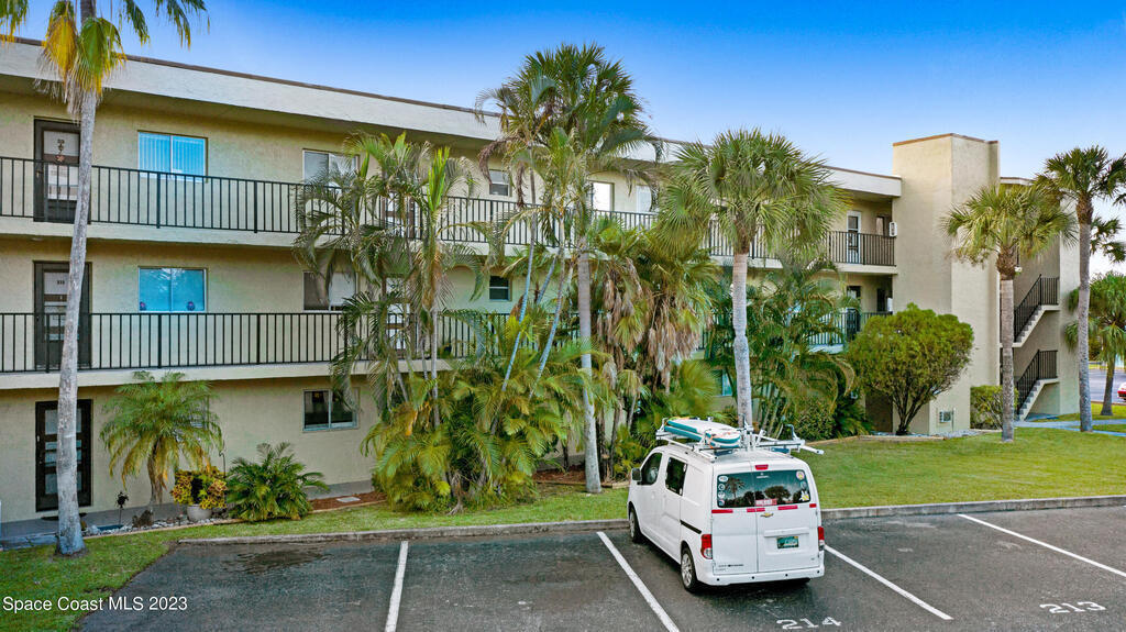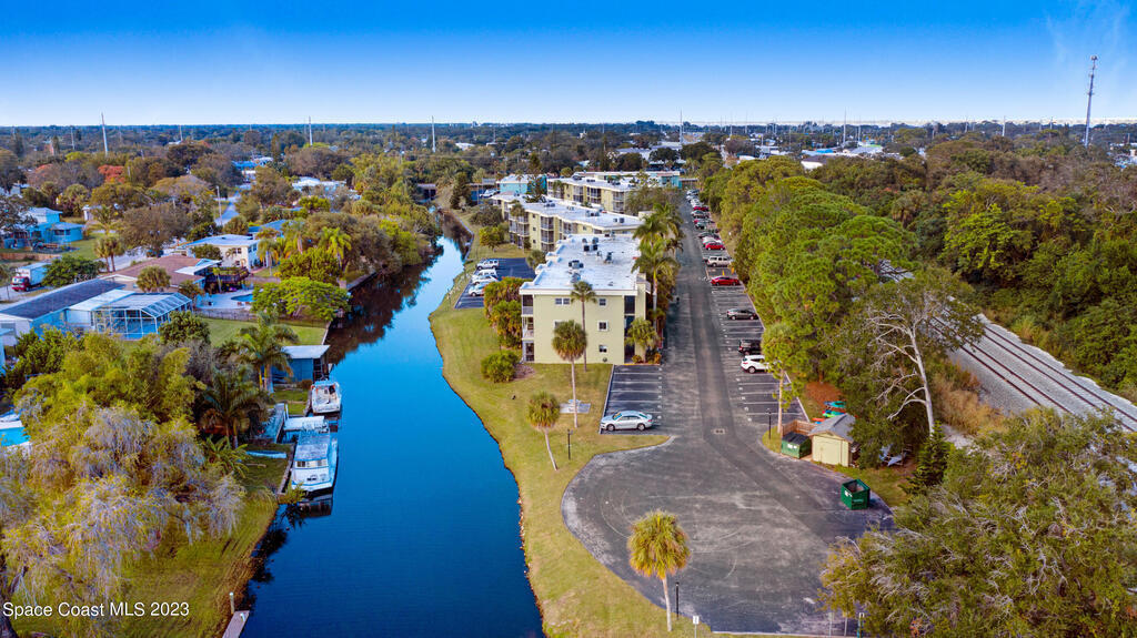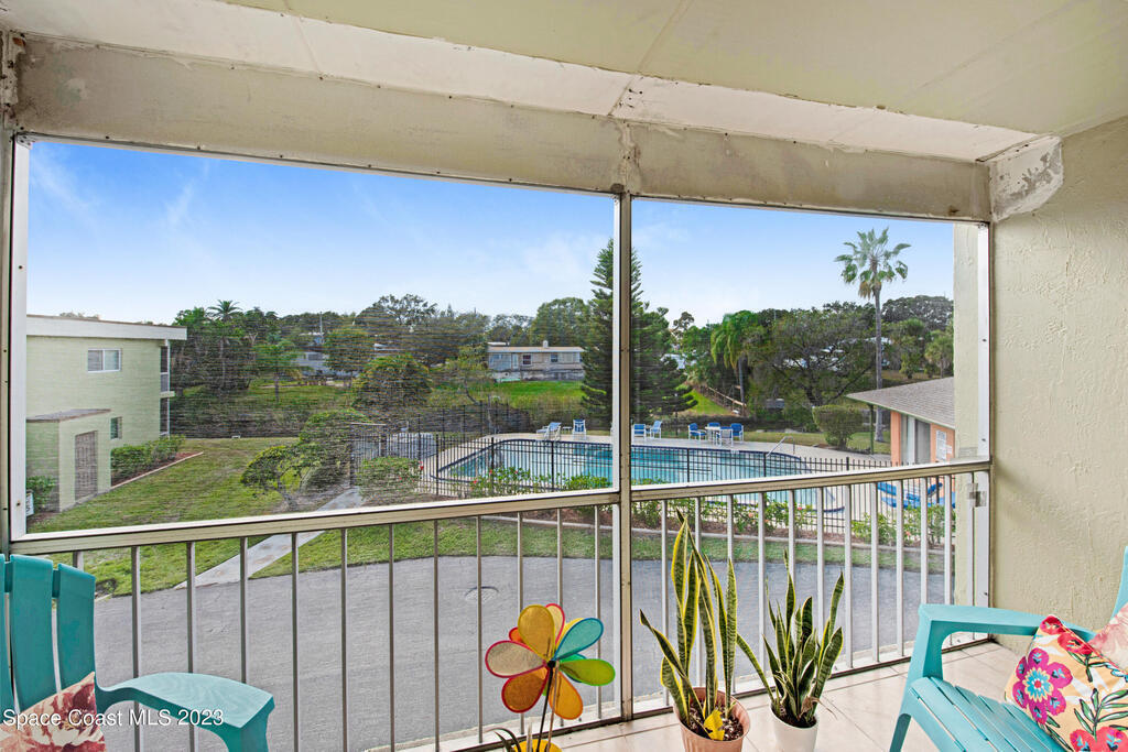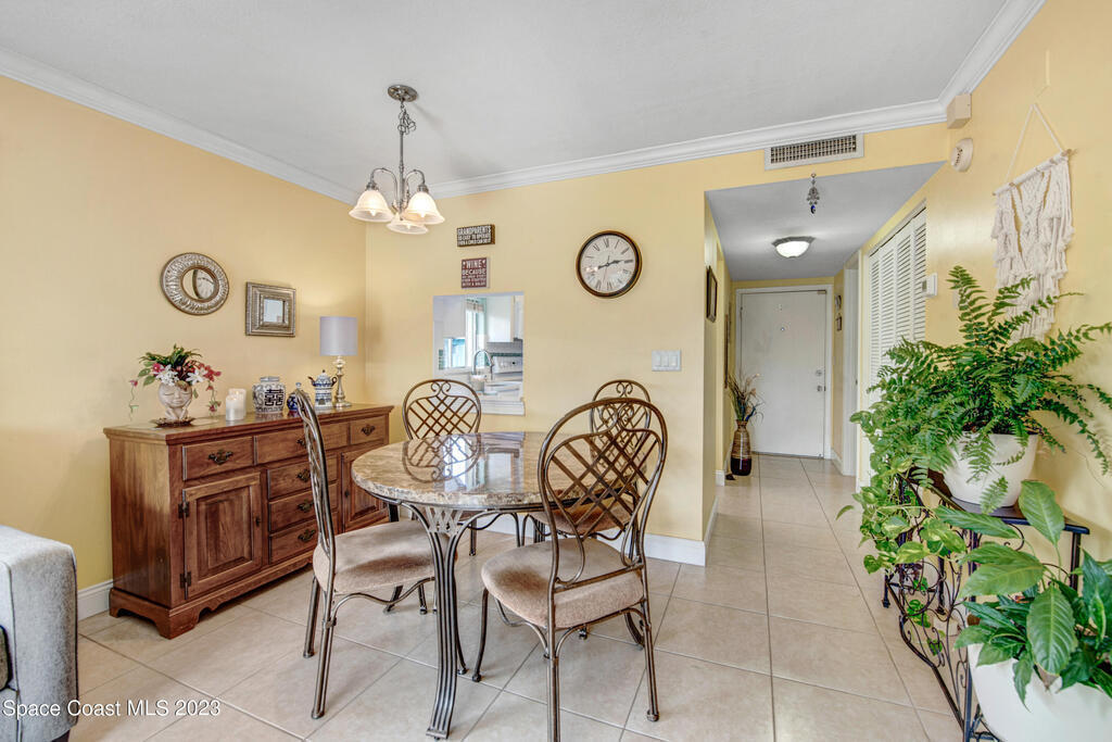 This Lovely 1 Bedroom, 1 1/2 Bath end unit condo provides scenic views of the community pool & waterway. Located close to the Clubhouse with just a short walk to the community park & kayak launch & conveniently next to the stairs & the elevator. The white kitchen with beadboard style cabinets & Quartz countertops is modern and stylish and the dishwasher is newer too. Tile runs throughout the condo with a tile wainscot in the bathrooms all are easy-to-maintain & the addition of oversized baseboards & crown molding adds a touch of elegance. Shutters come on all but the East window to provide both privacy & protection from the elements, A/C installed in 2022. The sofa & recliner are negotiable. Close to Beaches, Historic Eau Gallie Arts District & Eau Gallie Causeway