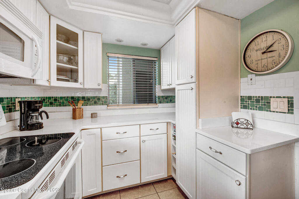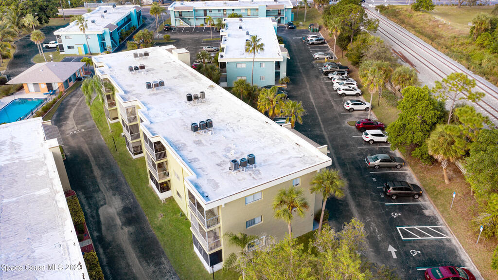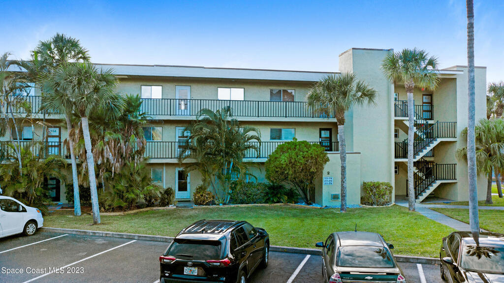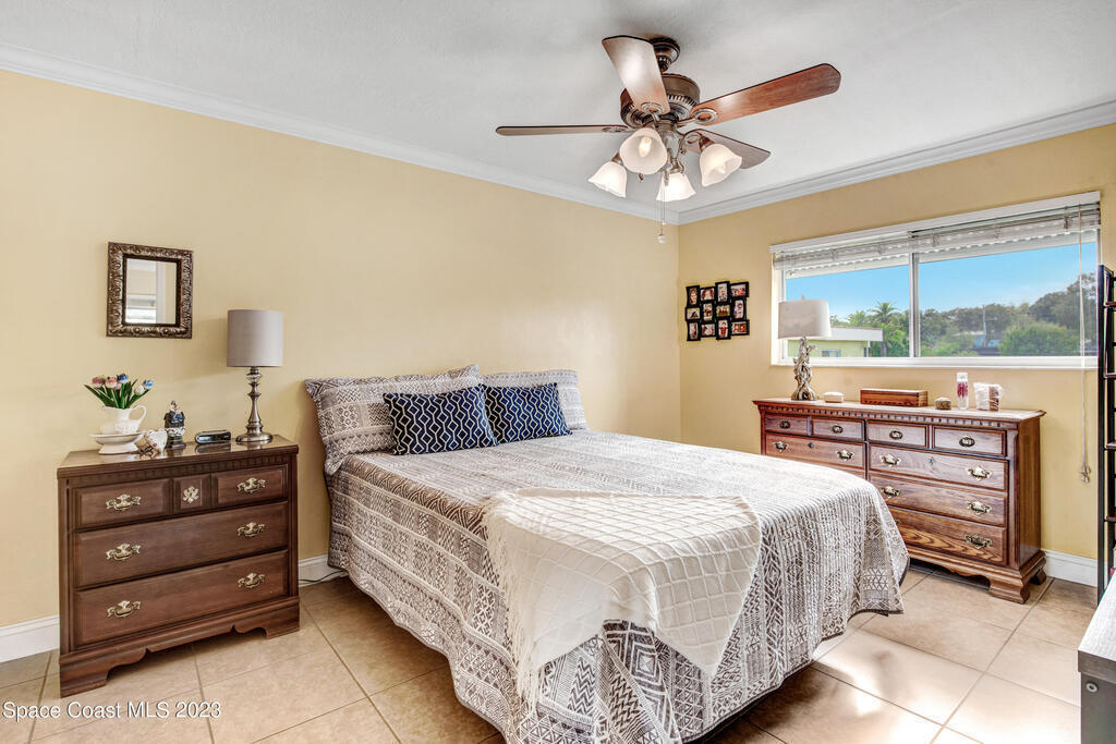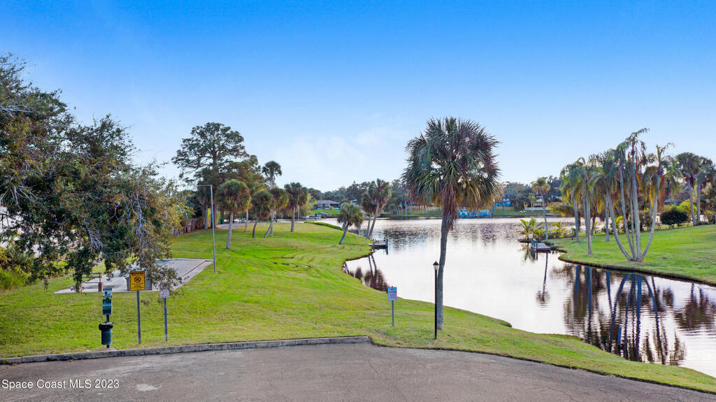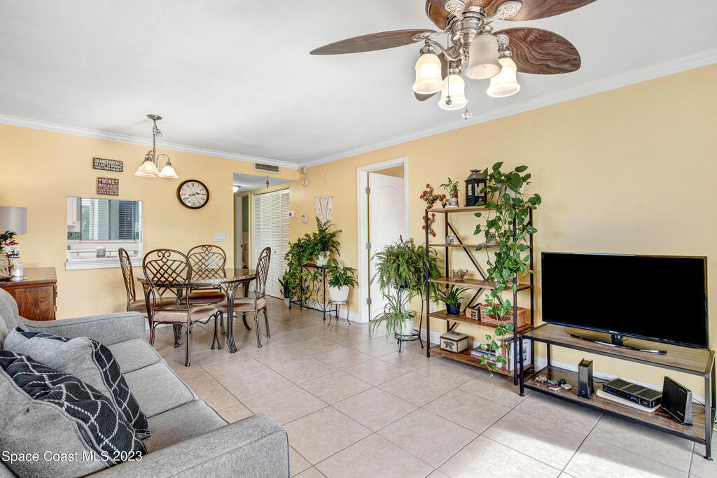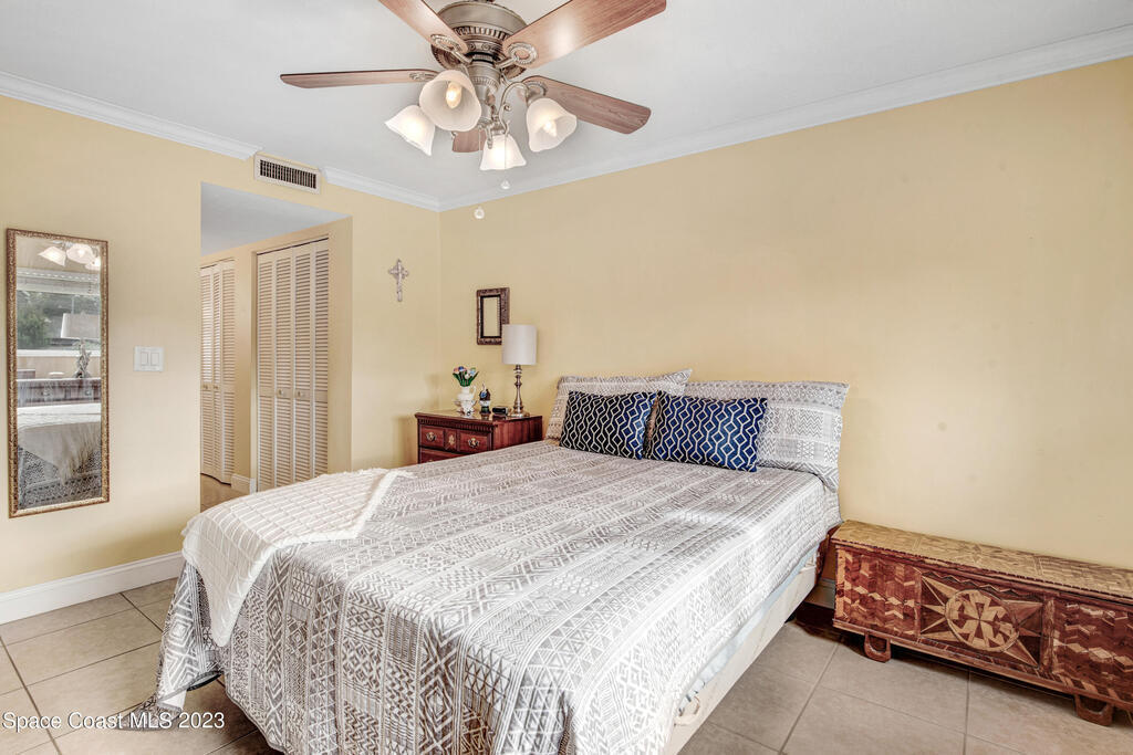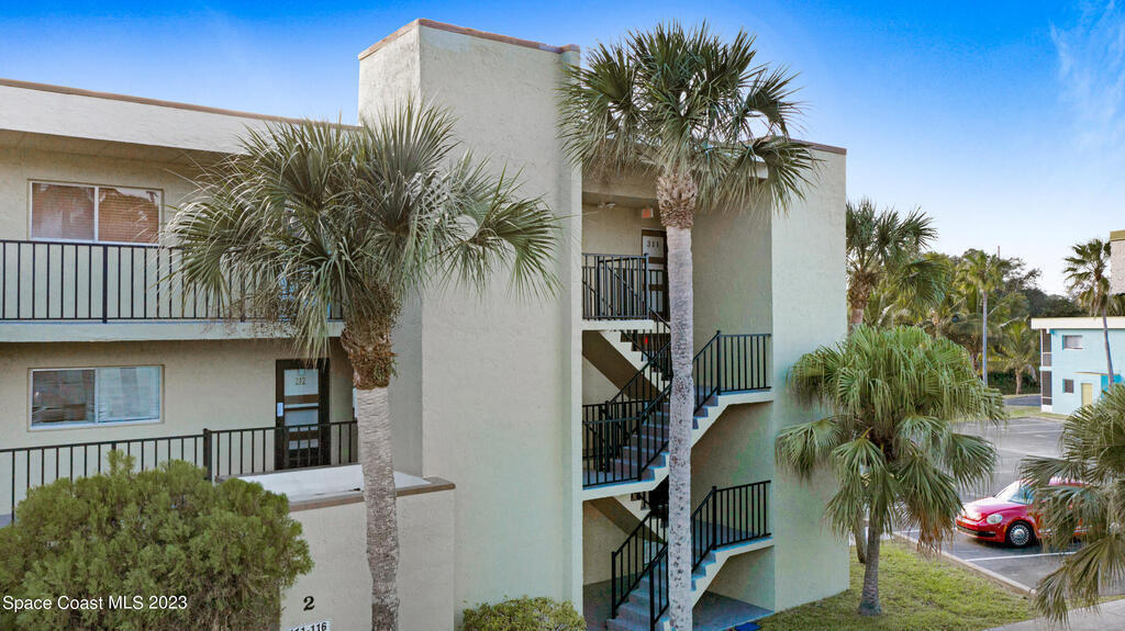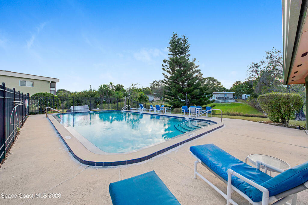 This Lovely 1 Bedroom, 1 1/2 Bath end unit condo provides scenic views of the community pool & waterway. Located close to the Clubhouse with just a short walk to the community park & kayak launch & conveniently next to the stairs & the elevator. The white kitchen with beadboard style cabinets & Quartz countertops is modern and stylish and the dishwasher is newer too. Tile runs throughout the condo with a tile wainscot in the bathrooms all are easy-to-maintain & the addition of oversized baseboards & crown molding adds a touch of elegance. Shutters come on all but the East window to provide both privacy & protection from the elements, A/C installed in 2022. The sofa & recliner are negotiable. Close to Beaches, Historic Eau Gallie Arts District & Eau Gallie Causeway