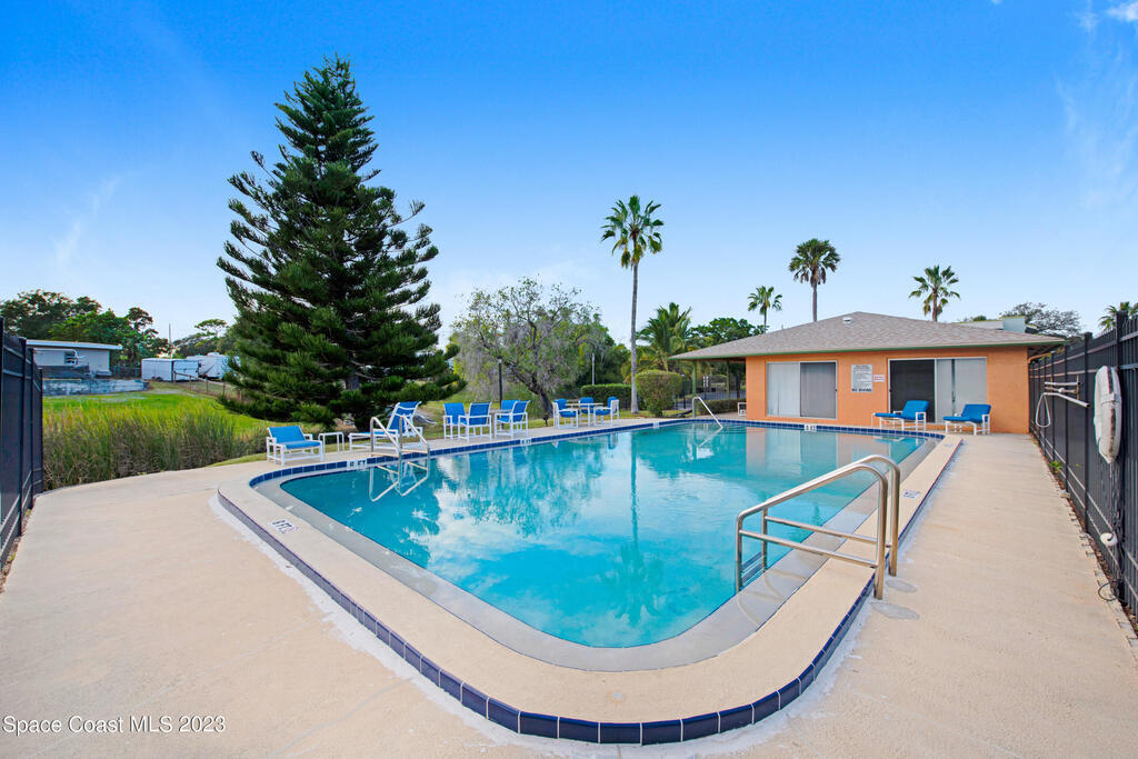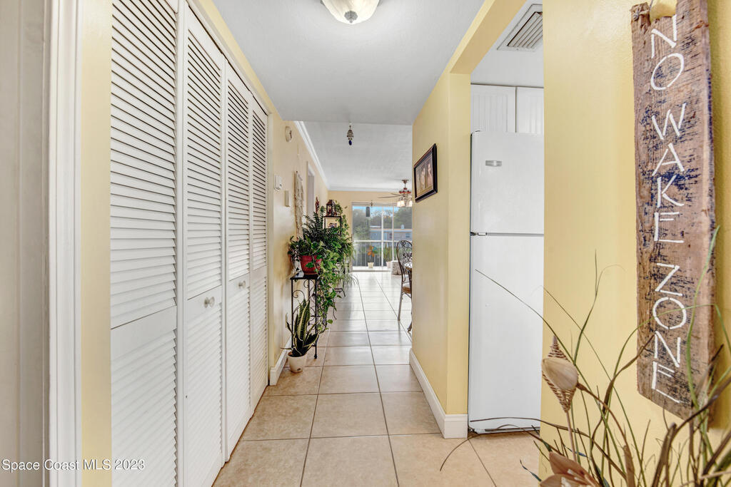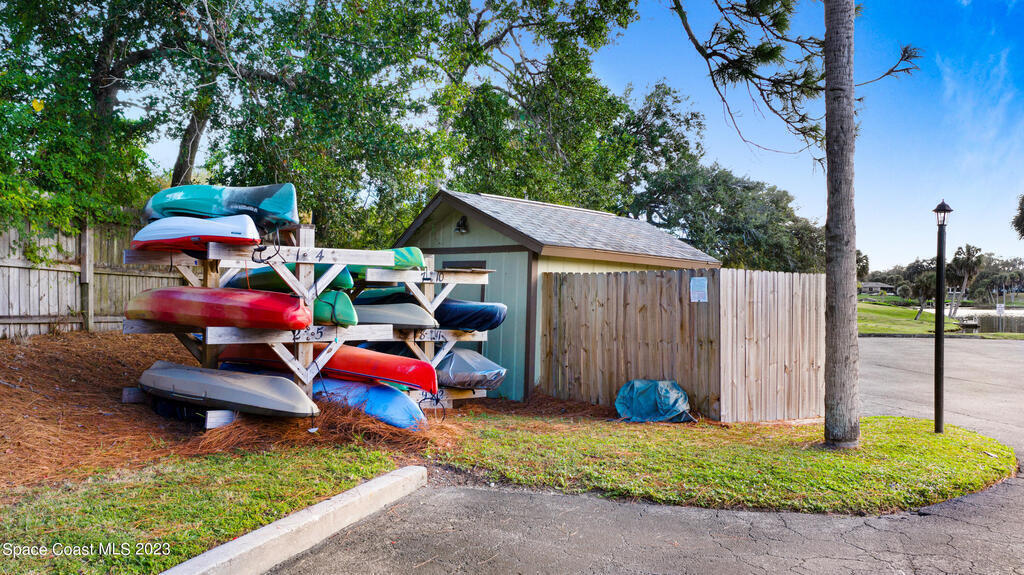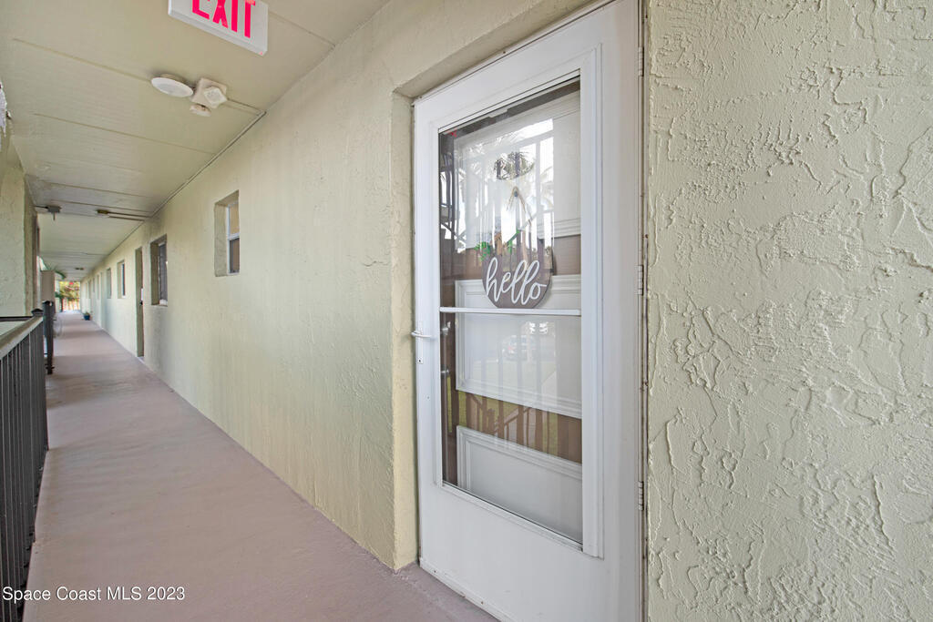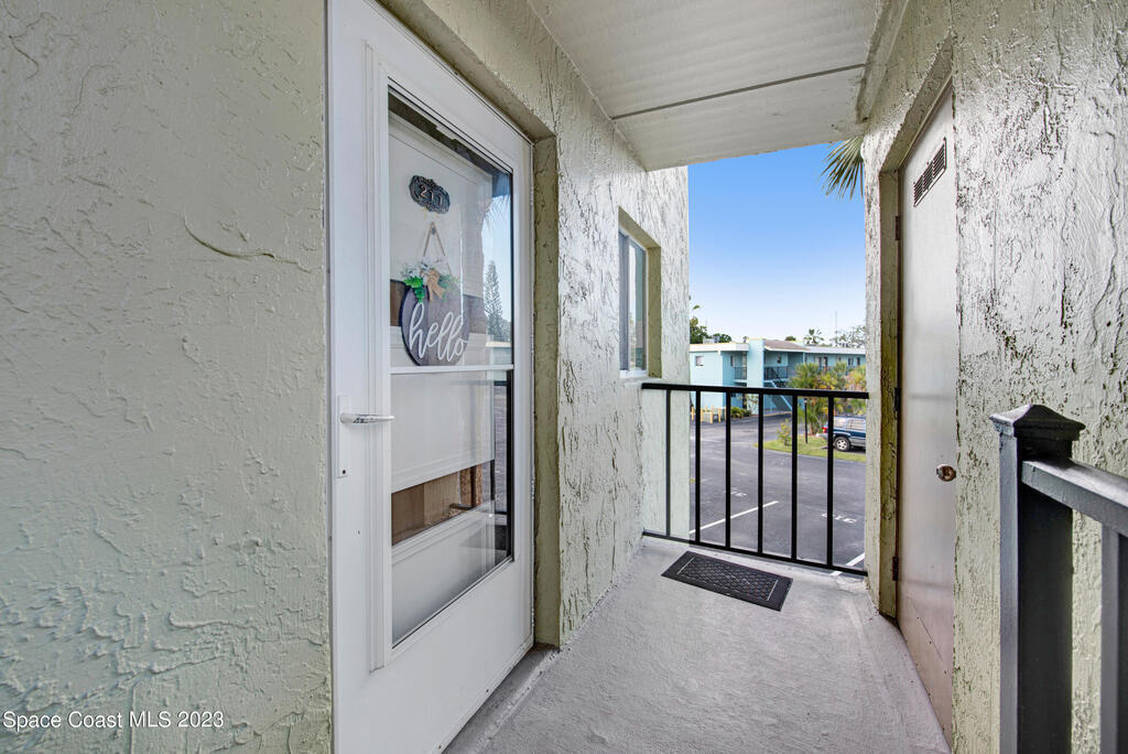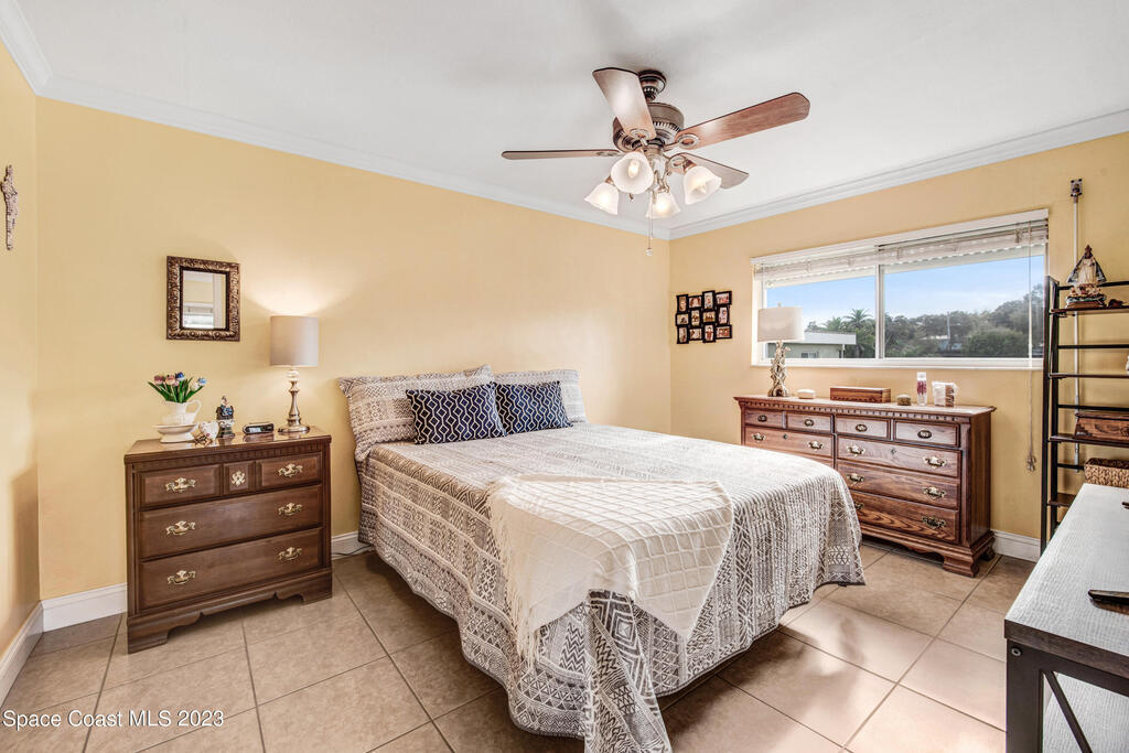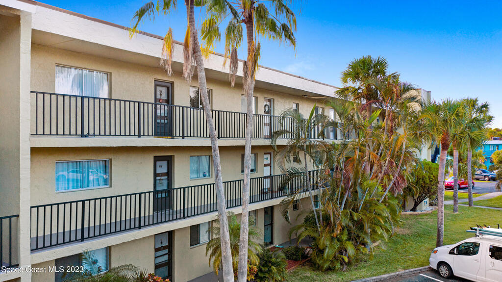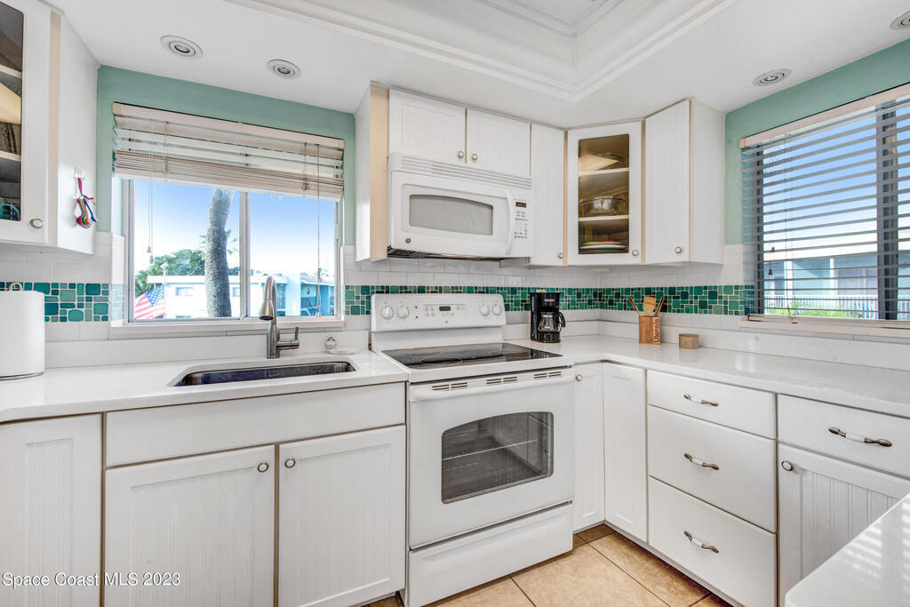 This Lovely 1 Bedroom, 1 1/2 Bath end unit condo provides scenic views of the community pool & waterway. Located close to the Clubhouse with just a short walk to the community park & kayak launch & conveniently next to the stairs & the elevator. The white kitchen with beadboard style cabinets & Quartz countertops is modern and stylish and the dishwasher is newer too. Tile runs throughout the condo with a tile wainscot in the bathrooms all are easy-to-maintain & the addition of oversized baseboards & crown molding adds a touch of elegance. Shutters come on all but the East window to provide both privacy & protection from the elements, A/C installed in 2022. The sofa & recliner are negotiable. Close to Beaches, Historic Eau Gallie Arts District & Eau Gallie Causeway