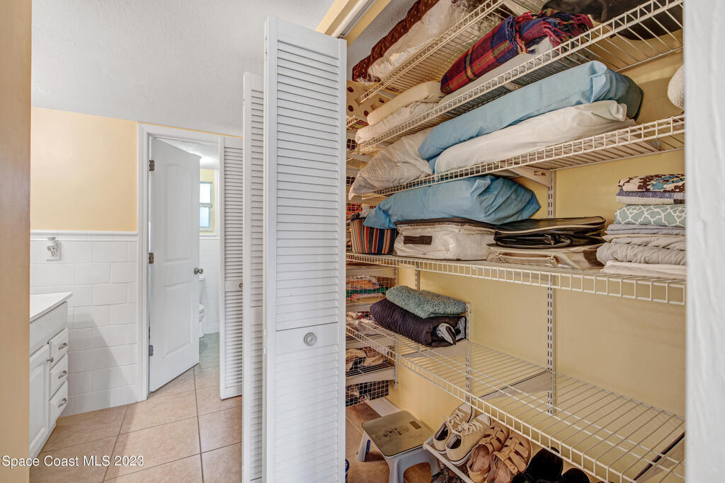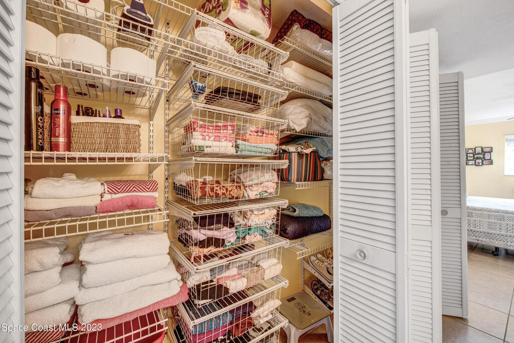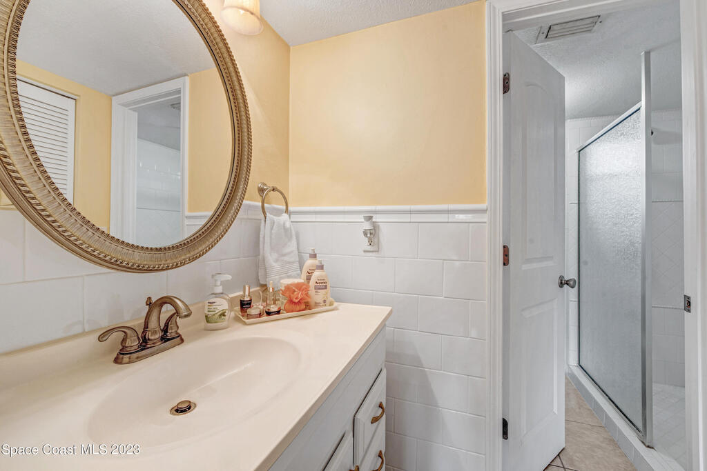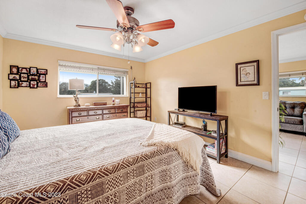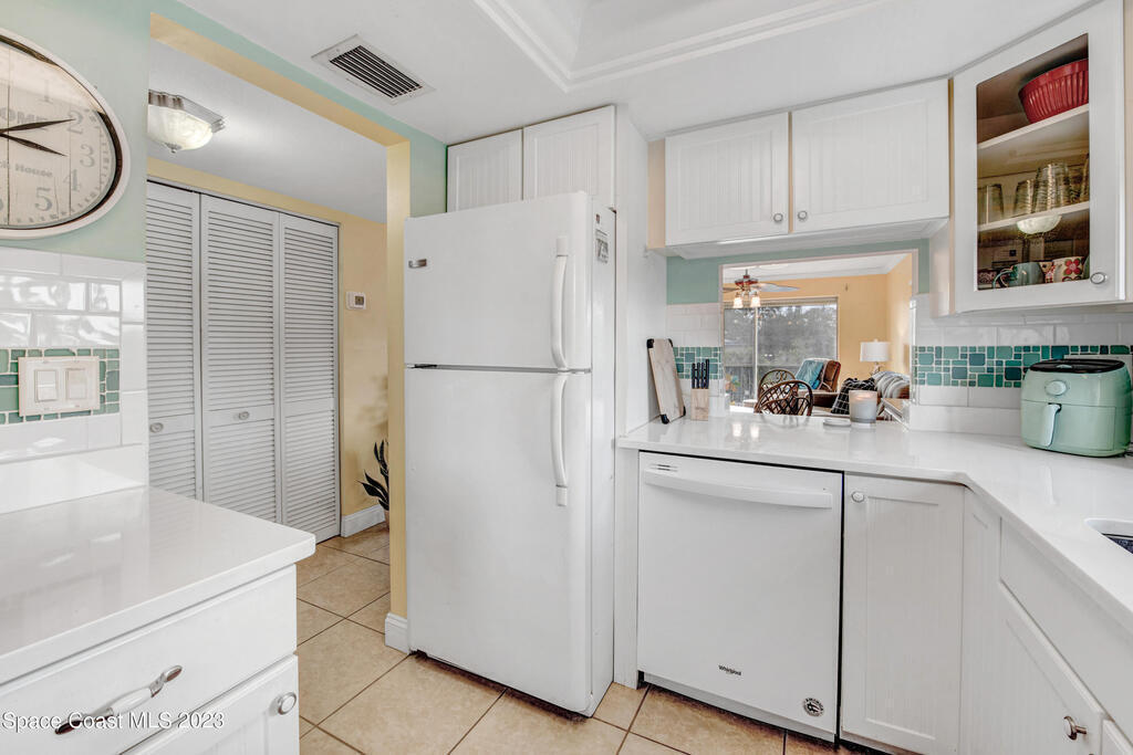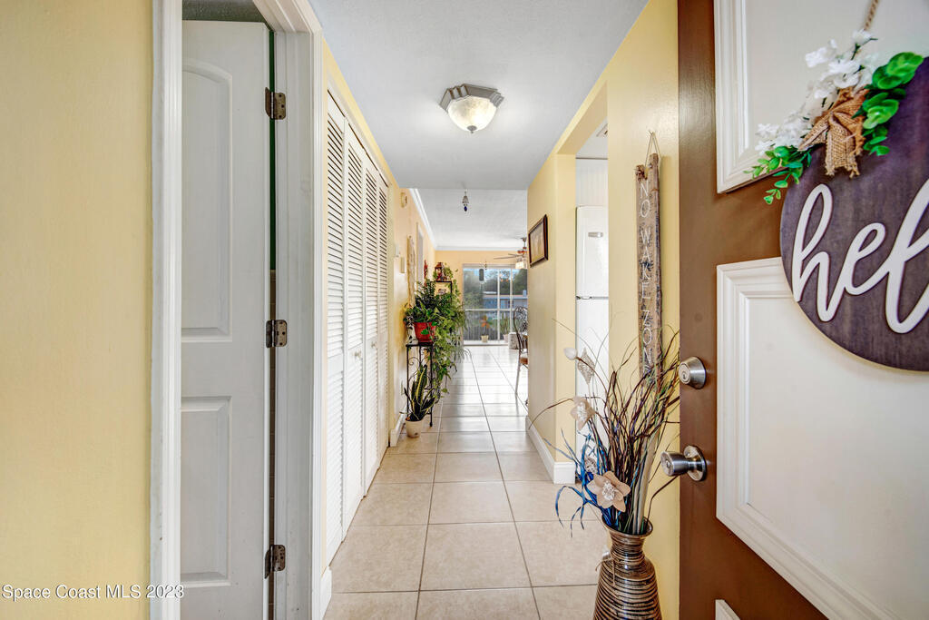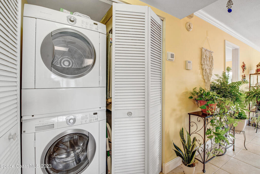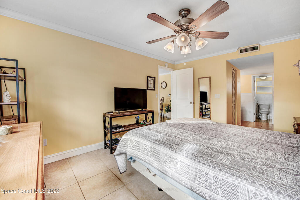 This Lovely 1 Bedroom, 1 1/2 Bath end unit condo provides scenic views of the community pool & waterway. Located close to the Clubhouse with just a short walk to the community park & kayak launch & conveniently next to the stairs & the elevator. The white kitchen with beadboard style cabinets & Quartz countertops is modern and stylish and the dishwasher is newer too. Tile runs throughout the condo with a tile wainscot in the bathrooms all are easy-to-maintain & the addition of oversized baseboards & crown molding adds a touch of elegance. Shutters come on all but the East window to provide both privacy & protection from the elements, A/C installed in 2022. The sofa & recliner are negotiable. Close to Beaches, Historic Eau Gallie Arts District & Eau Gallie Causeway