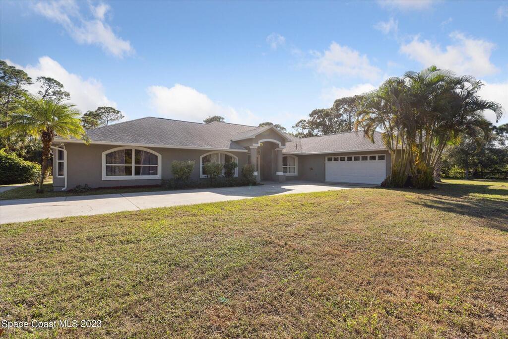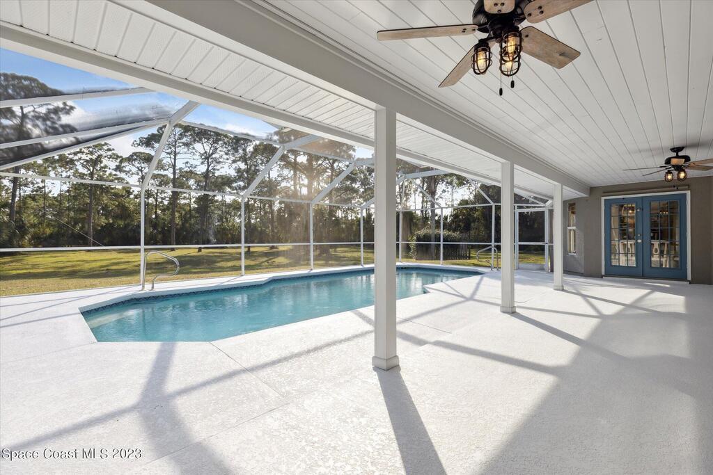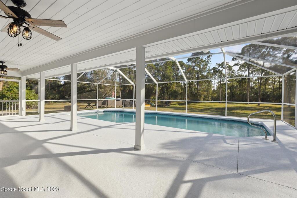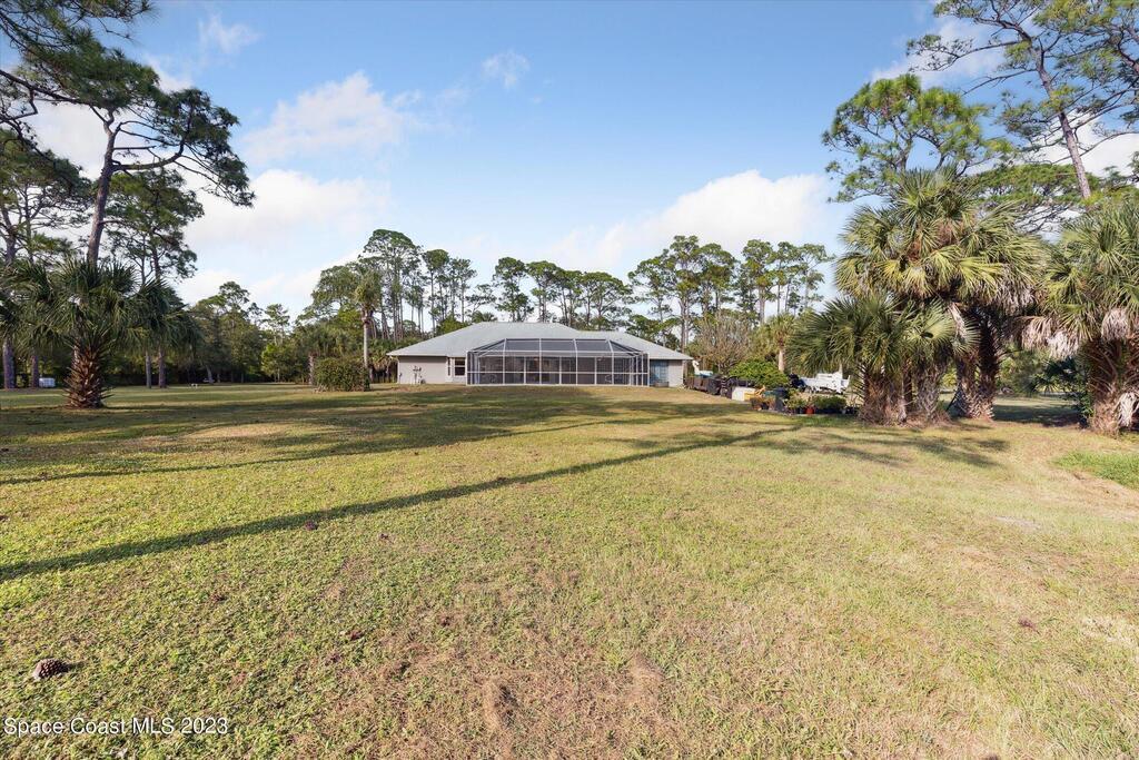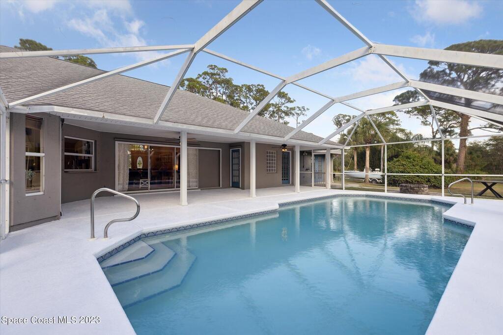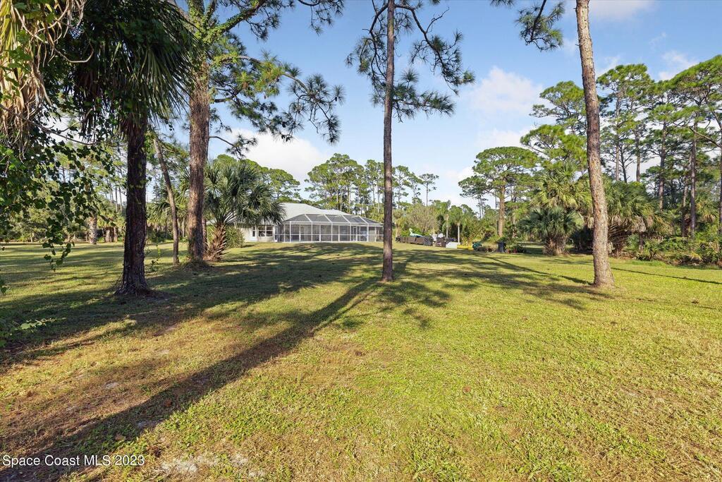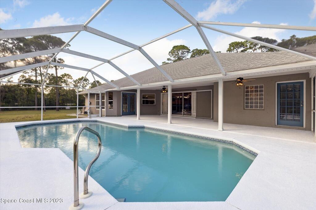 Price Reduced. Motivated Sellers, Bring Offers! Country living- bring your horses and boat! This 4 bedroom, 3 bathroom house sits on 3 acres in Grant with ample privacy. One mile from the Indian River and a quick drive to I-95. NO HOA! New exterior paint and gutters just completed. New roof in 2019, New AC in 2020, well pump replaced in 2022, and New Water Softener System in 2023.Screened in pool with newly installed tongue & groove ceilings allow for relaxation as you overlook the back 2 acres. Kitchen has plenty of storage with a breakfast nook. Separate Formal dining and living room. On the east side of the house is a large Master Suite or Mother-in-Law Suite. This has a separate entrance for convenience. Built-in garage shelving. Priced to sell this house will not last!