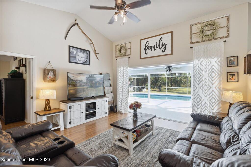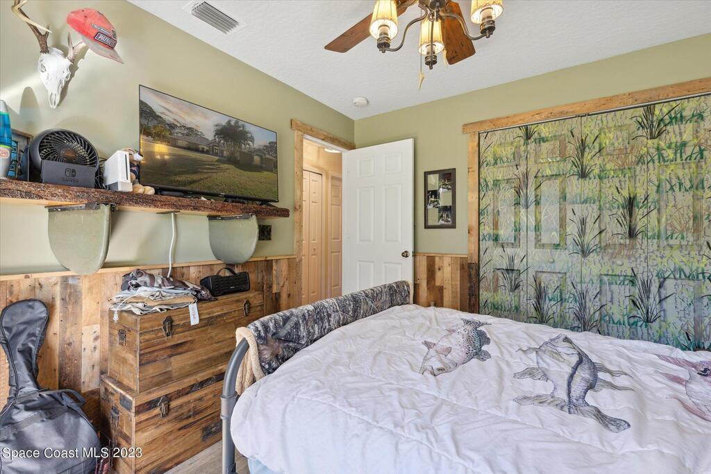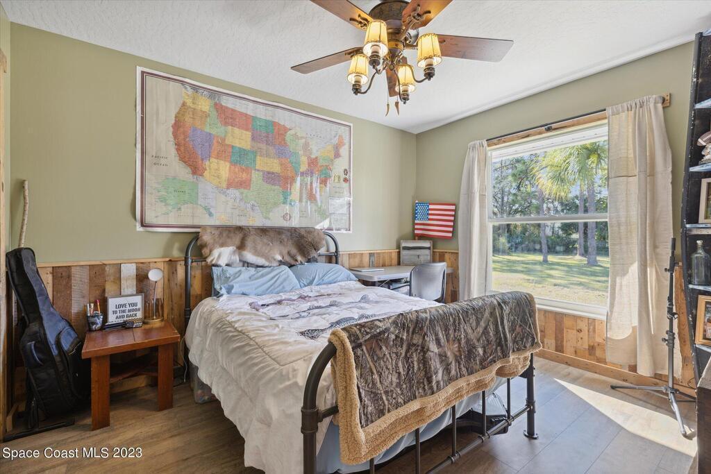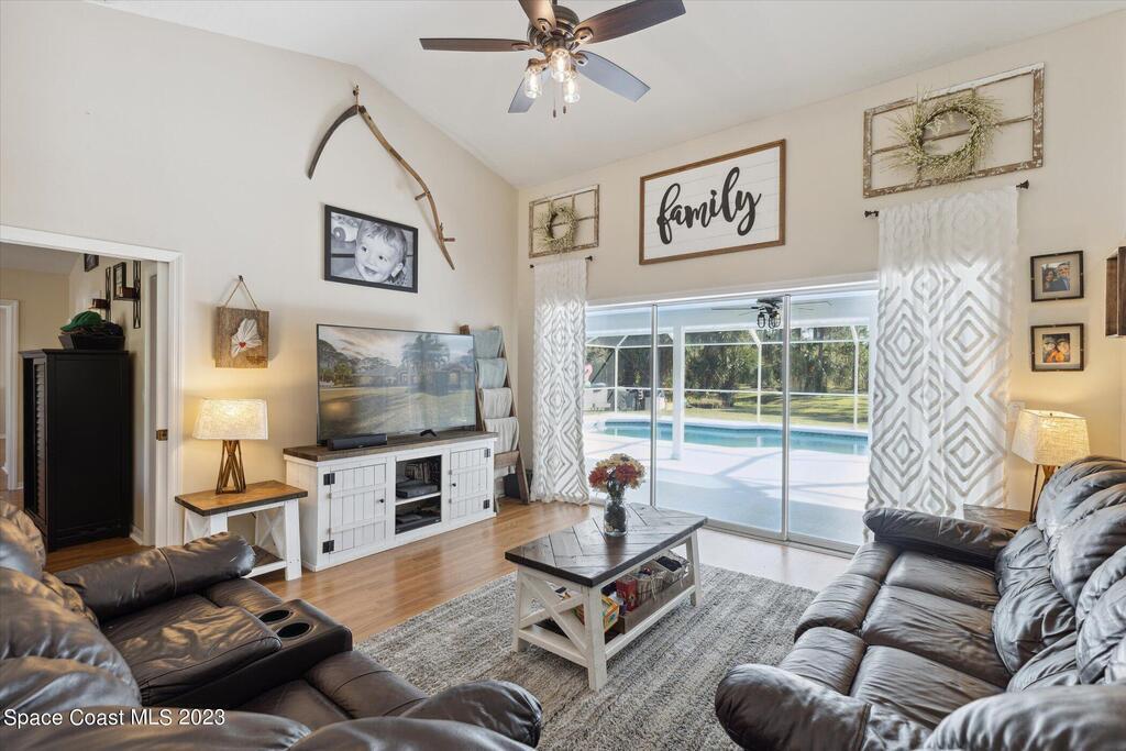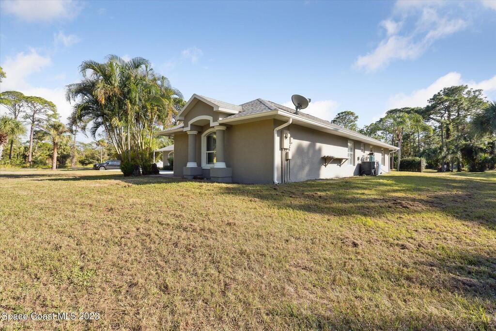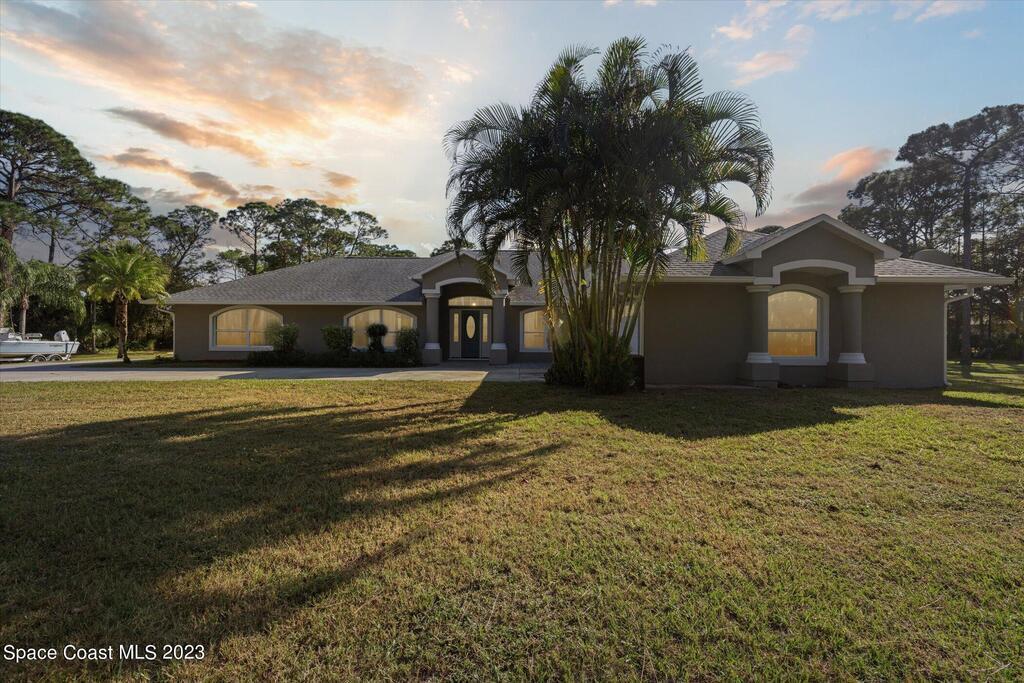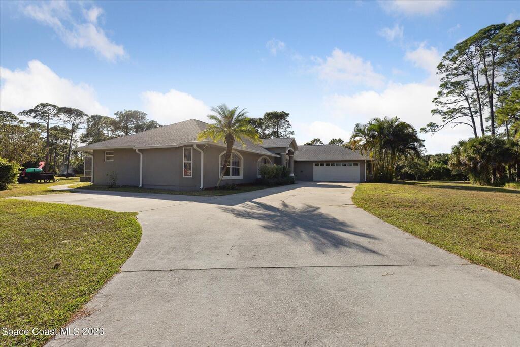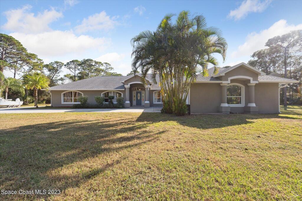 Price Reduced. Motivated Sellers, Bring Offers! Country living- bring your horses and boat! This 4 bedroom, 3 bathroom house sits on 3 acres in Grant with ample privacy. One mile from the Indian River and a quick drive to I-95. NO HOA! New exterior paint and gutters just completed. New roof in 2019, New AC in 2020, well pump replaced in 2022, and New Water Softener System in 2023.Screened in pool with newly installed tongue & groove ceilings allow for relaxation as you overlook the back 2 acres. Kitchen has plenty of storage with a breakfast nook. Separate Formal dining and living room. On the east side of the house is a large Master Suite or Mother-in-Law Suite. This has a separate entrance for convenience. Built-in garage shelving. Priced to sell this house will not last!