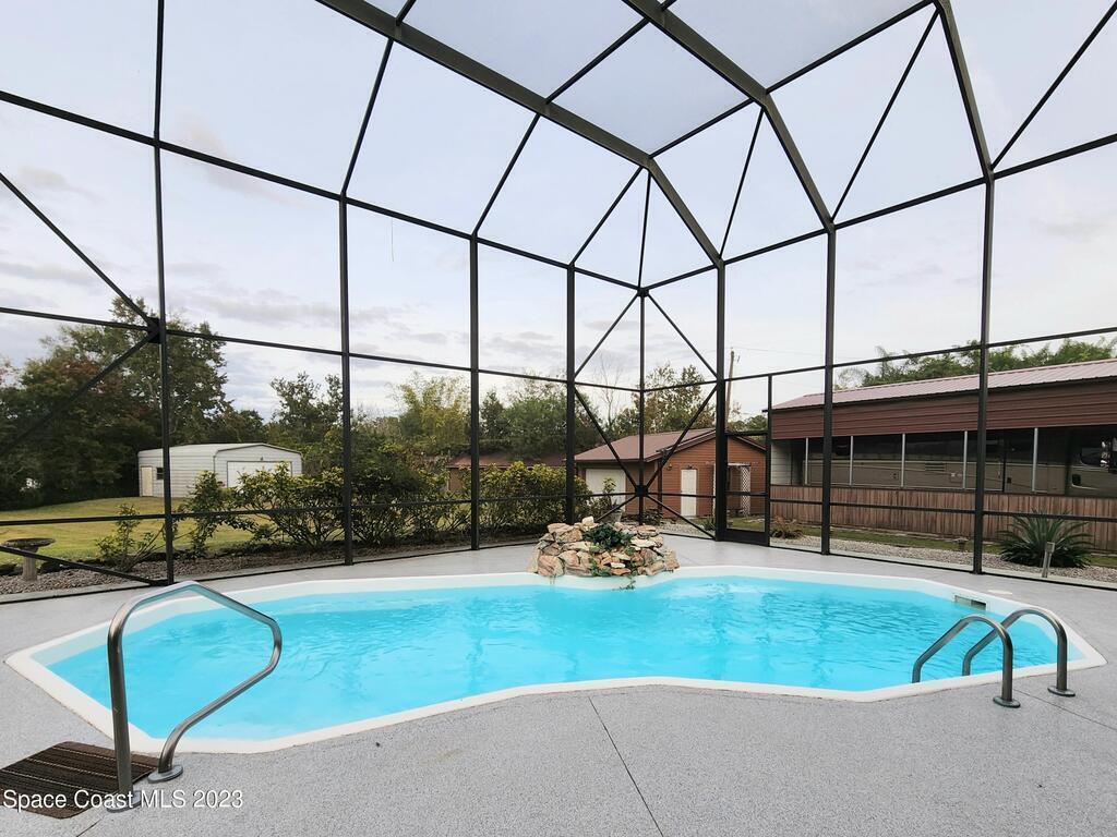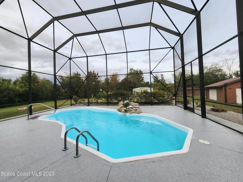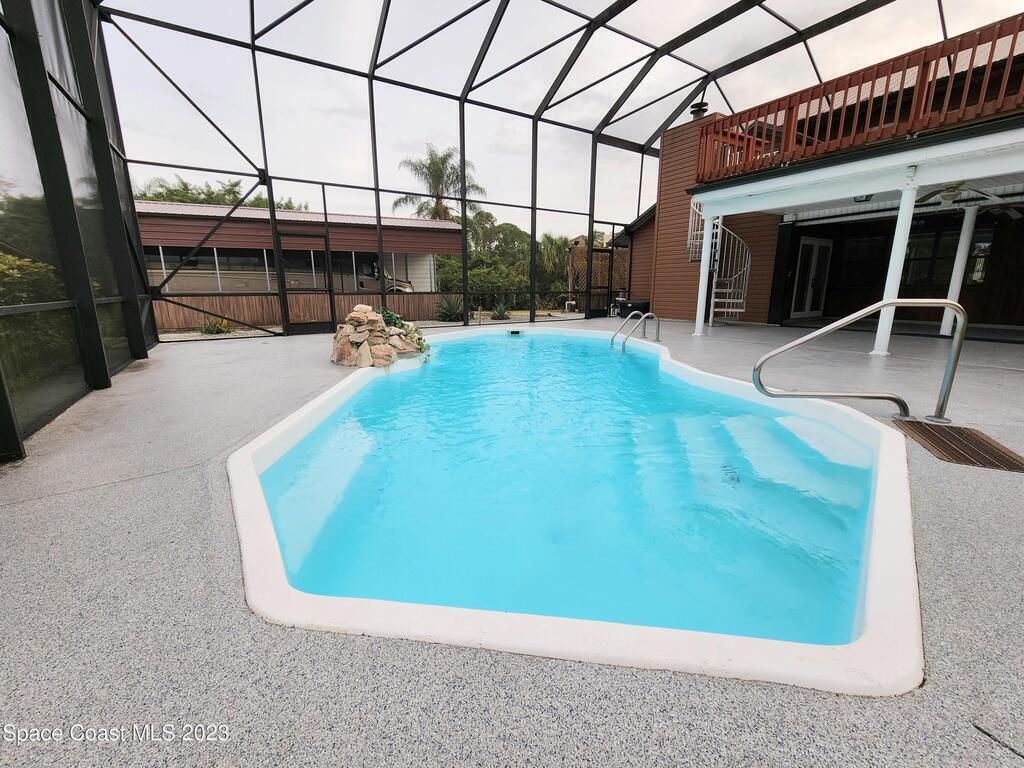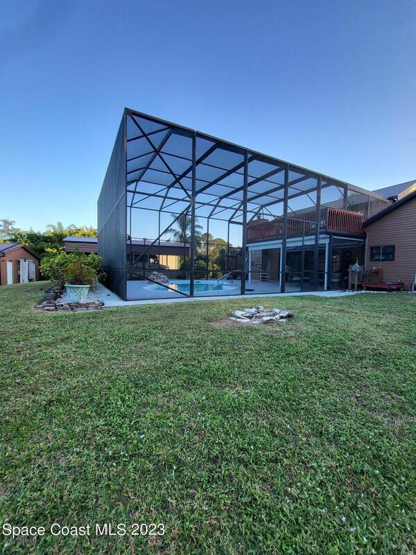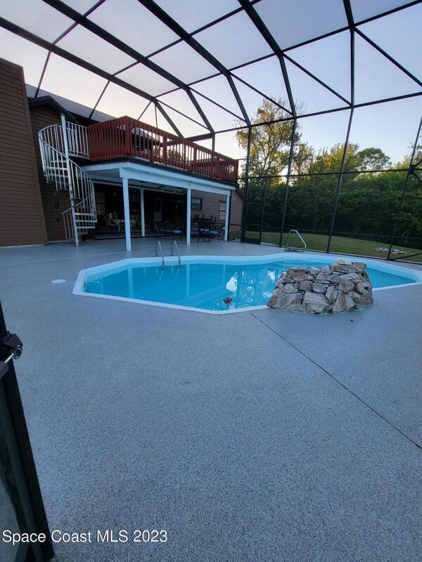 Beautiful brick home at the end of a cul-de-sac on an acre property with a 40 foot RV port, with one attached 2-car garage and two detached 2-car garages for a total of 6 car garage spaces! Long circular driveway with enough room for a boat. Solar-heated, fiberglass pool with relaxing rock waterfall in a huge screened enclosure that encompasses the second floor balcony and outdoor spiral staircase. The entire second floor is the primary bedroom with an en-suite with double sinks and walk-in closet, and brand new wood laminate flooring. Beautiful new flooring on the stairs as well as the formal dining room and living room. Newly rescrewed metal roof. 2 new A/C units 2021. Gorgeous granite countertops in the large eat-in kitchen with island and pass-through window to the lanai.