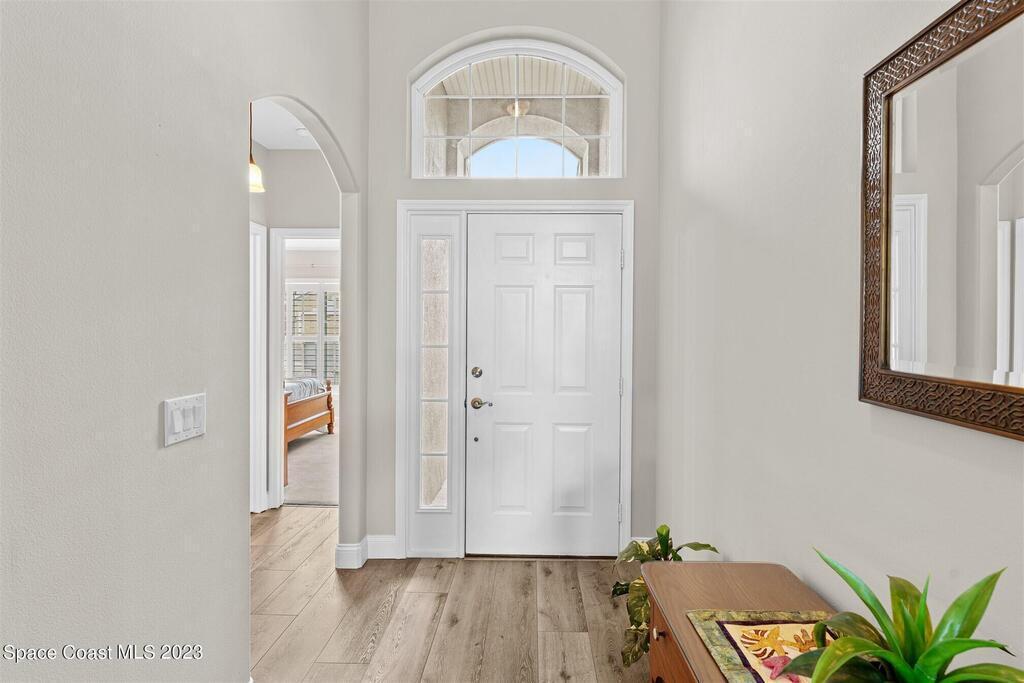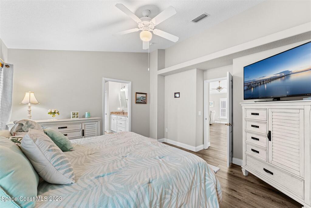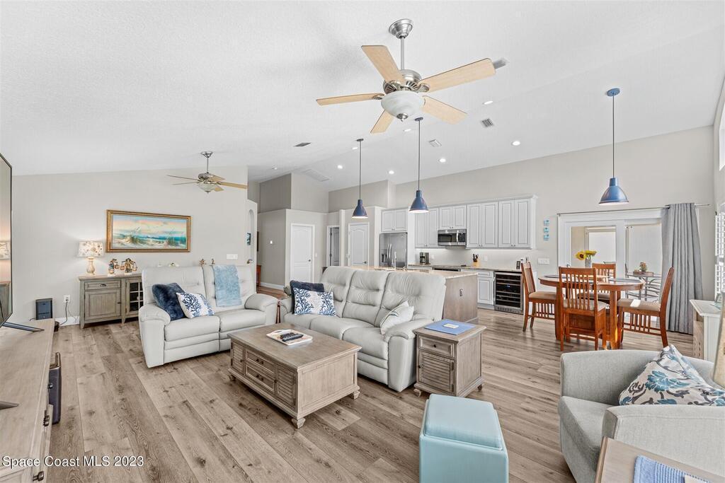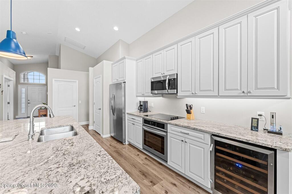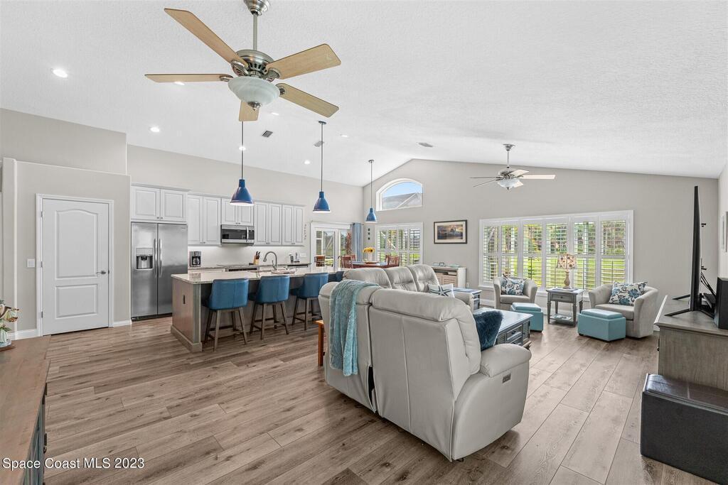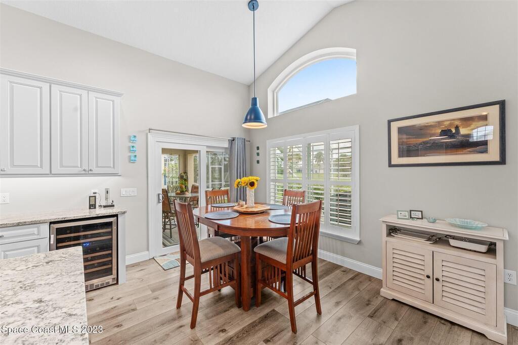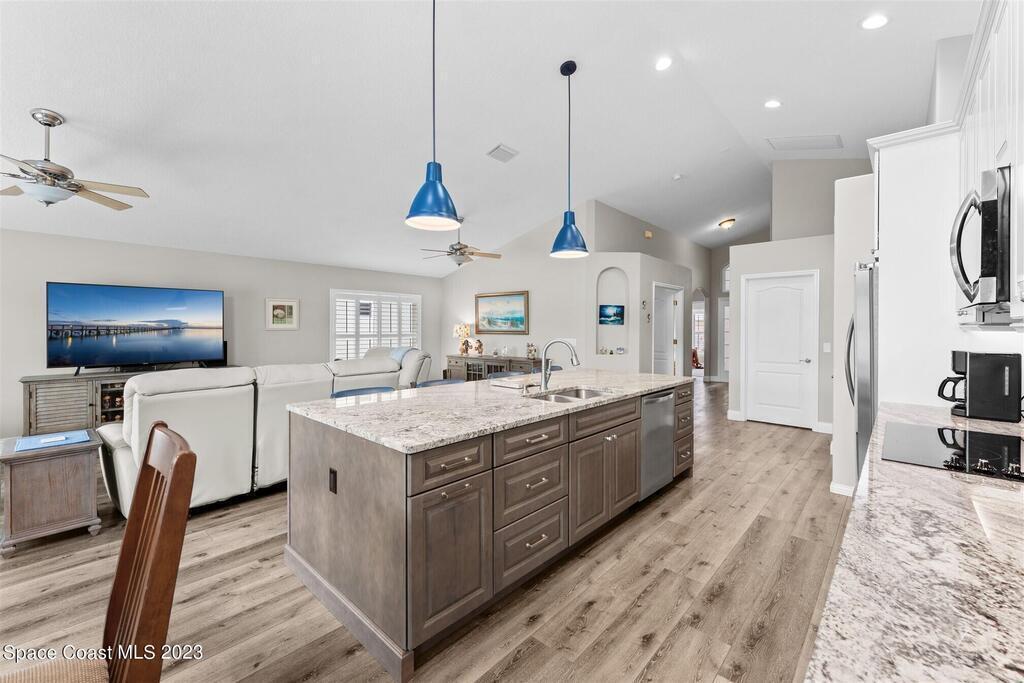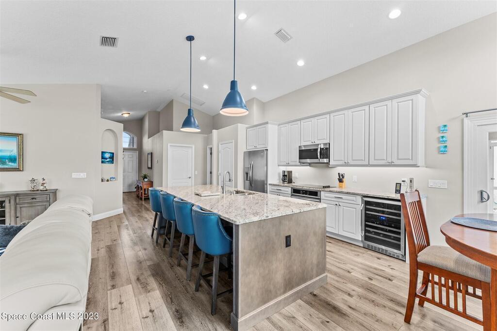 Nestled within Viera East Golf's gated community, this 3-bed, 2-bath gem radiates modern elegance and comfort. Featuring an updated kitchen, tile flooring, impact windows and a newly remodeled bath, this home exudes contemporary charm against a backdrop of serene golf course views. Step into a sun-kissed open layout that seamlessly connects the living spaces, inviting in the warmth of natural light. The updated kitchen boasts an extended island with granite countertops, stainless steel appliances, and wine cooler, a perfect blend of function and luxury. However, the allure of this home extends beyond its walls. Venture out through the sliding doors to discover a screened patio, a coveted space where the boundary between indoor and outdoor living blurs. It's here, amid the swaying