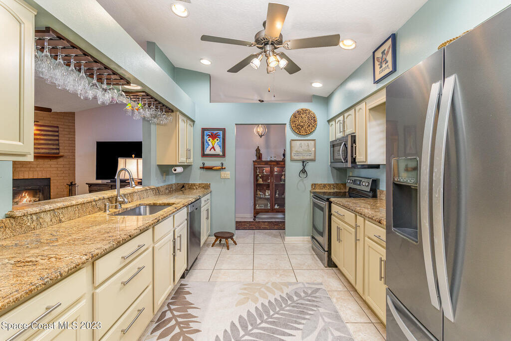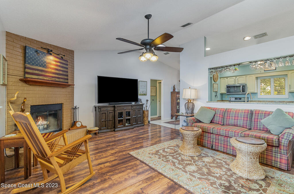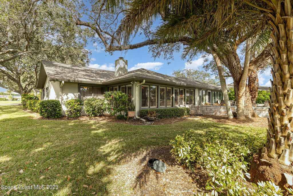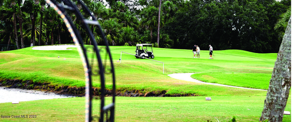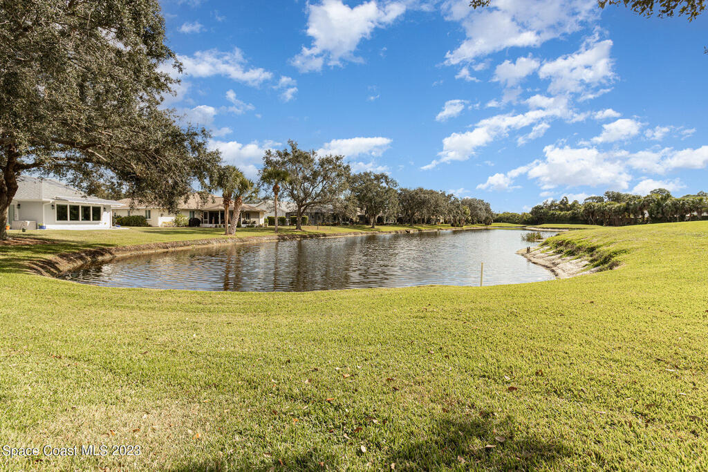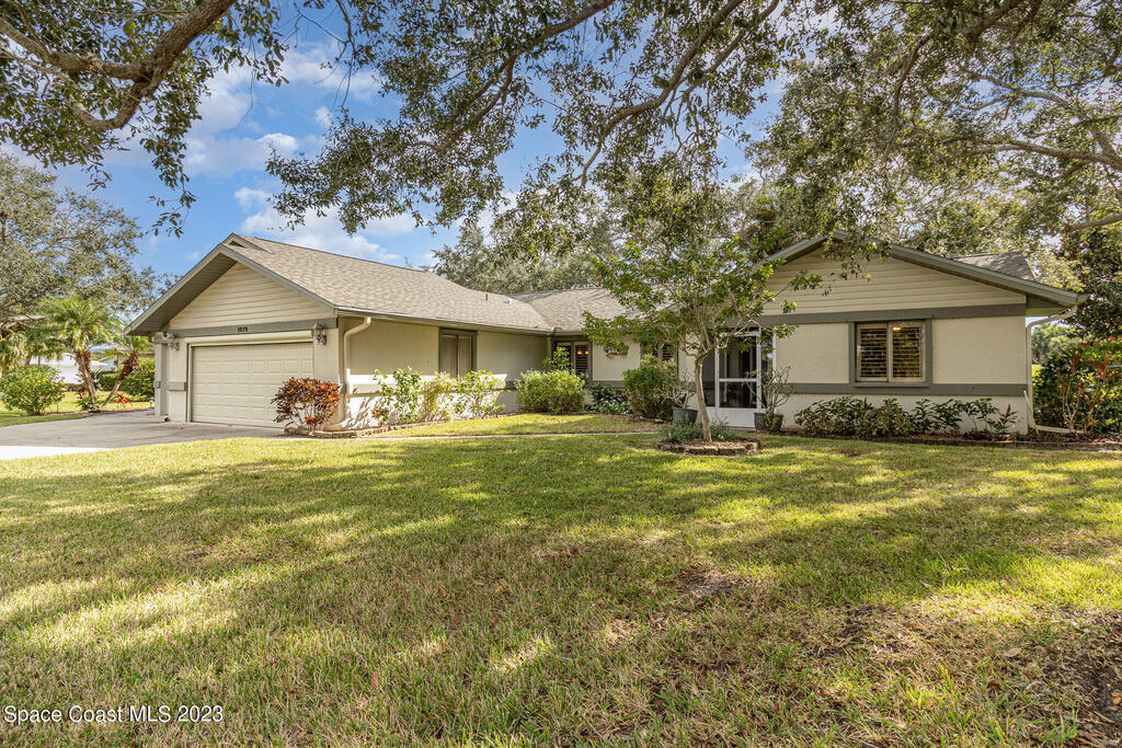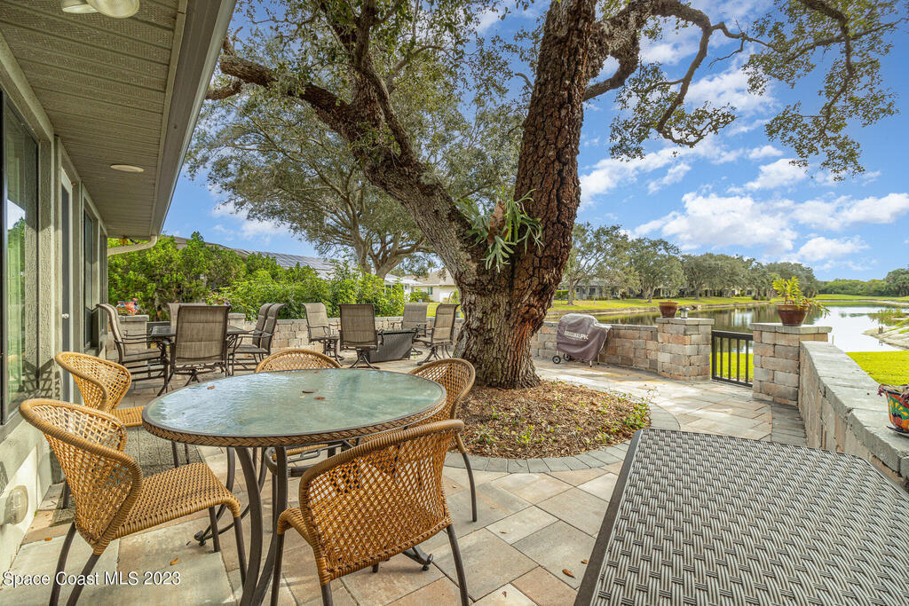 Must see this RARE 3-car garage, UPDATED Raleigh model located in a military, country club community in the heart of Viera. This 3-bed/2-bath home has vaulted ceilings and an open floor plan. Updated kitchen overlooks living and dining areas and boasts granite counter tops, pull-out drawers, SS appliances, breakfast nook, coffee/wine bar, barn doors hiding the full size stacked W&D, and LOTS of cabinets. Tile and laminate throughout. Fireplace in LR. Updated primary and secondary bathrooms with granite countertops. Primary bedroom features two walk in closets with built-in storage. Florida room, primary bedroom, and secondary bedroom offer breathtaking water and golf views. Check out the custom pavered back patio-great space for entertaining,