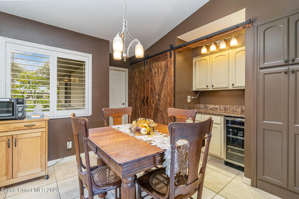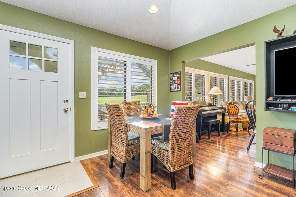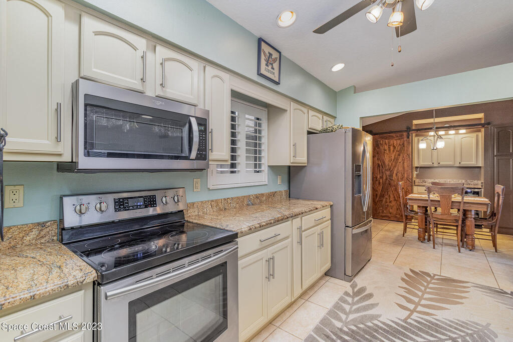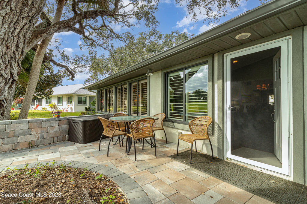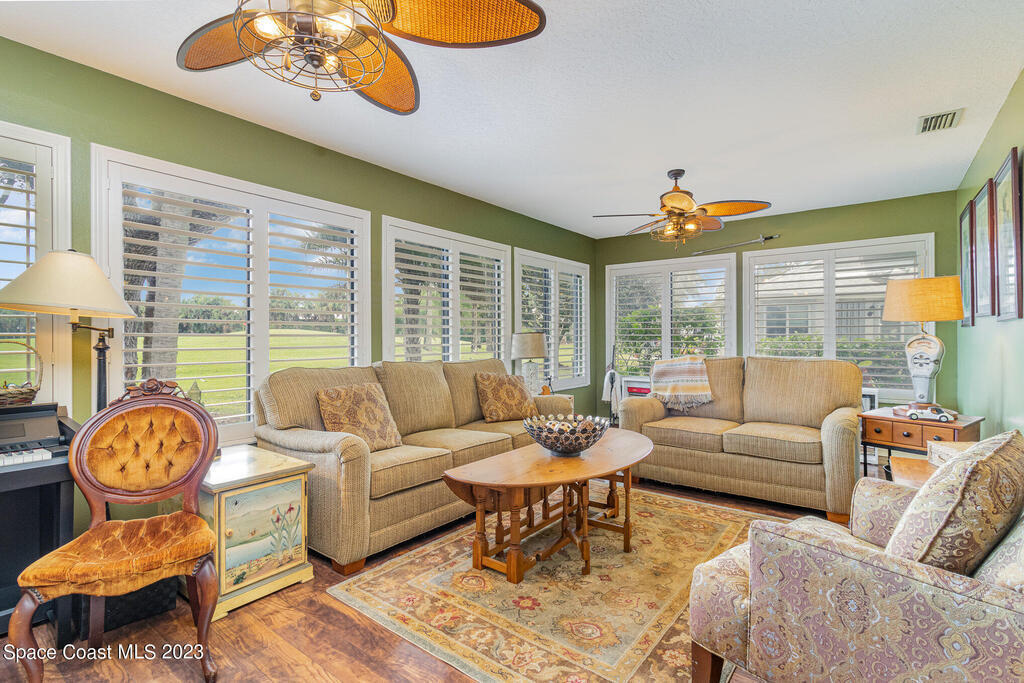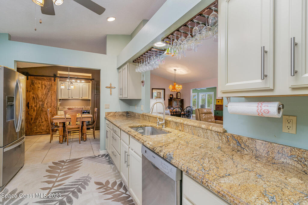 Must see this RARE 3-car garage, UPDATED Raleigh model located in a military, country club community in the heart of Viera. This 3-bed/2-bath home has vaulted ceilings and an open floor plan. Updated kitchen overlooks living and dining areas and boasts granite counter tops, pull-out drawers, SS appliances, breakfast nook, coffee/wine bar, barn doors hiding the full size stacked W&D, and LOTS of cabinets. Tile and laminate throughout. Fireplace in LR. Updated primary and secondary bathrooms with granite countertops. Primary bedroom features two walk in closets with built-in storage. Florida room, primary bedroom, and secondary bedroom offer breathtaking water and golf views. Check out the custom pavered back patio-great space for entertaining,