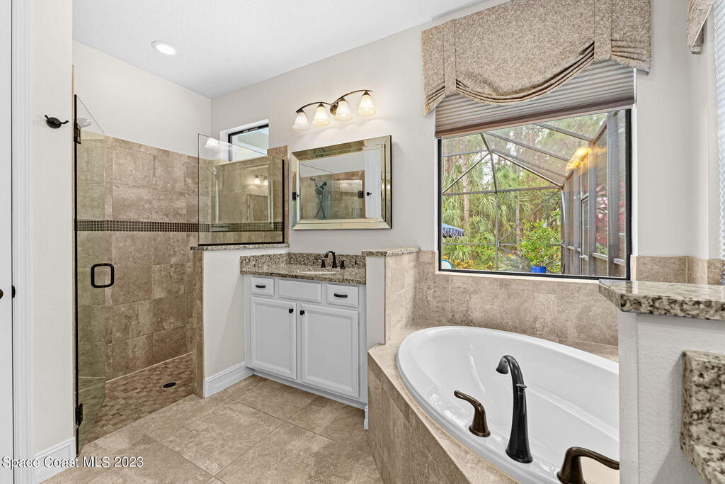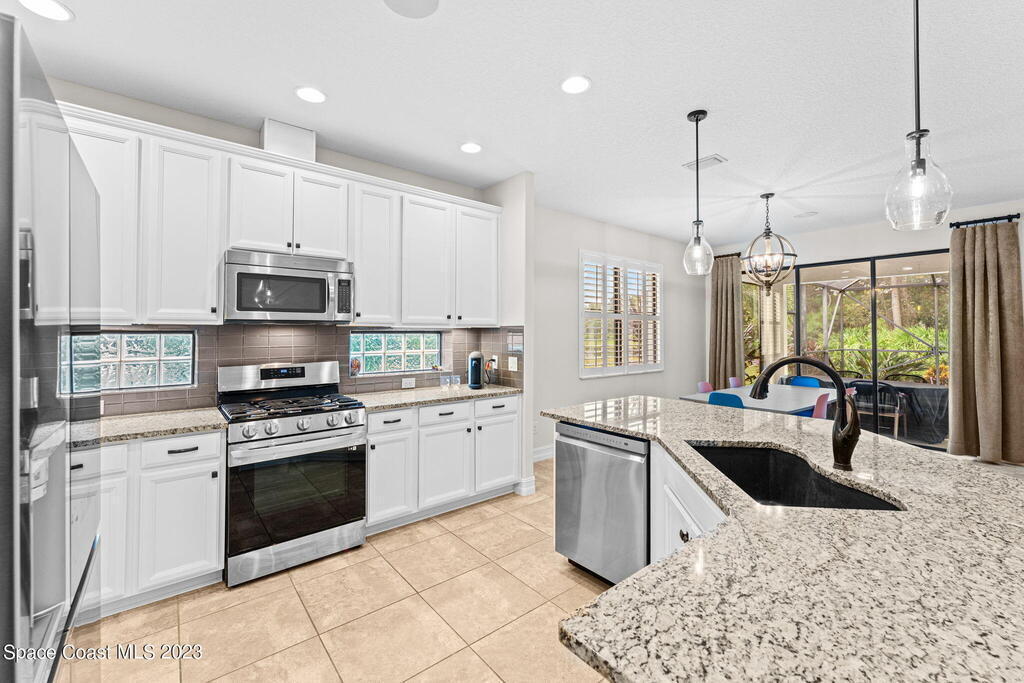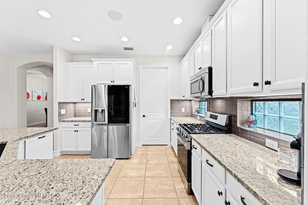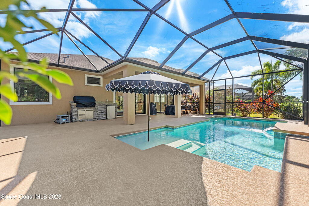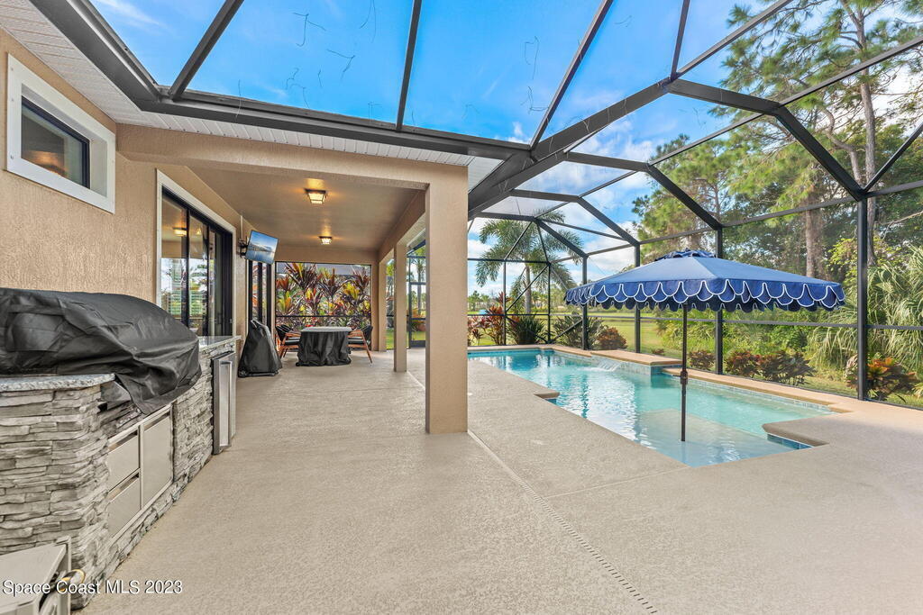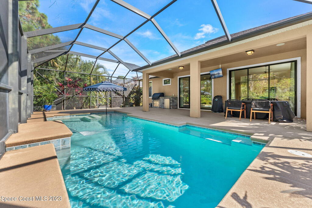 On a leafy preserve w/lakeside glimpses, this people-pleaser showcases a saltwater pool, a summer kitchen & modern features! Fresh interior paint, plantation shutters & broad baseboards complement tile floors stretching through generous living & dining spaces. 2 sets of triple sliders off the family rm open to the pool. Granite counters & glass tile backsplashes sweep across the b-fast bar kitchen, accenting SS appliances, a gas range & white crown-molded cabinetry w/under-mount lighting. Double doors lead to a relaxing primary retreat boasting a big walk-in closet, dual granite sinks, a sumptuous soaking tub & a handsome tiled shower ribboned w/mosaics. Enjoy the magic of an airy screened lanai & a waterfall pool overlooking lush conservation & partial views of the lovely lake!