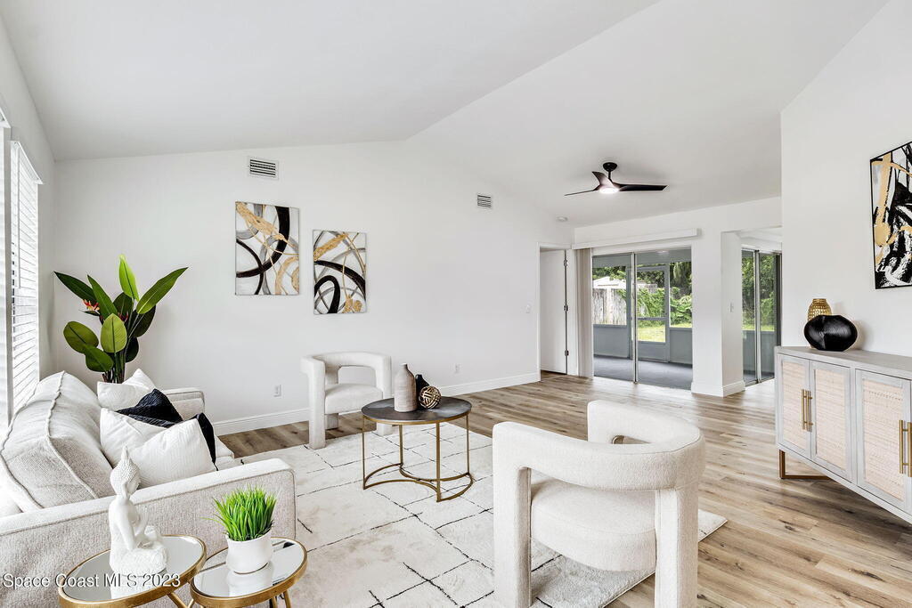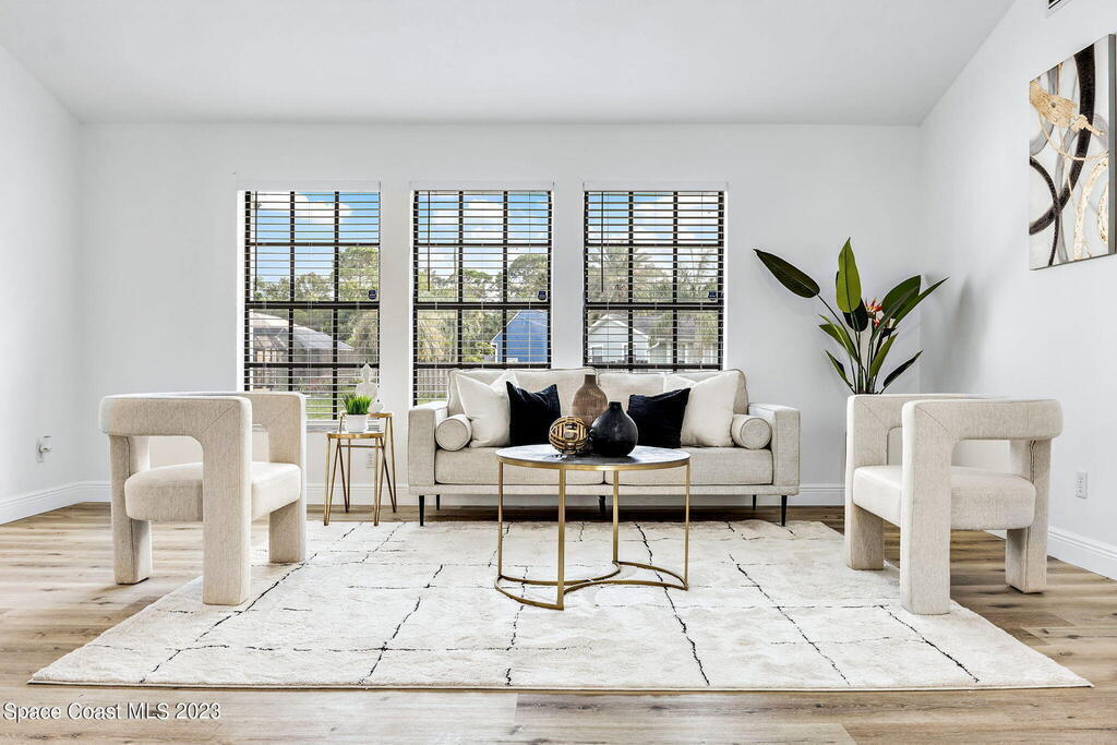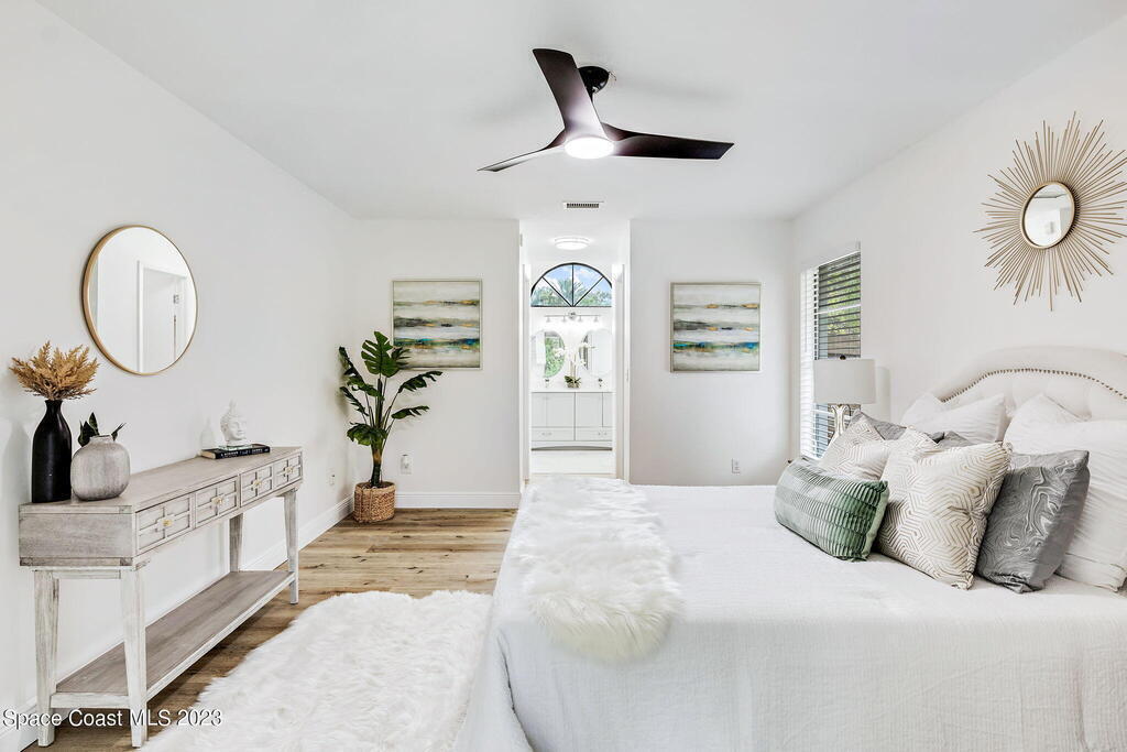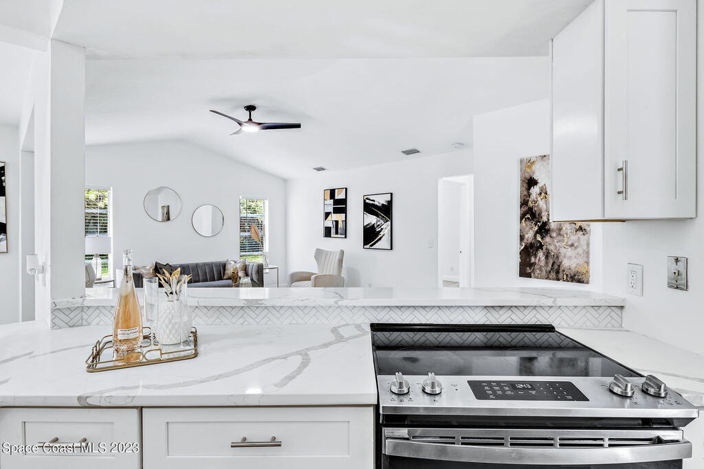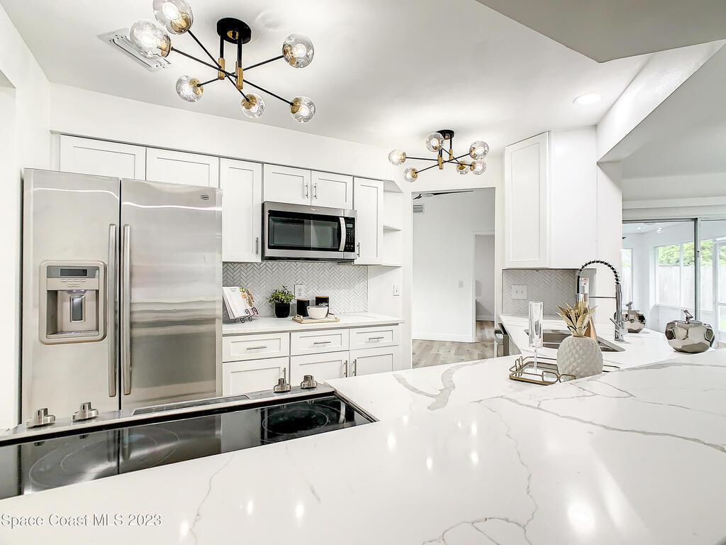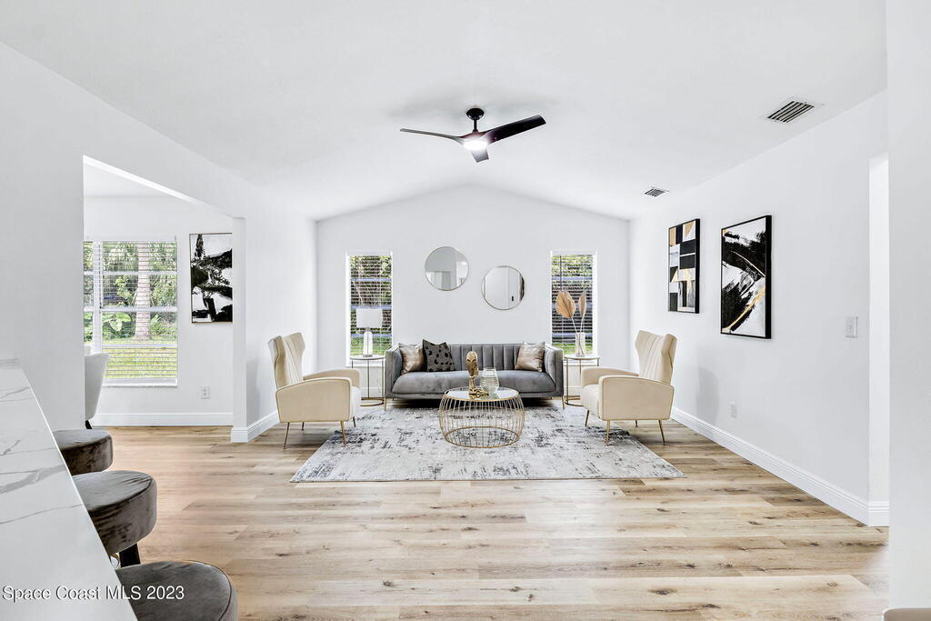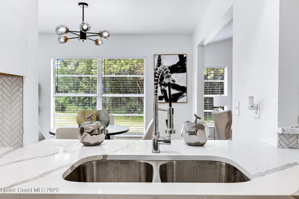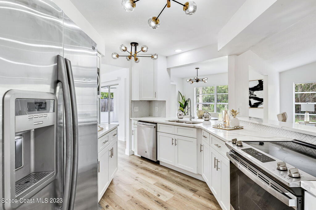 Looking to satisfy your desires for a luxurious home with ultra-chic SoCal vibes? California dreaming starts here! Located in the sought-after neighborhood of Port Malabar and recently remodeled to the nines, this modern 3BR/2BA residence captivates with a BRAND-NEW ROOF, a freshly landscaped 0.24-acre lot, peek-a-boo water views, high ceilings, LVP flooring, spacious living room, formal dining area, sizeable family room, and a gourmet kitchen featuring stainlesssteel appliances, Calacatta quartz counters, herringbone tile backsplash, and trendy bar seating. Beckoning relaxation, the primary bedroom affords elevated splendor with 2 walk-in closets, lanai access, and a luxe en suite boasting a quartz-topped dual vanity, sleek fixtures, and an oversized shower.