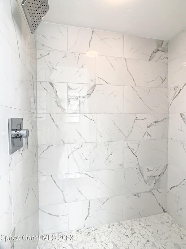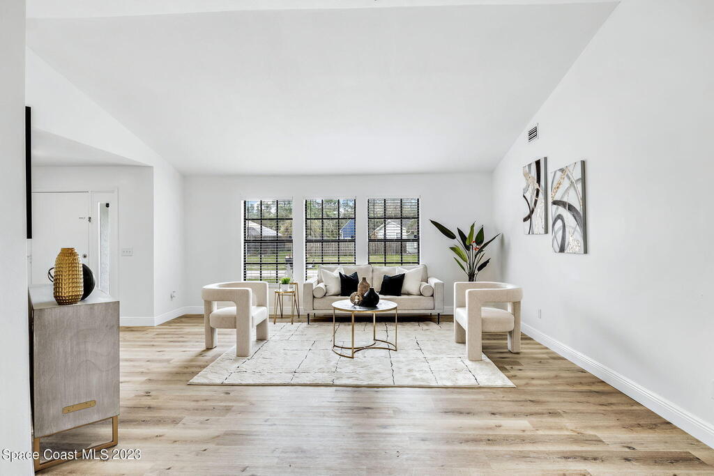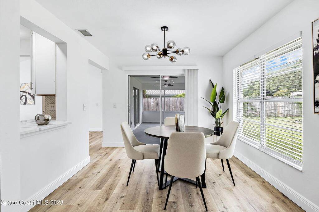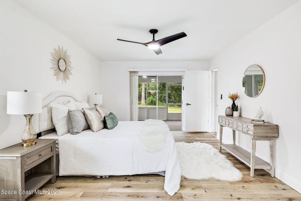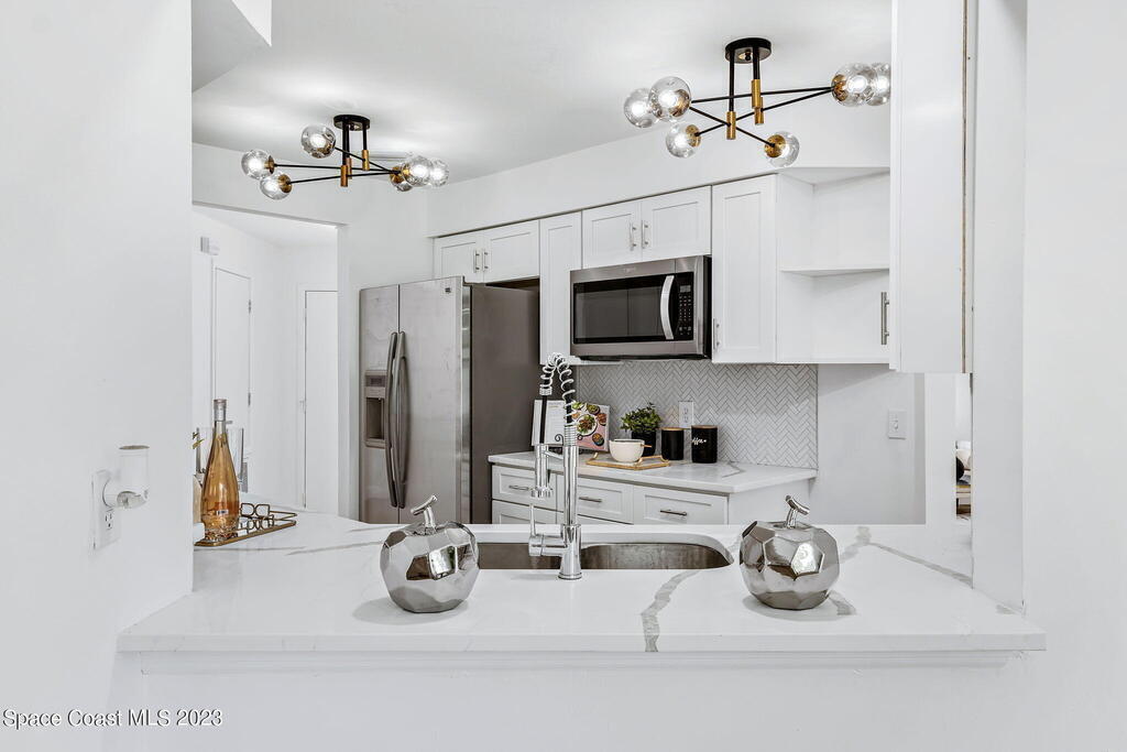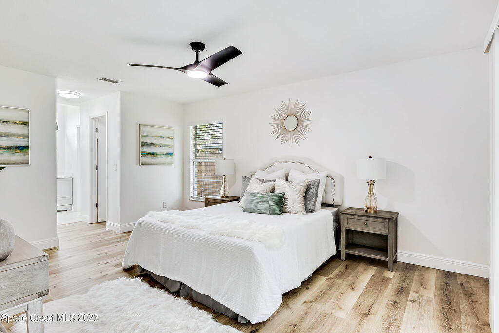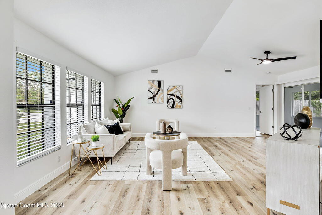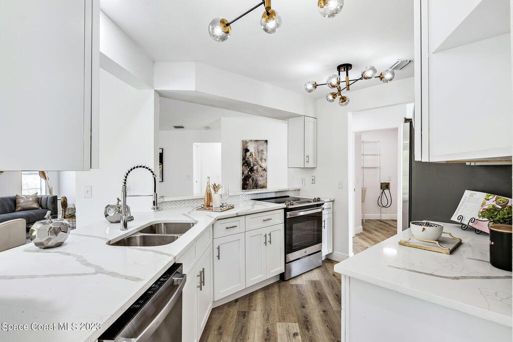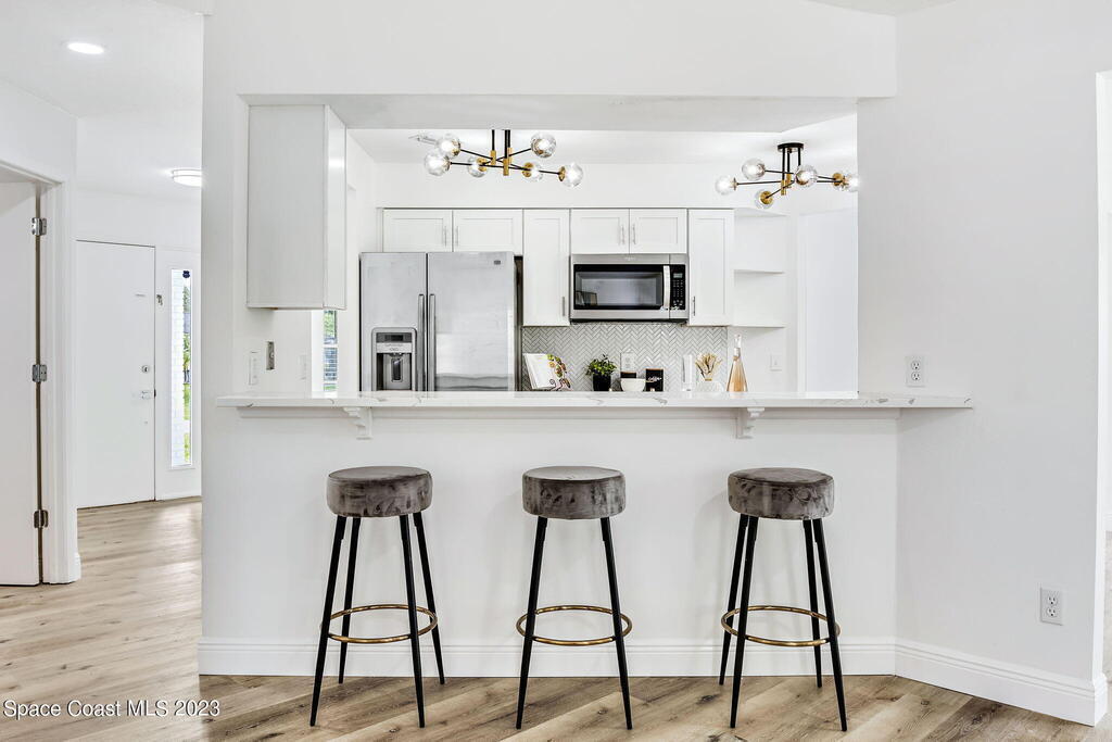 Looking to satisfy your desires for a luxurious home with ultra-chic SoCal vibes? California dreaming starts here! Located in the sought-after neighborhood of Port Malabar and recently remodeled to the nines, this modern 3BR/2BA residence captivates with a BRAND-NEW ROOF, a freshly landscaped 0.24-acre lot, peek-a-boo water views, high ceilings, LVP flooring, spacious living room, formal dining area, sizeable family room, and a gourmet kitchen featuring stainlesssteel appliances, Calacatta quartz counters, herringbone tile backsplash, and trendy bar seating. Beckoning relaxation, the primary bedroom affords elevated splendor with 2 walk-in closets, lanai access, and a luxe en suite boasting a quartz-topped dual vanity, sleek fixtures, and an oversized shower.