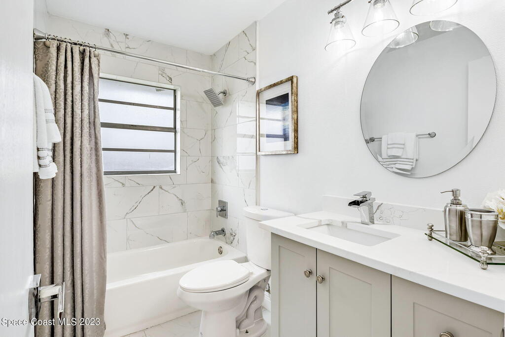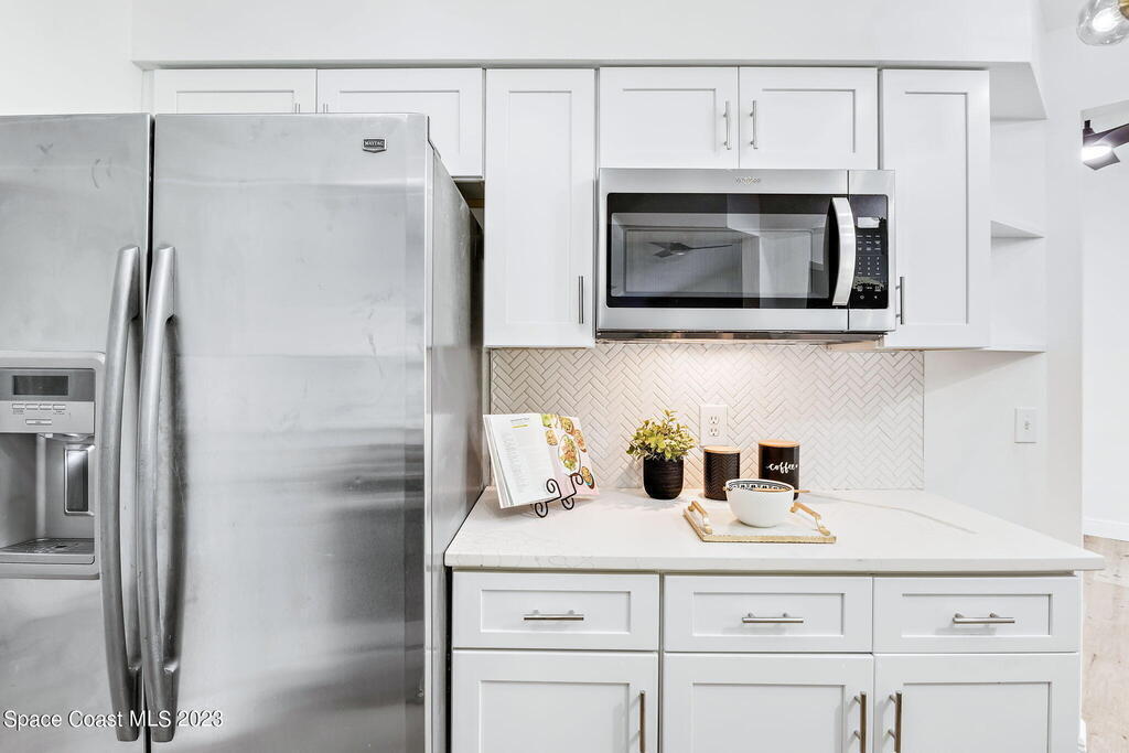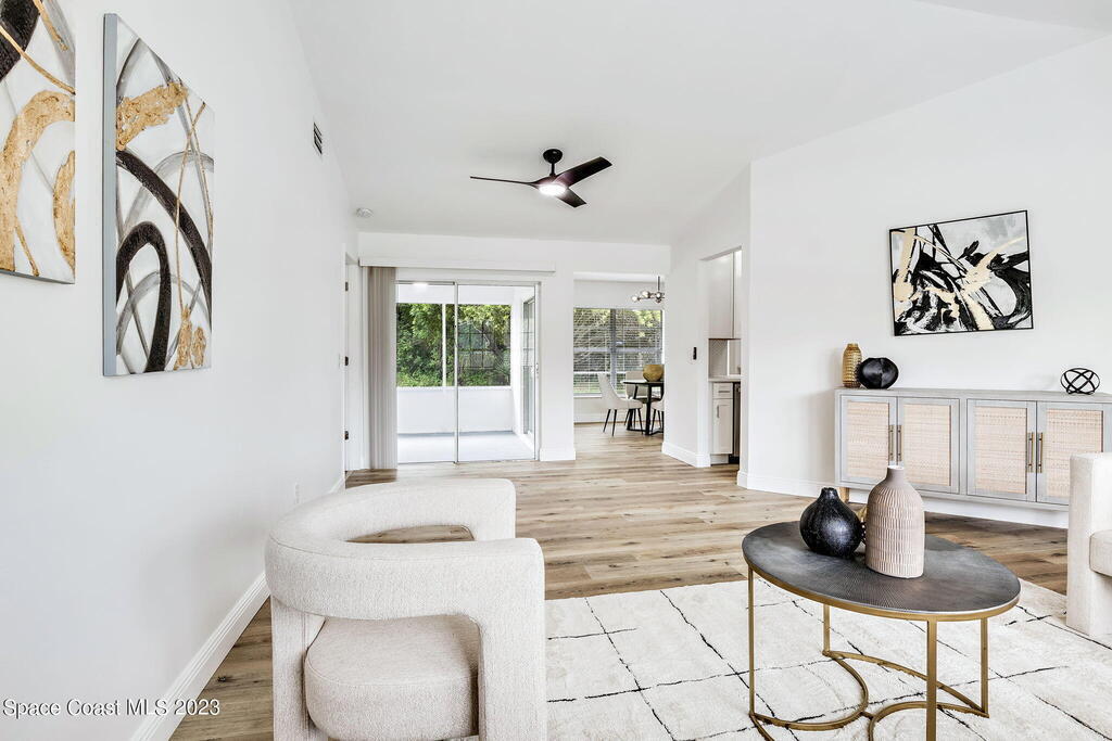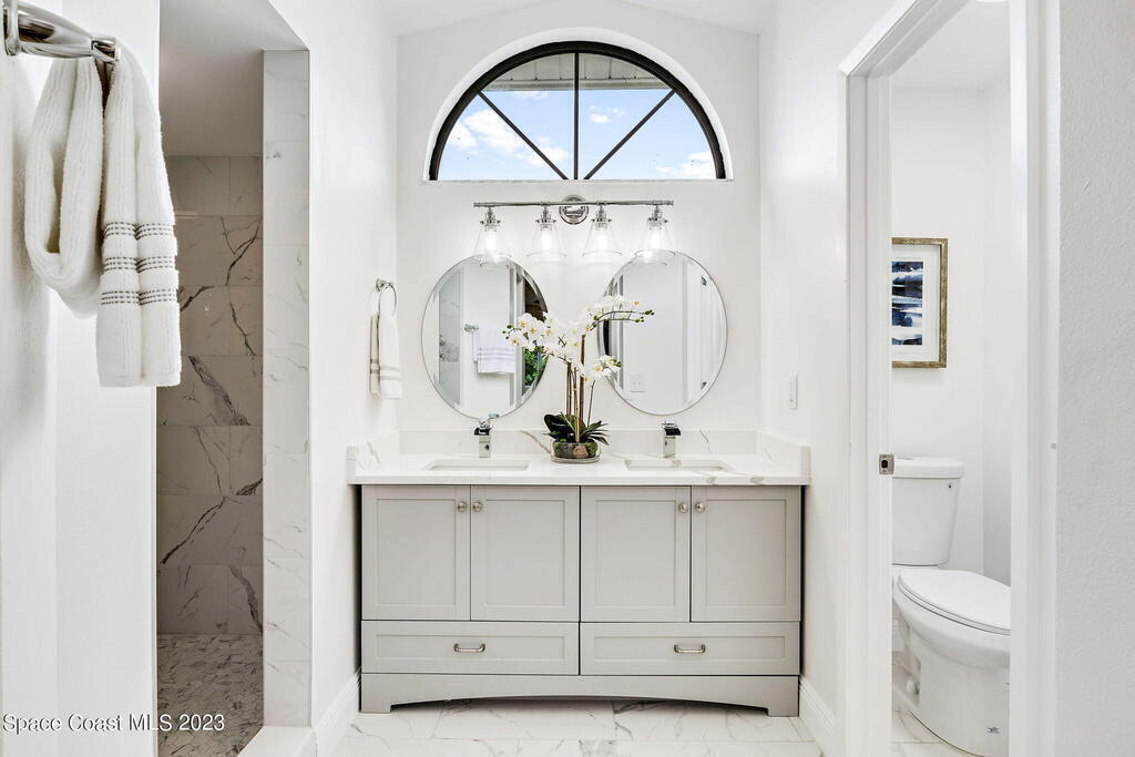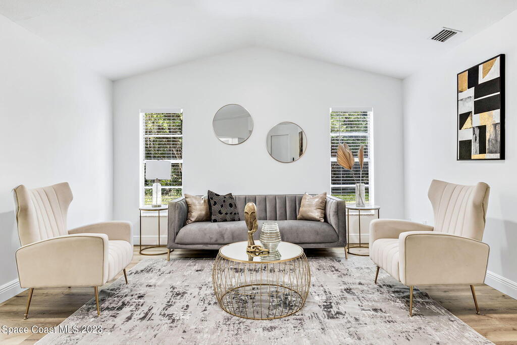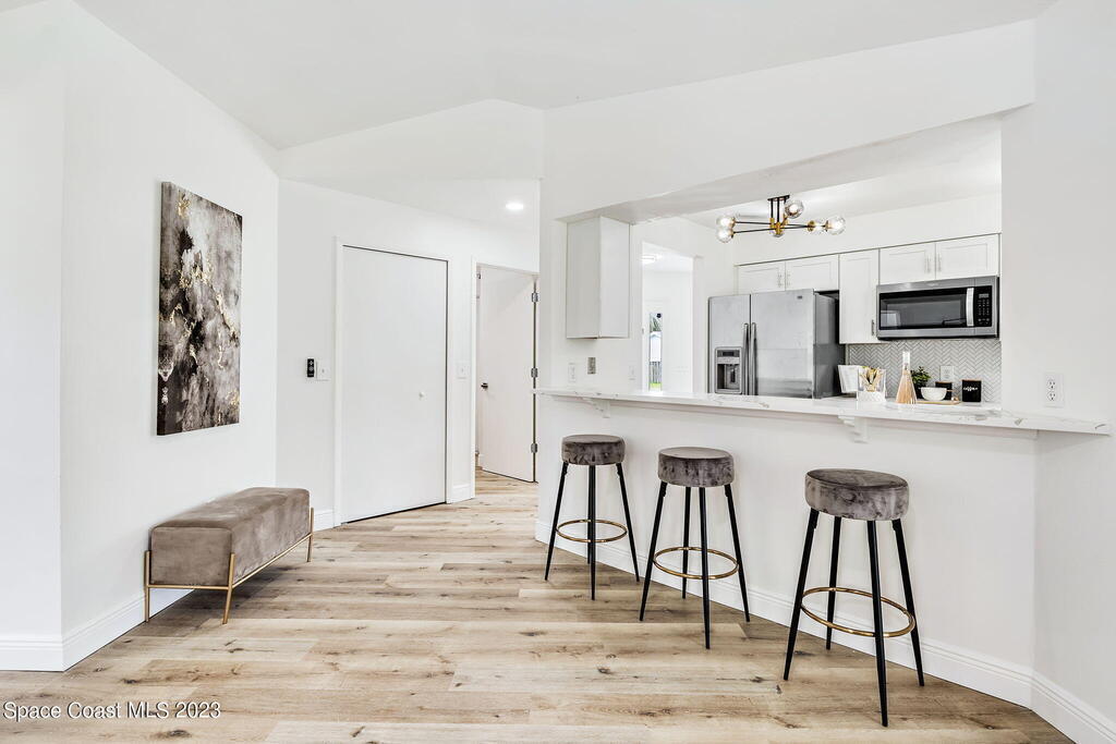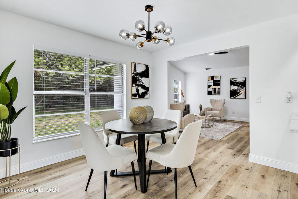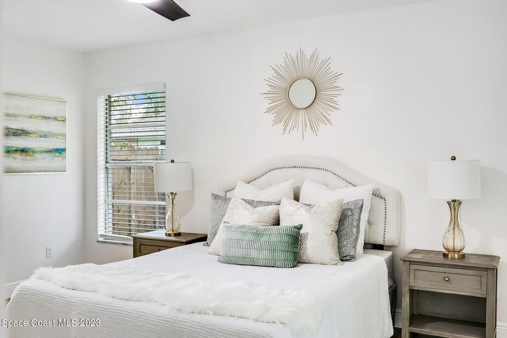 Looking to satisfy your desires for a luxurious home with ultra-chic SoCal vibes? California dreaming starts here! Located in the sought-after neighborhood of Port Malabar and recently remodeled to the nines, this modern 3BR/2BA residence captivates with a BRAND-NEW ROOF, a freshly landscaped 0.24-acre lot, peek-a-boo water views, high ceilings, LVP flooring, spacious living room, formal dining area, sizeable family room, and a gourmet kitchen featuring stainlesssteel appliances, Calacatta quartz counters, herringbone tile backsplash, and trendy bar seating. Beckoning relaxation, the primary bedroom affords elevated splendor with 2 walk-in closets, lanai access, and a luxe en suite boasting a quartz-topped dual vanity, sleek fixtures, and an oversized shower.
