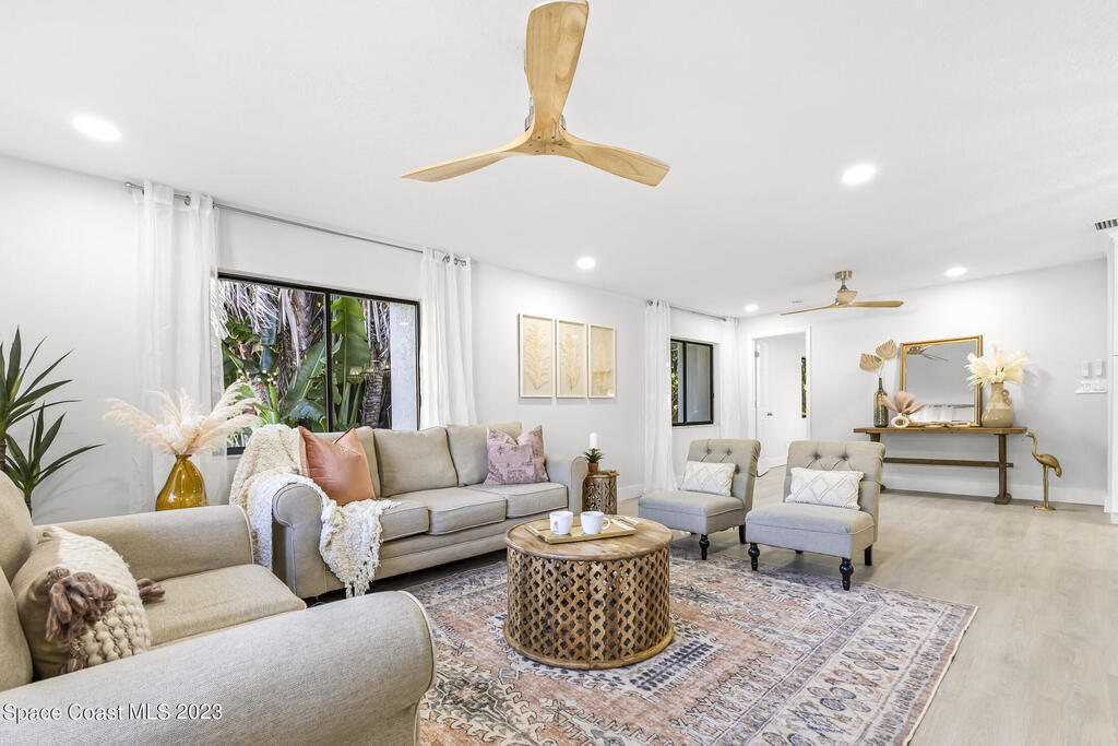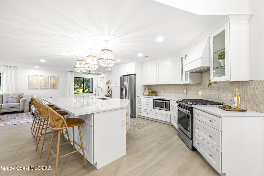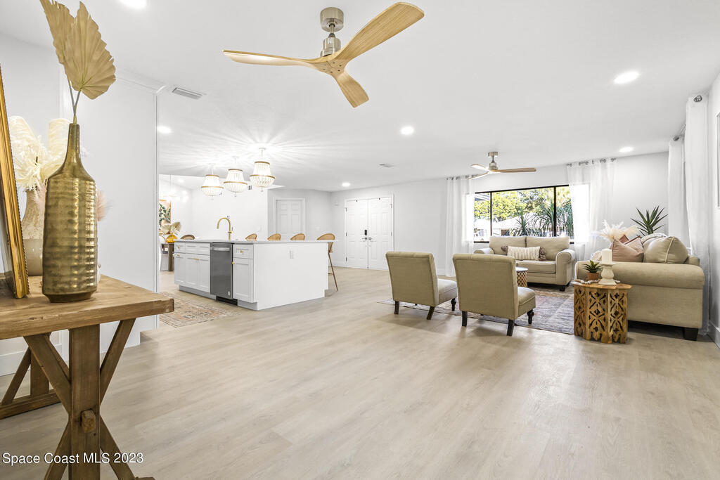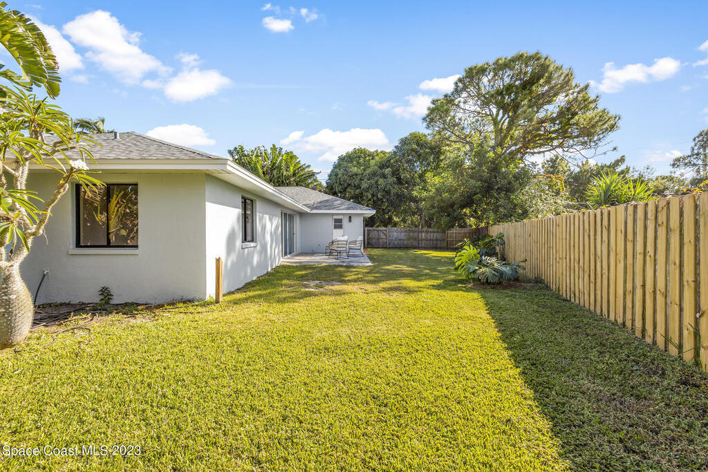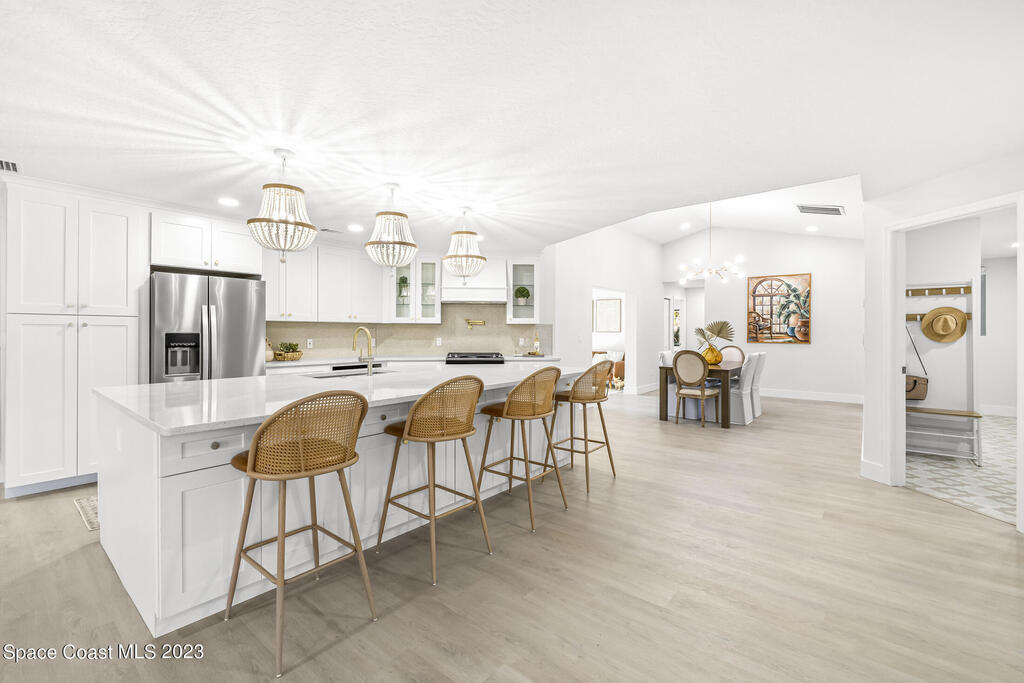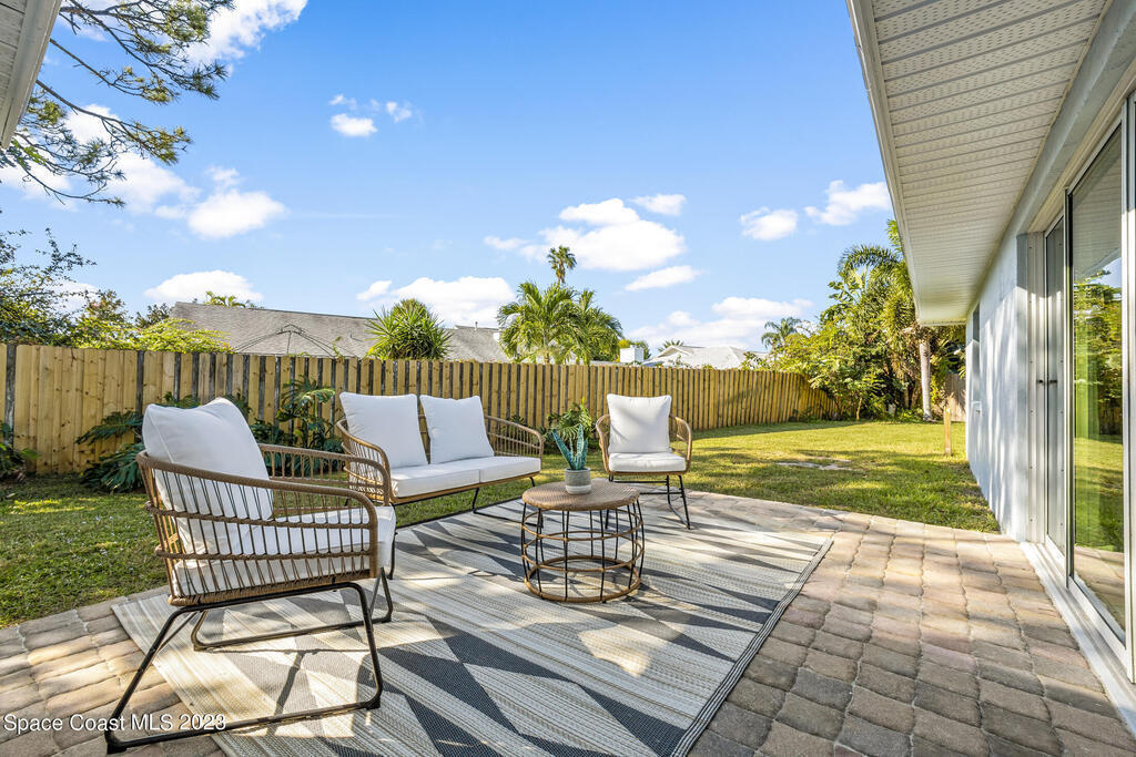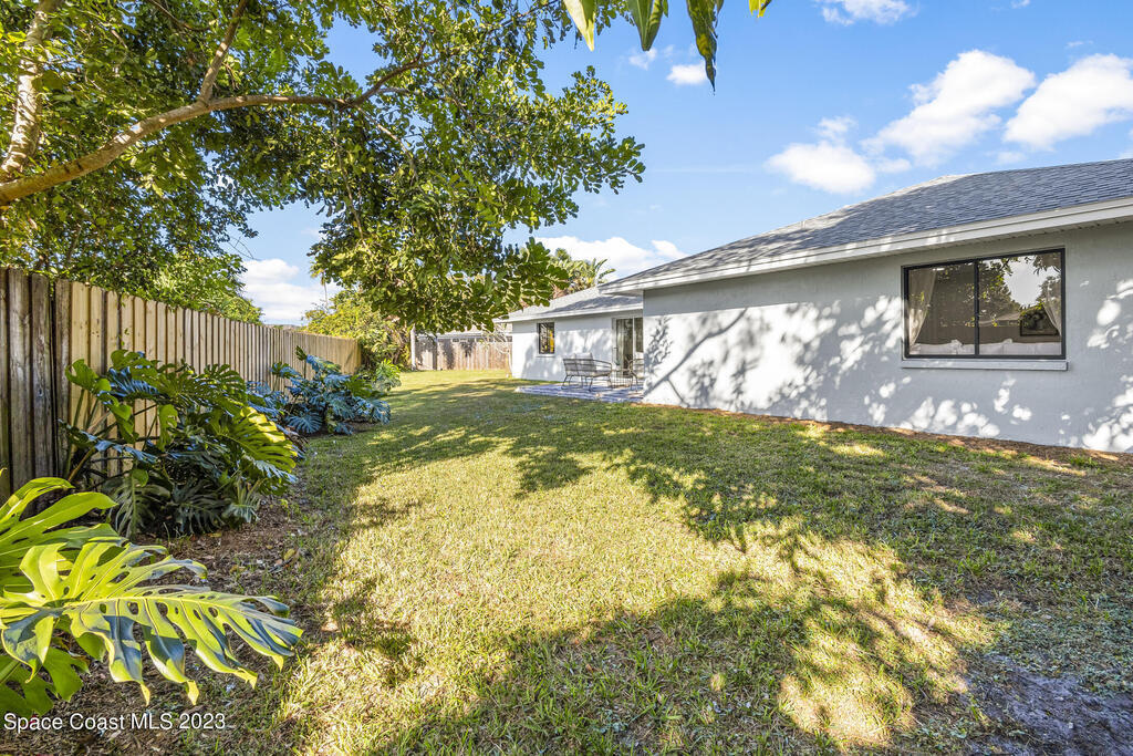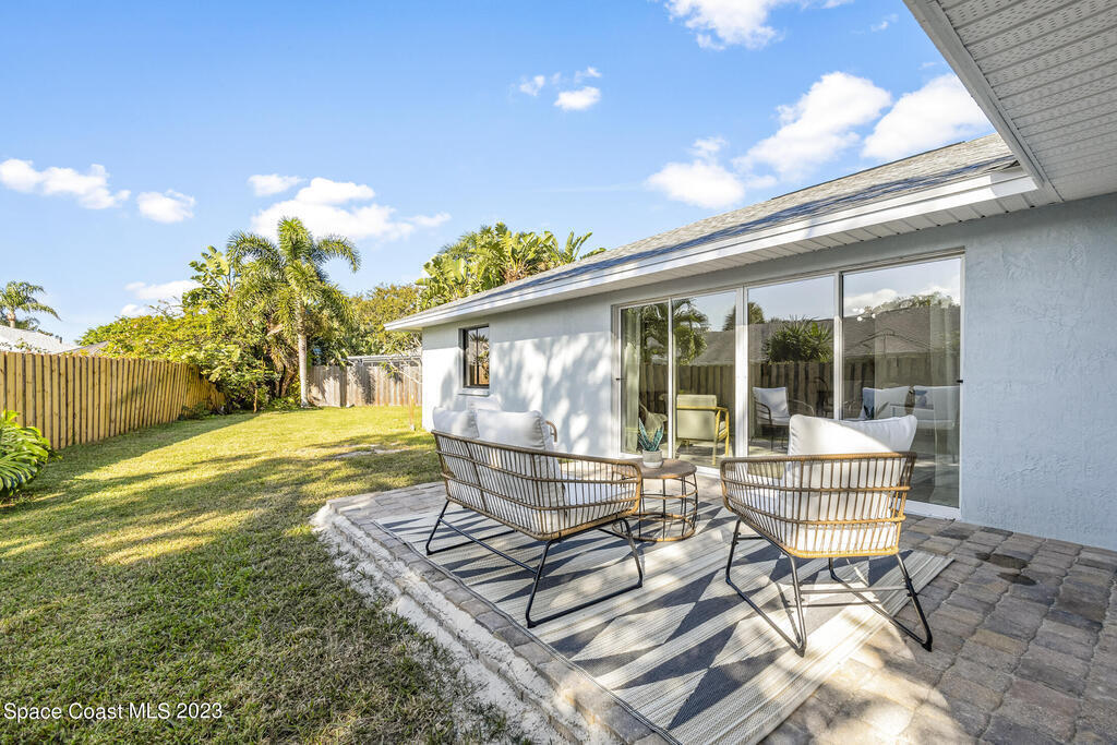 Stunning Completely Remodeled and Professionally Designed Suntree Residence on quiet Cul-de-sac. Entertain family and friends around the massive quartz kitchen island in this open floor plan home. Enjoy morning coffee on the pavered patio. Every surface has been updated in this lovely home. Flooring, Appliances, HVAC, Roof, Kitchen, Bathrooms, Electrical Panel, Tankless Water Heater,Designer Lighting ALL NEW in 2023. Mature fruit tree grove, fenced yard, wide driveway on this 1/3 acre lot. Close to restaurants, shopping and entertainment. 10 min to the best beached in Brevard. Fine Florida Living Awaits!!