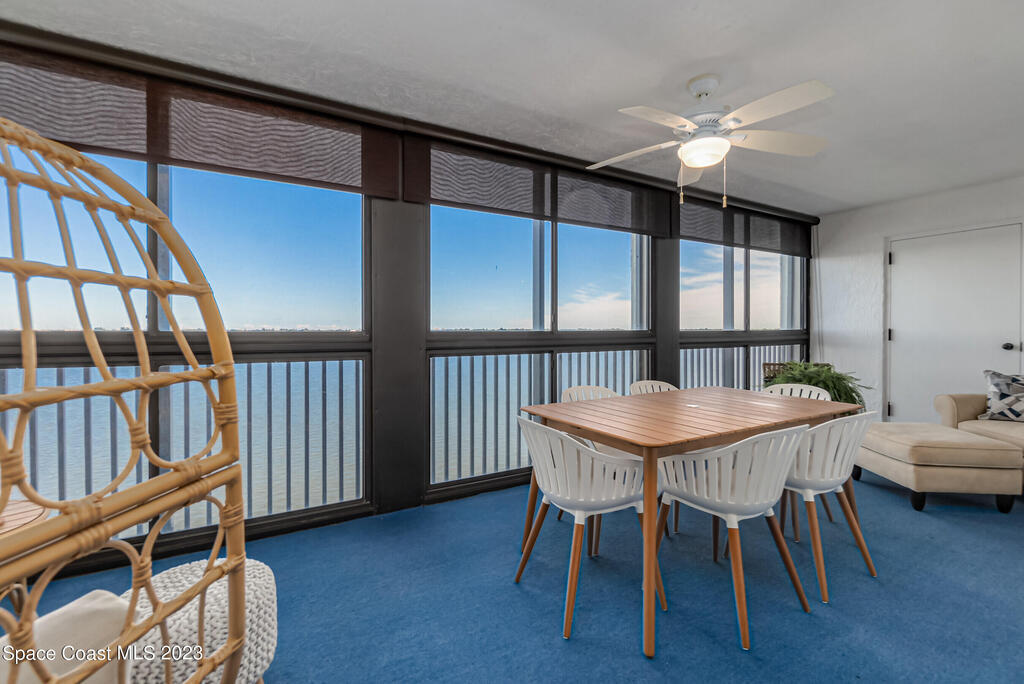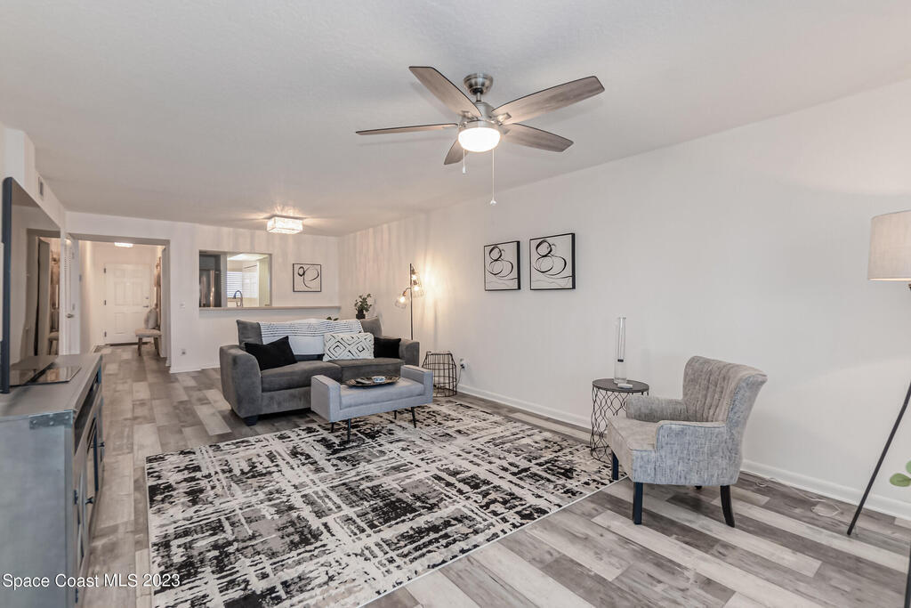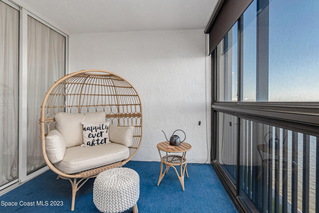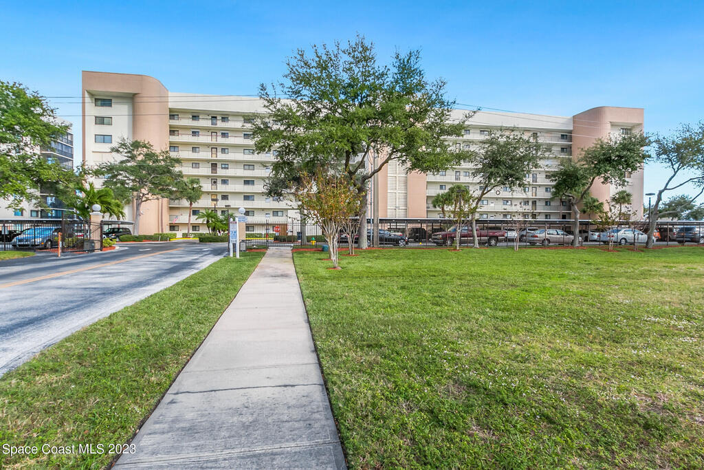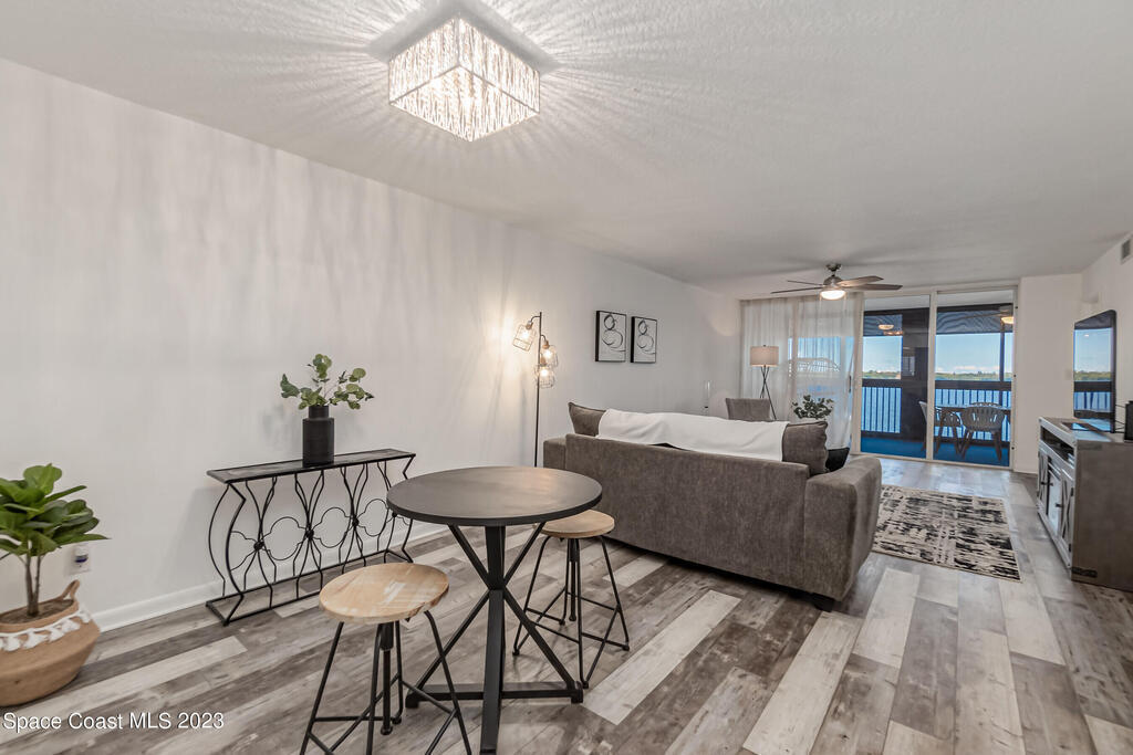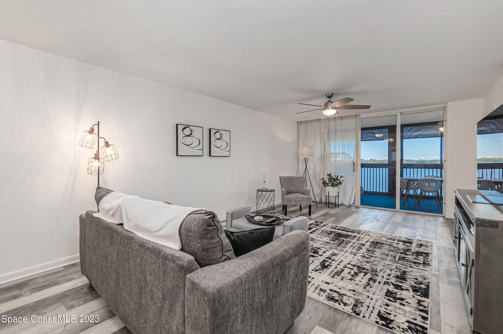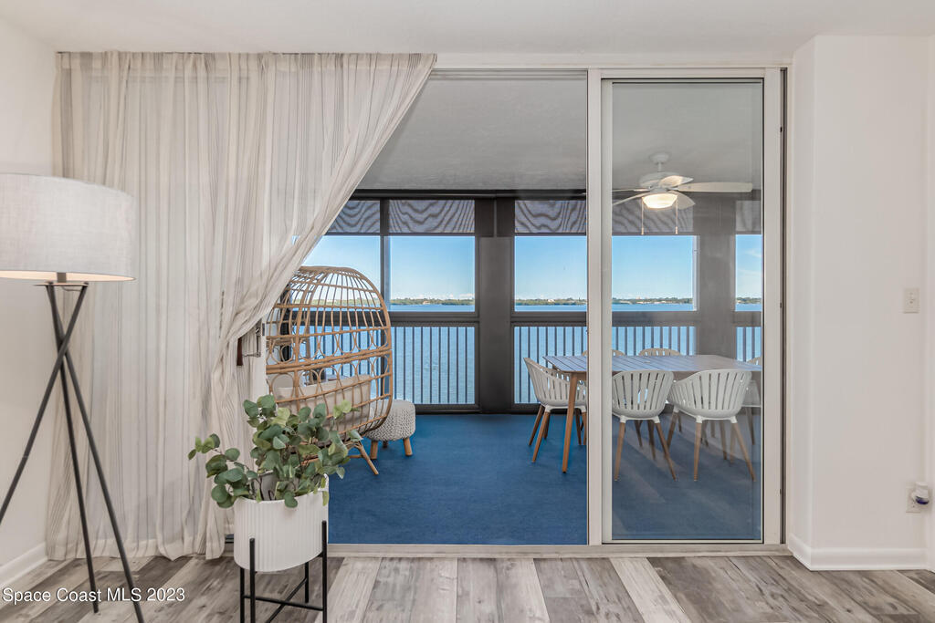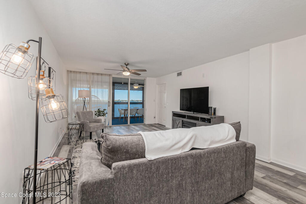 LOOK at that VIEW! Beautiful 1 bedroom, 1 bathroom waterfront condo with a specular location is a must see. Enjoy enclosed waterfront terraced while you enjoy sunrises, watch the wildlife and passing boats. Remodeled with NEW flooring, appliances, and more. Condo will convey partially furnished to include a sleeper sofa. Amazing Rocket Launch Views from the comfort of your residence. The Resort style gated community features two pools (one heated), hot tub, sauna, tennis/pickleball courts, clubhouse, boardwalk/fishing pier, car wash area, and more. HOA fee includes water, internet, cable, and pest control. One car carport and ample guest parking. Close to shops, grocery stores, restaurants, Orlando International Airport, and the wonderful Space Coast beaches. Come live the island life!