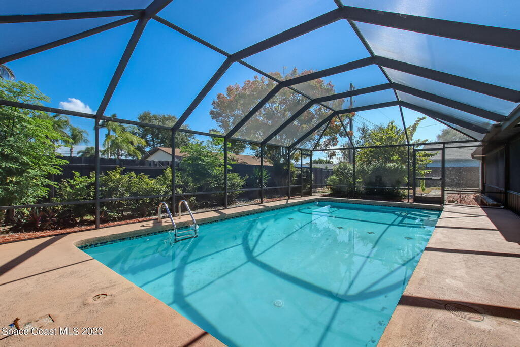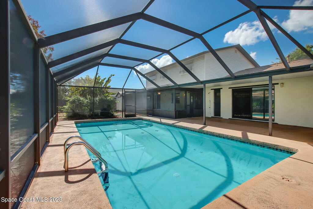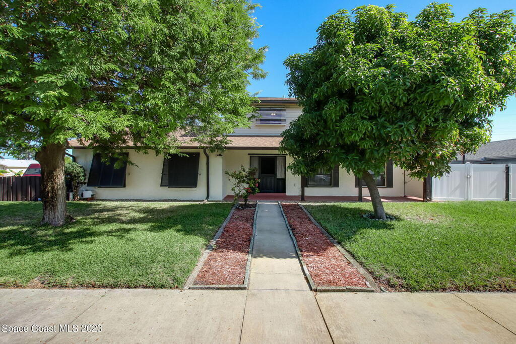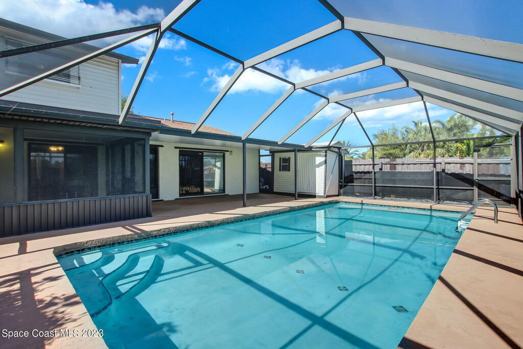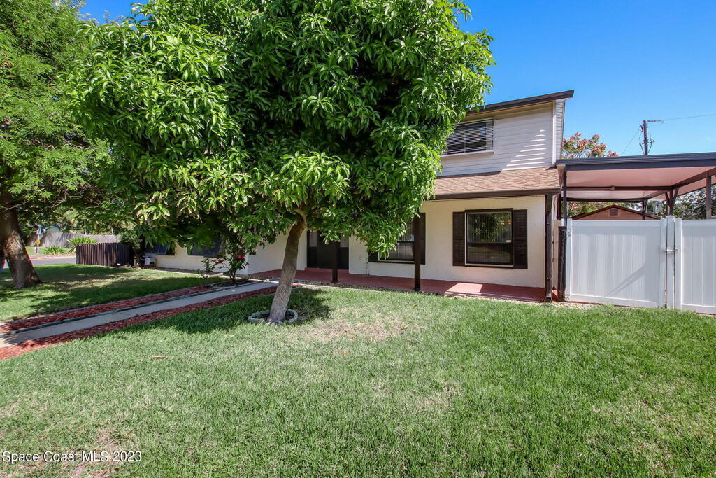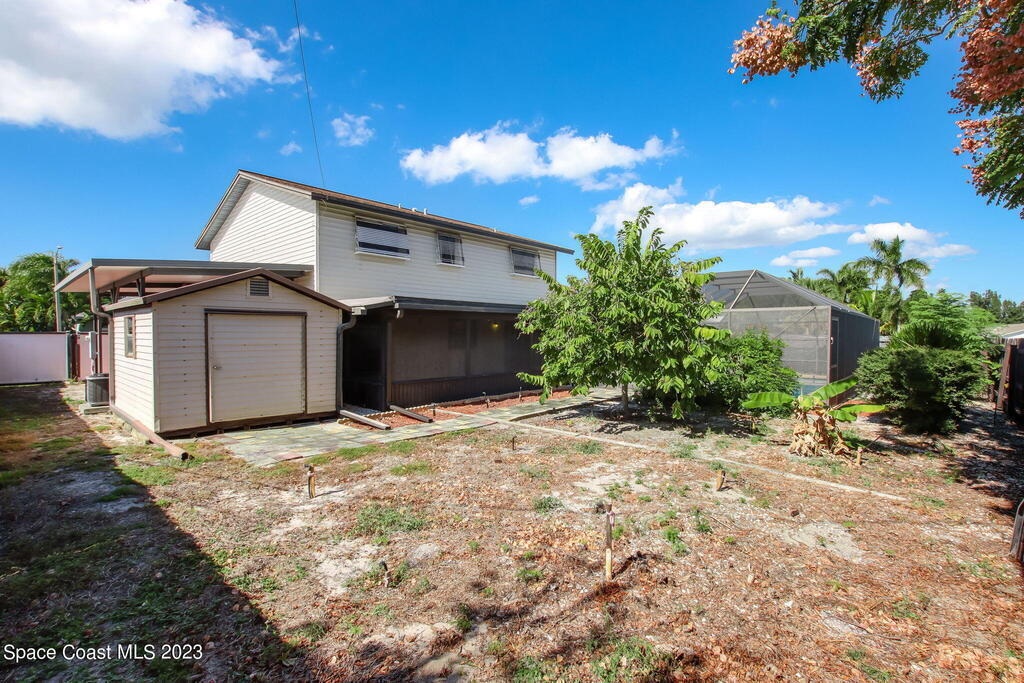 Welcome to the inviting charm of Surfside Estates in Merritt Island! This delightful 4-bedroom, 2.5-bathroom home on a corner lot boasts mature landscaping, fruit bearing trees, and a privacy fence, creating an alluring curb appeal. Beyond its aesthetic charm, the property offers a range of practical features, including a covered space for RV storage, a supplementary spot for a camper/trailer, metal utility shed with electric, second utility shed to store pool equipment, removeable hurricane shutters for doors and windows, and the convenience of natural gas. The home is well-prepared for emergencies with a backup generator that powers first floor AC and essential appliances and lighting. The interior floor plan impresses with spacious rooms, a traditional two-story layout,