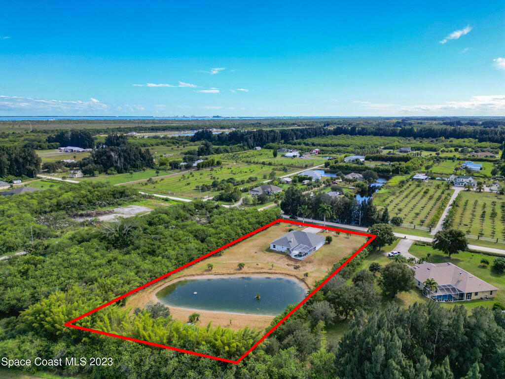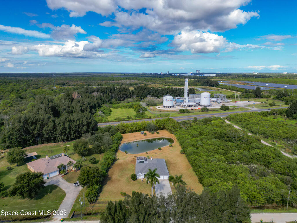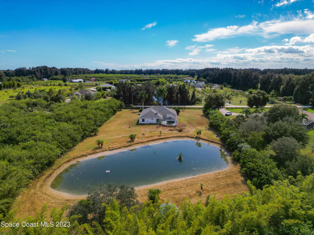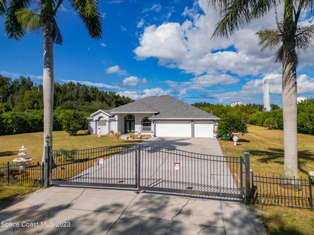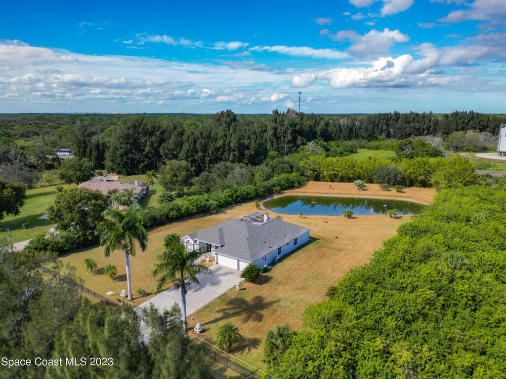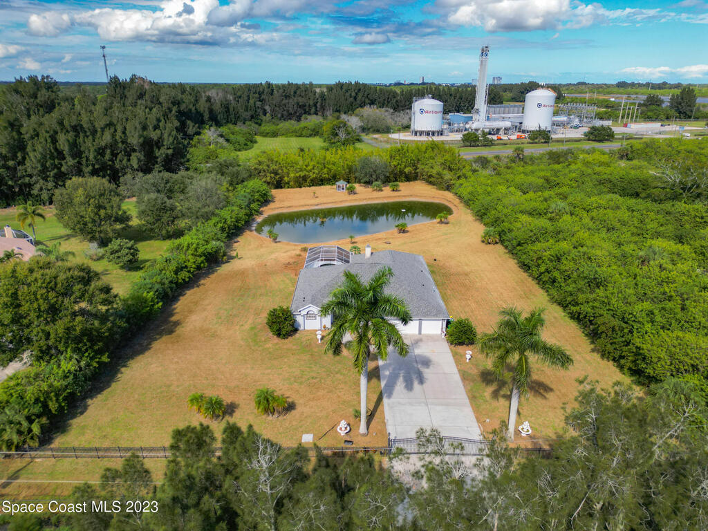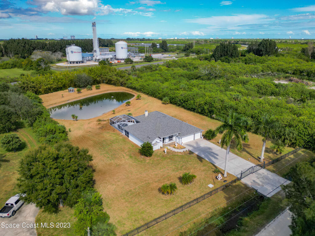 This spacious residence offers 4 bedrooms and 3 bathrooms. It features an open concept family room with fireplace and kitchen, split bedroom floor plan, formal living and dining rooms, gourmet kitchen and a 3-car garage for all of your toys! This private oasis is situated on 2 acres of tropical paradise, including your own pond! Needs paint and a few touches to make it a premier residence. Priced to sell all while located minutes from the 528 & Space X.