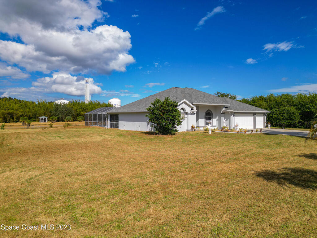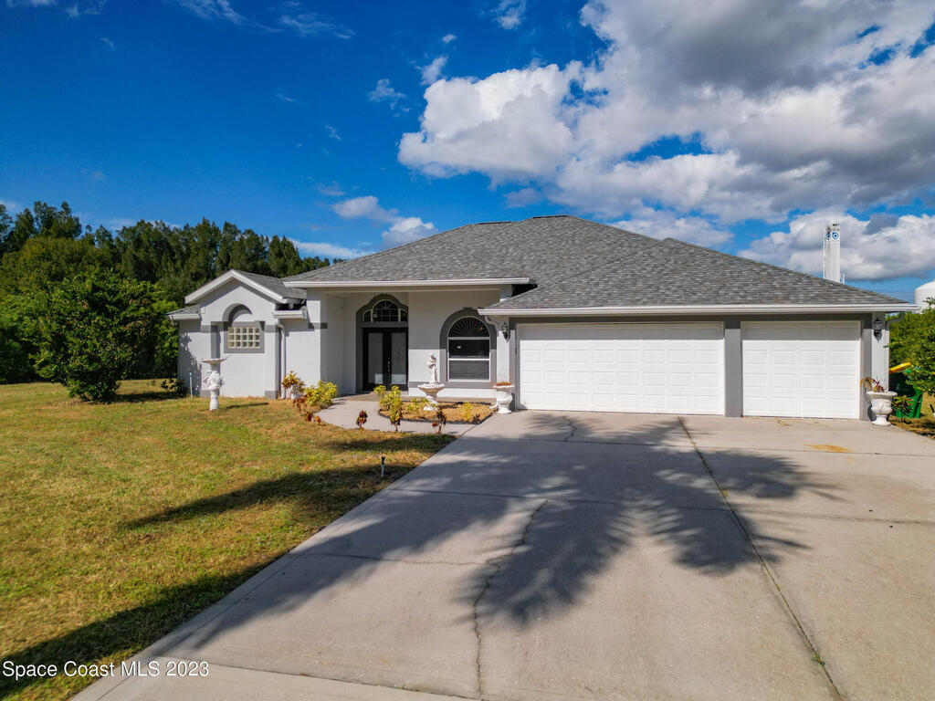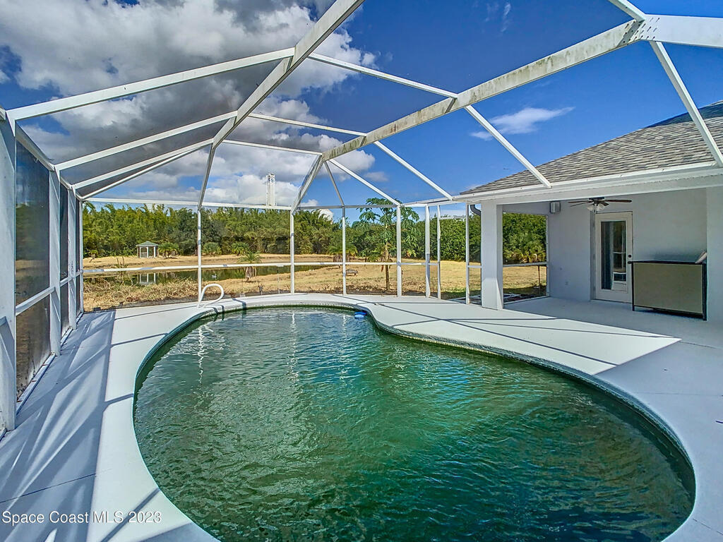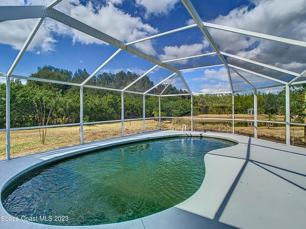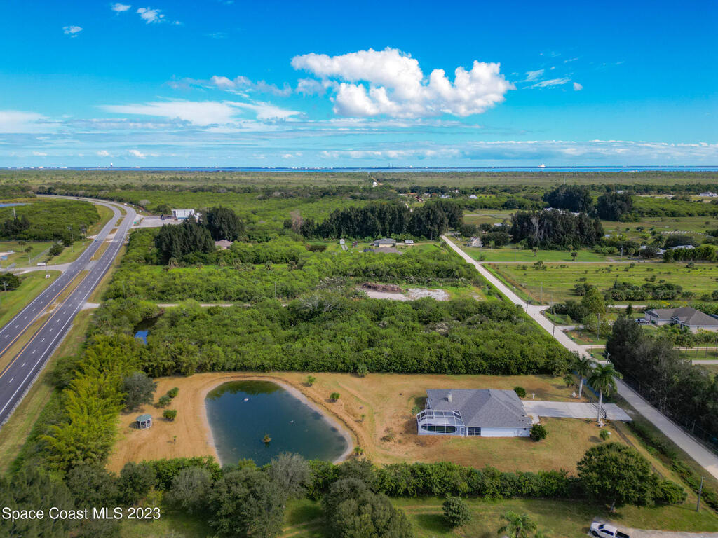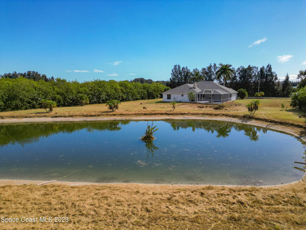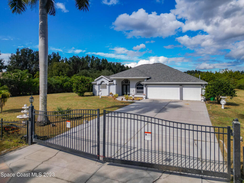 This spacious residence offers 4 bedrooms and 3 bathrooms. It features an open concept family room with fireplace and kitchen, split bedroom floor plan, formal living and dining rooms, gourmet kitchen and a 3-car garage for all of your toys! This private oasis is situated on 2 acres of tropical paradise, including your own pond! Needs paint and a few touches to make it a premier residence. Priced to sell all while located minutes from the 528 & Space X.