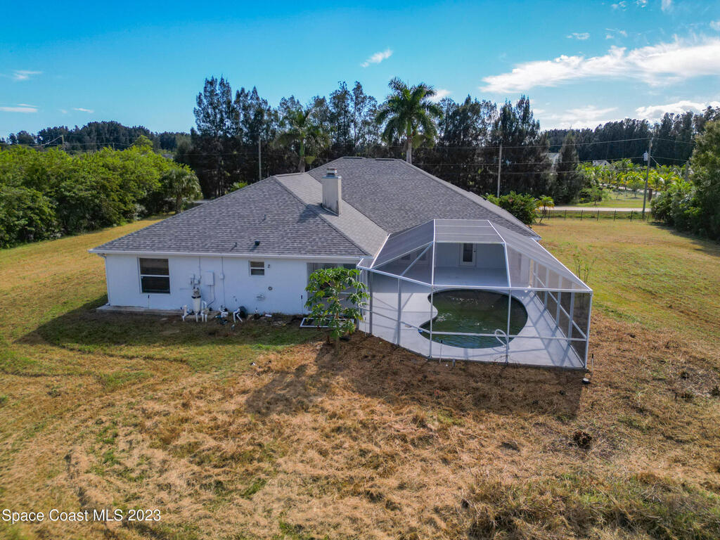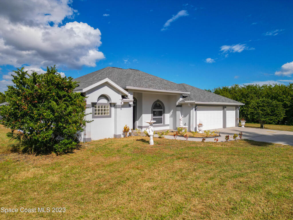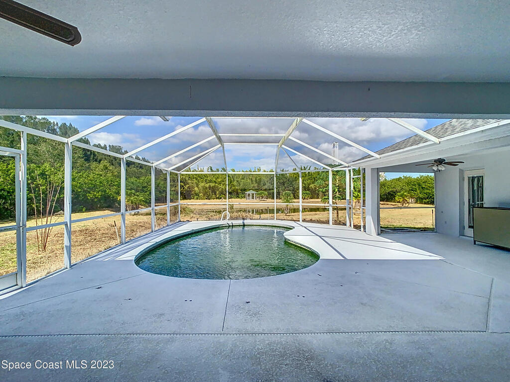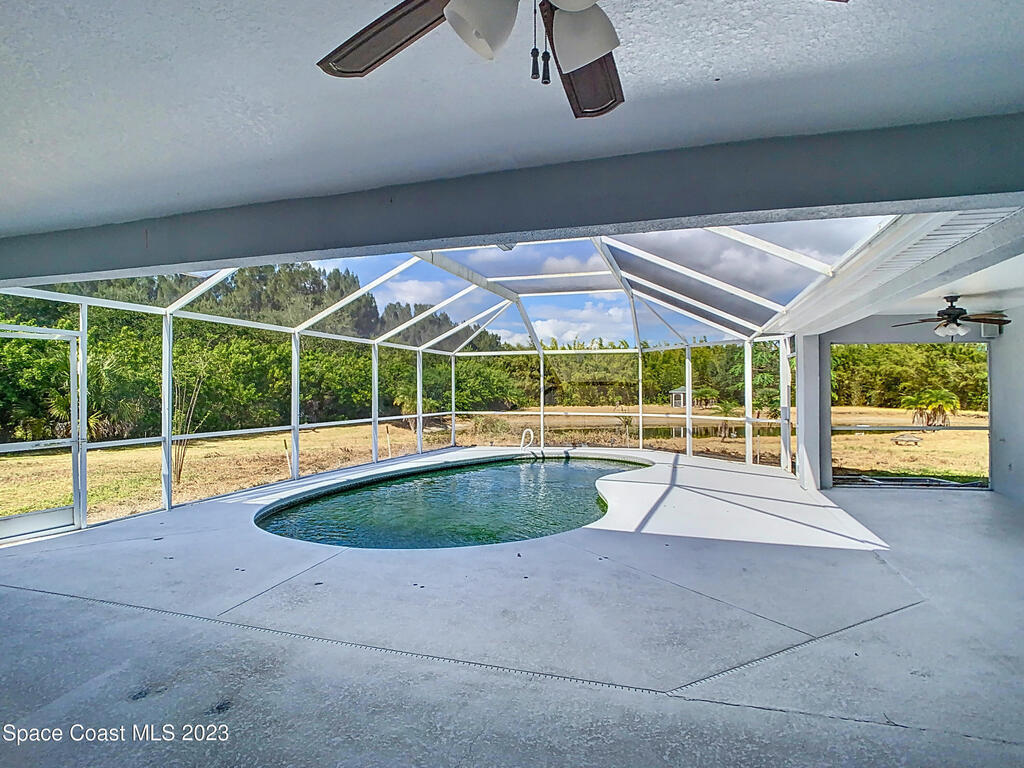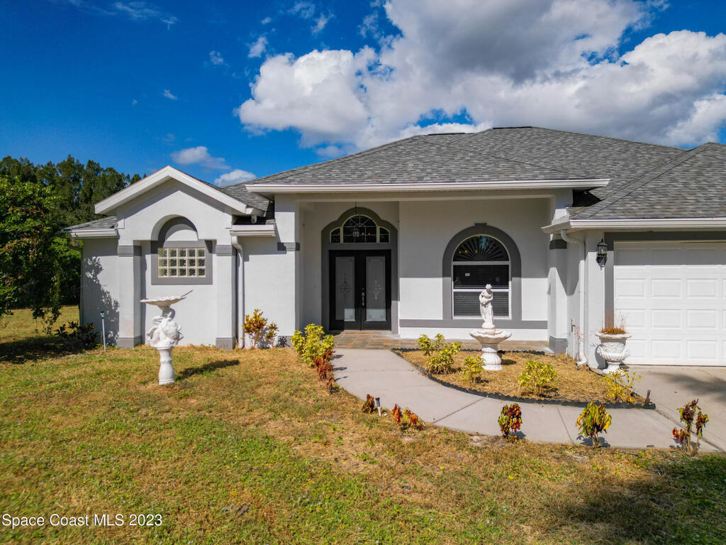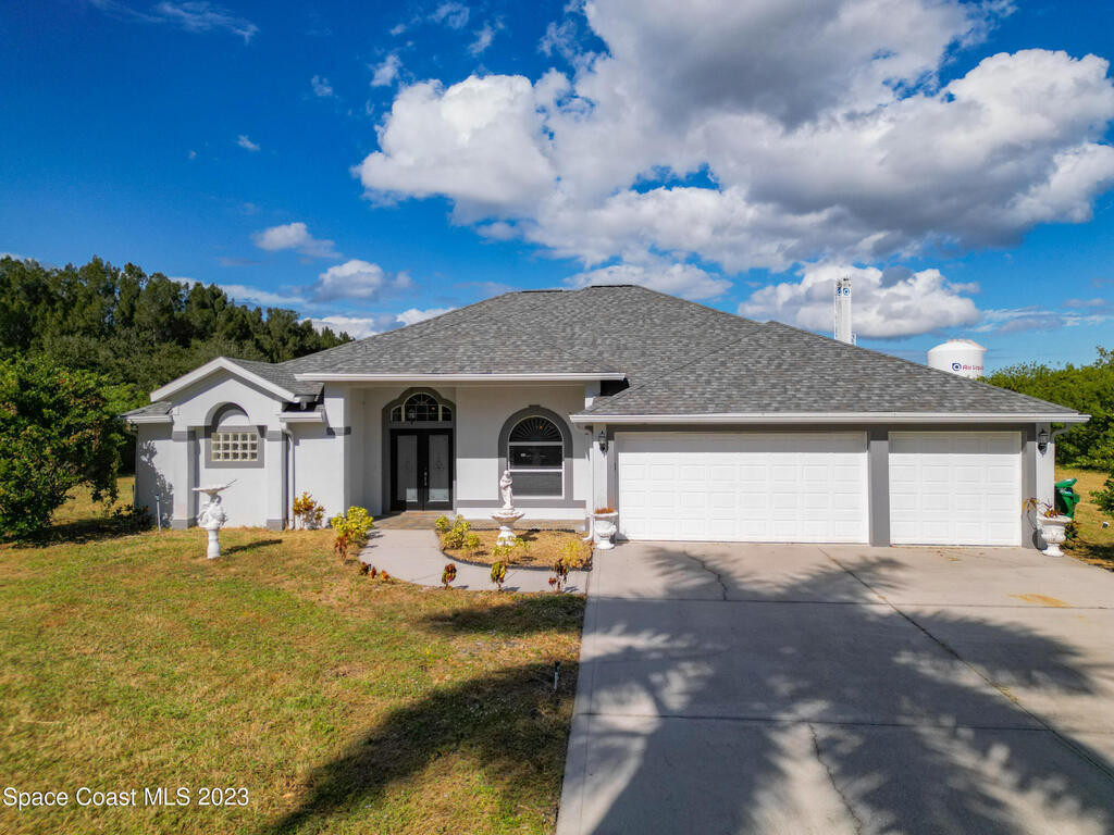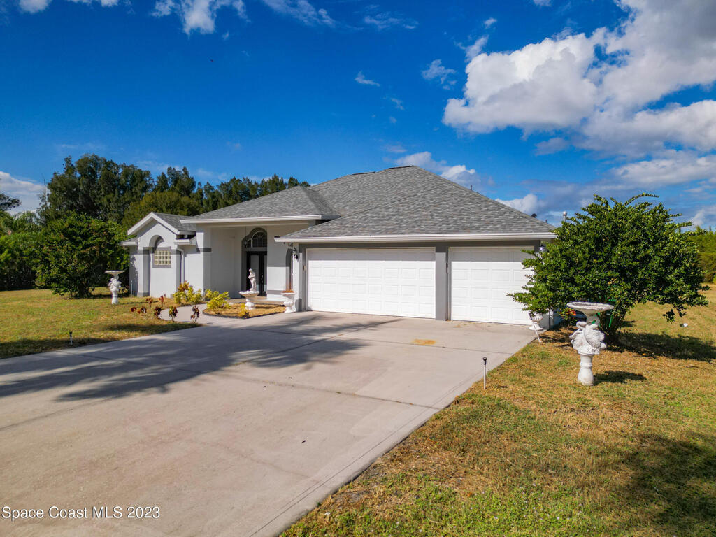 This spacious residence offers 4 bedrooms and 3 bathrooms. It features an open concept family room with fireplace and kitchen, split bedroom floor plan, formal living and dining rooms, gourmet kitchen and a 3-car garage for all of your toys! This private oasis is situated on 2 acres of tropical paradise, including your own pond! Needs paint and a few touches to make it a premier residence. Priced to sell all while located minutes from the 528 & Space X.