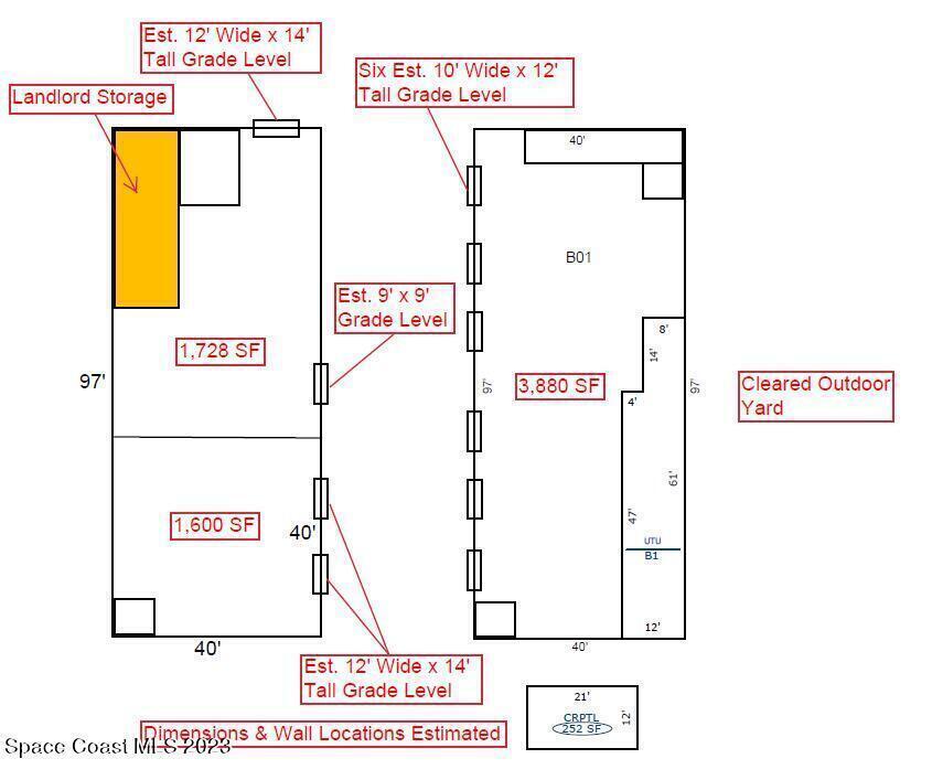 Excellent opportunity to lease 7,208 SF of concrete block warehouse with a YARD in the heart of West Melbourne! Interior has concrete flooring and 14' - 16' +/- clear ceiling height throughout. Total of 10 grade level overhead doors. Utilities include 3-phase FPL electric & City Water/Sewer. Building is gated & fenced. Adjacent yard to the east is included in the lease. M-2 Zoning permits: Warehousing, Manufacturing, Storage Yards, Automotive & more! Property can be sub-divided into a 1,728 SF unit, a 3,880 SF unit, or a 5,480 SF unit. Interstate 95 is approximately 2-miles to the west. Close proximity to the Melbourne International Airport, L3Harris, Northrop Grumman, and all of the other employers in the area. Make this the future home for your business today!