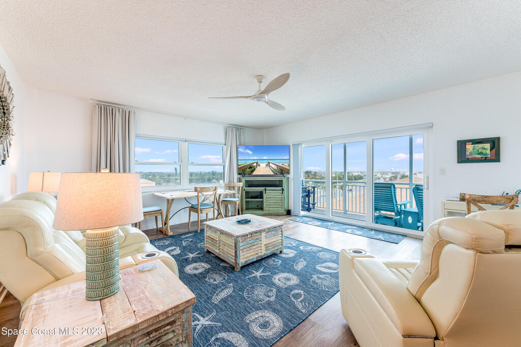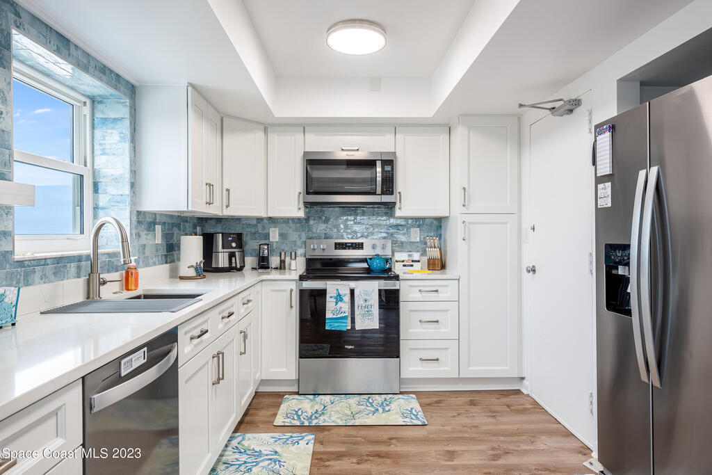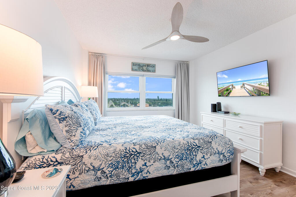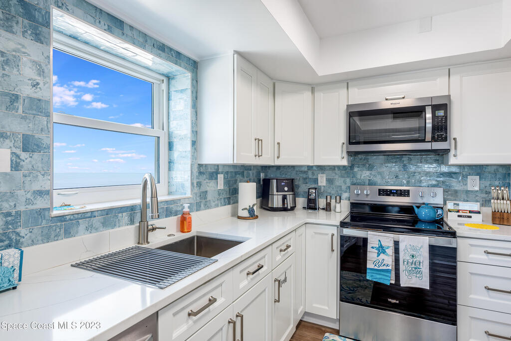Relax and enjoy unparalleled ocean-to-river views from this top floor end unit in Satellite Beach, FL. Completely remodeled in 2023, updates include a chic gourmet kitchen with quartz countertops, custom cabinetry, glass tile backsplash and new appliances. New flooring, electrical, plumbing, A/C, impact glass windows & doors throughout. The Sandpiper is one of few oceanfront complexes on Florida's Space Coast with absolutely no rental restrictions. Daily, weekly monthly AirBnBs, VRBOs and STRs are allowed, AND there's no leasing office here to take a percentage of your revenue. Reasonable monthly condo fee covers internet, cable TV, water/sewer, exterior maintenance & insurance, trash pickup, pest control and access to building amenities. Seller has paid all active assessments.