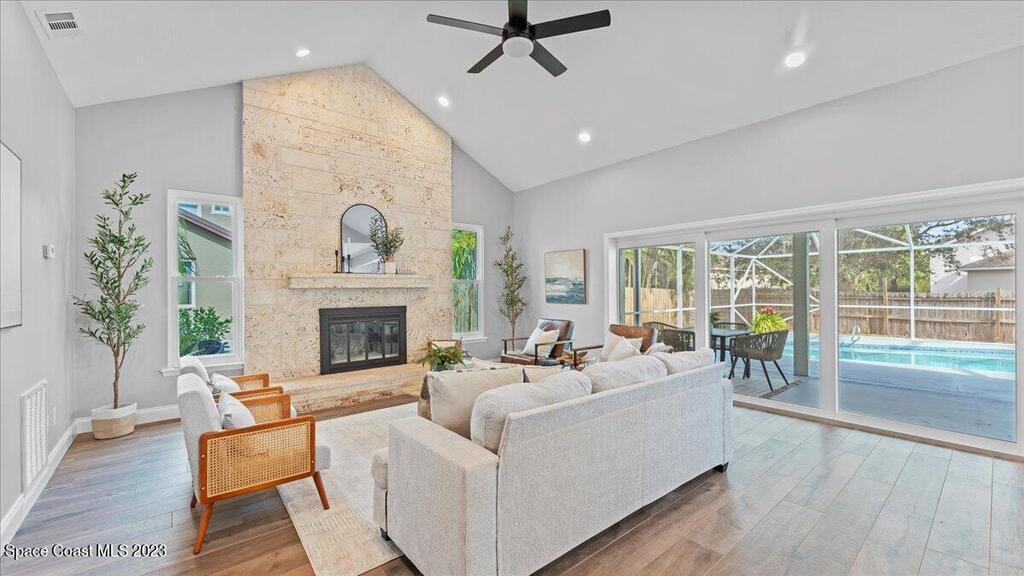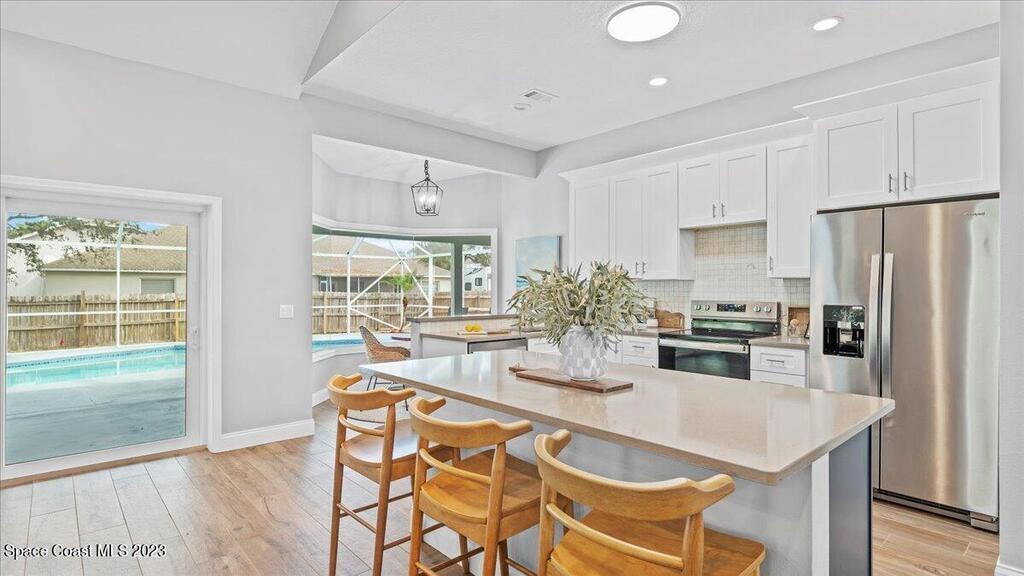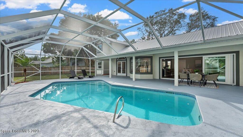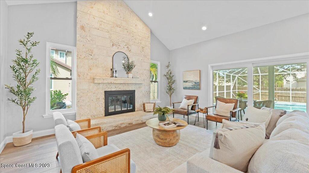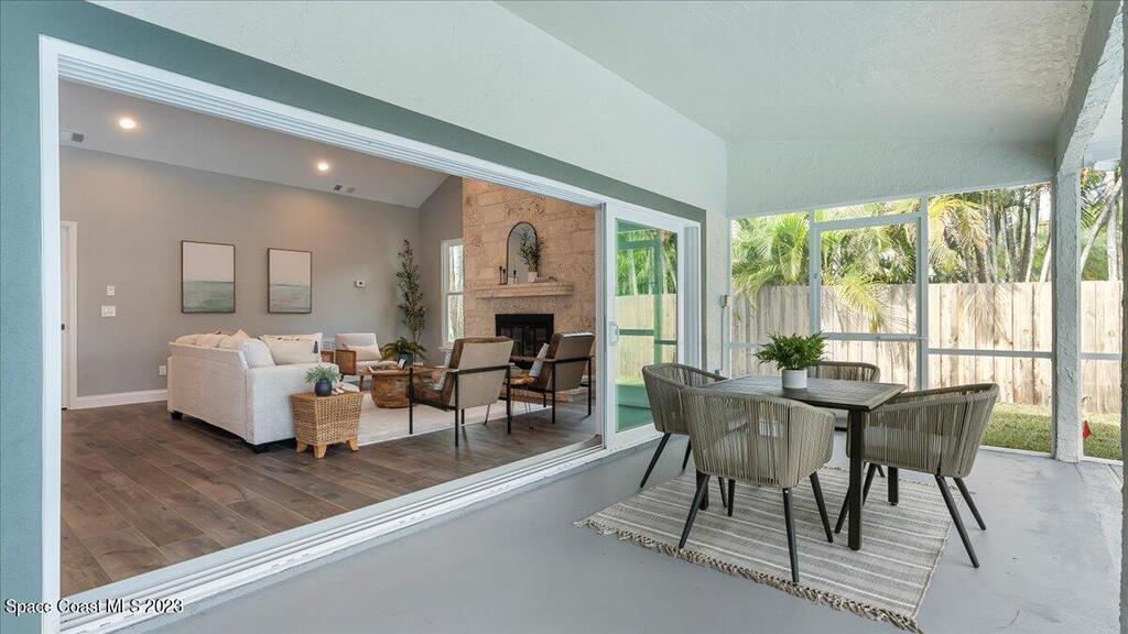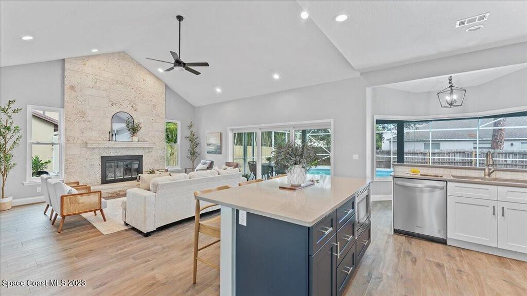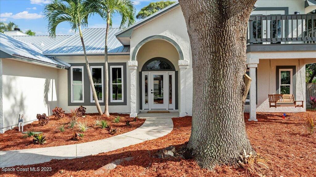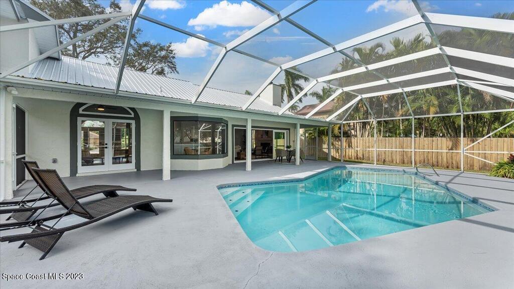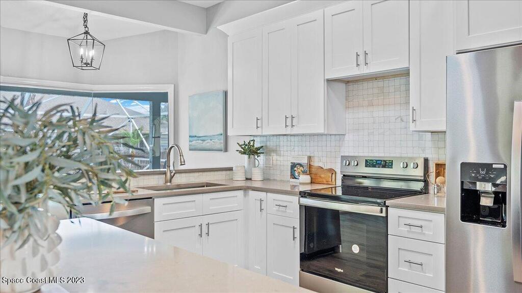 Nestled between the Banana River and Sykes Creek, on a quiet dead-end street, this completely remodeled, pool home boasts modern updates throughout! Main 4 points are all new in 2023, Metal roof, impact windows, 2 AC's, and WH! The new kitchen has Whirlpool stainless appliances, white cabinets with a nice contrasting navy island, quartz countertops and a breakfast nook. It is open to the family room which has an impressive coquina fireplace as the focal point along with a triple collapsible impact slider that allows an abundance of light, and the outside, to flow in. With wood look tile flooring, impact windows/doors, new paint inside/out, all new lighting/ceiling fans, interior doors, and fully remodeled bathrooms there is no honey-do list!