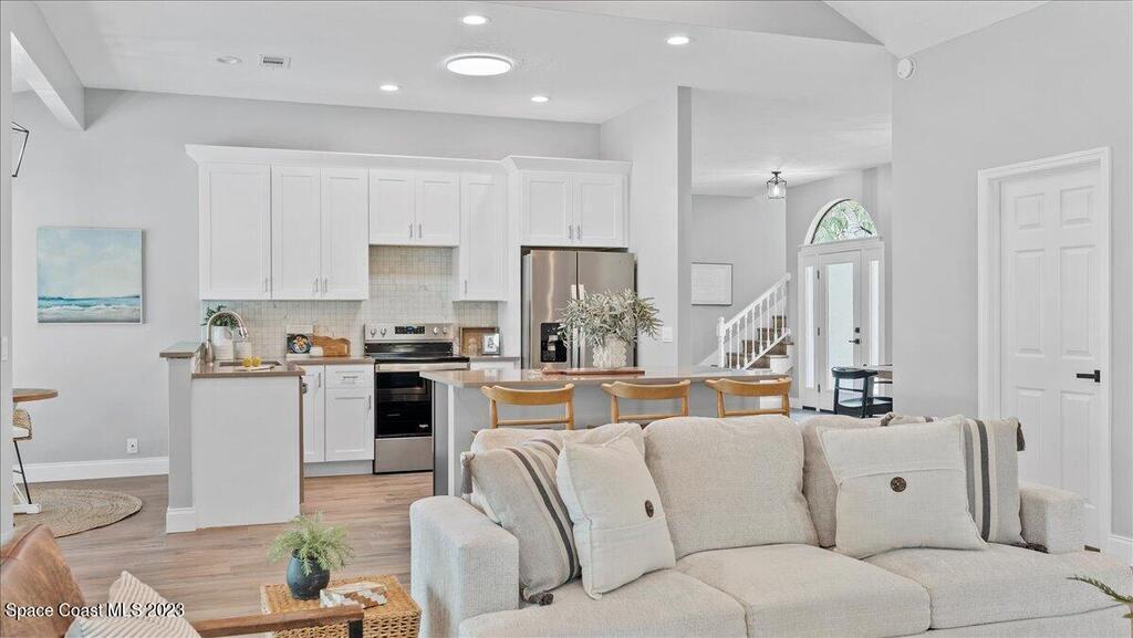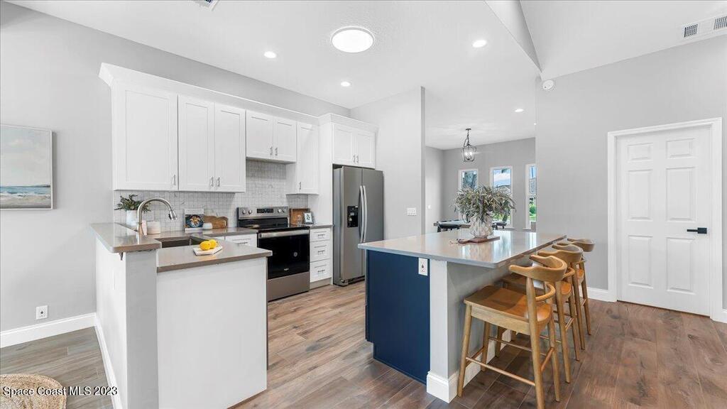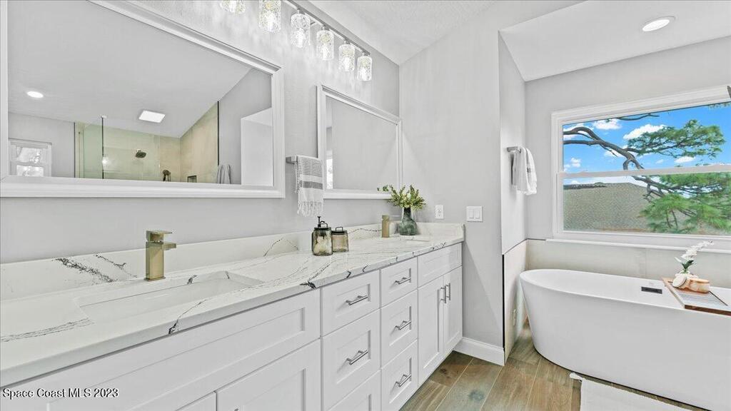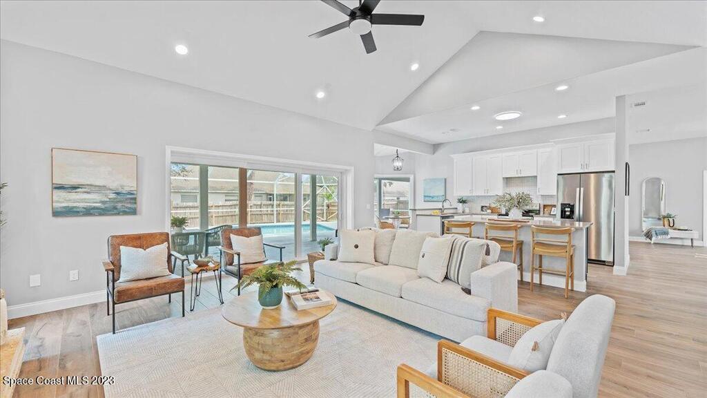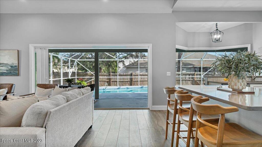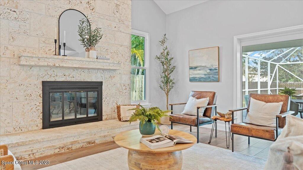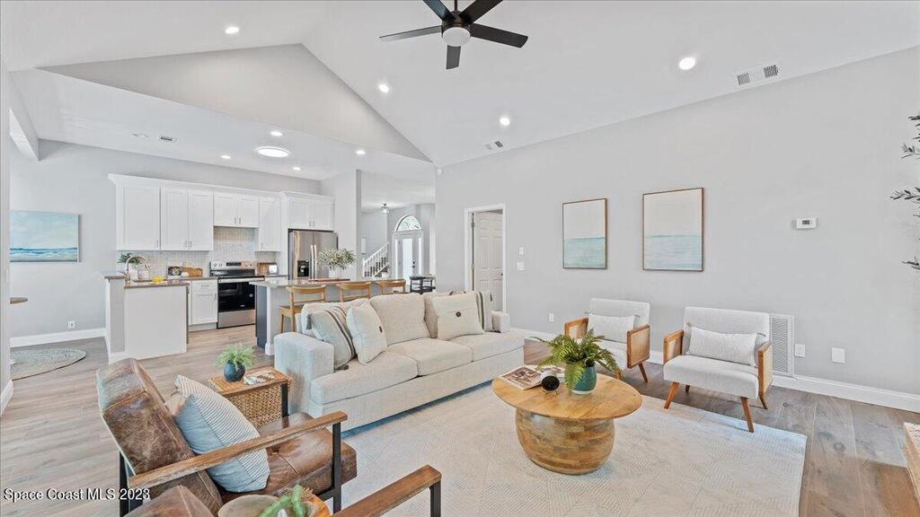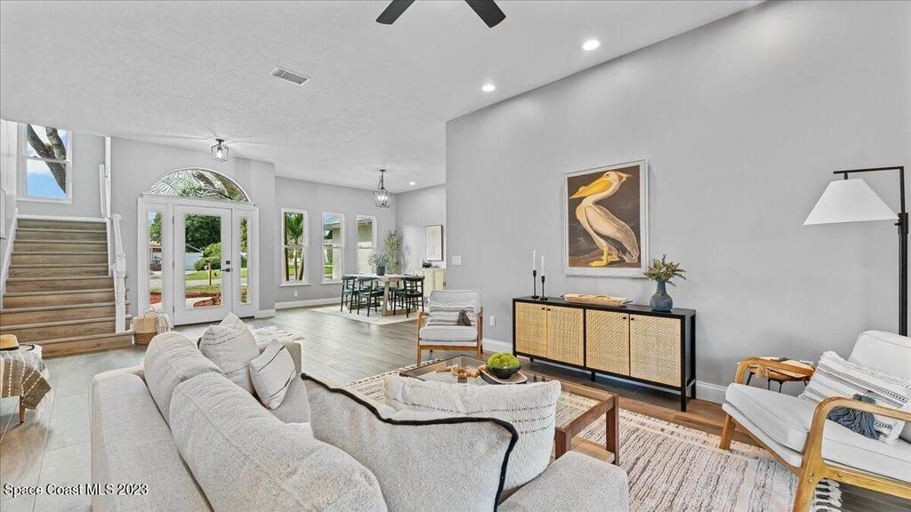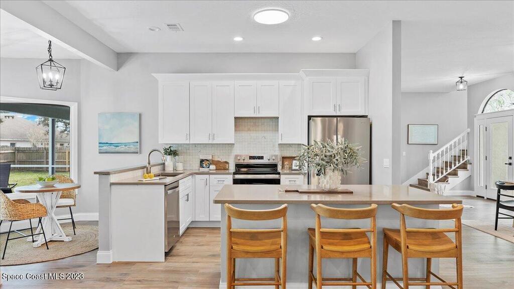 Nestled between the Banana River and Sykes Creek, on a quiet dead-end street, this completely remodeled, pool home boasts modern updates throughout! Main 4 points are all new in 2023, Metal roof, impact windows, 2 AC's, and WH! The new kitchen has Whirlpool stainless appliances, white cabinets with a nice contrasting navy island, quartz countertops and a breakfast nook. It is open to the family room which has an impressive coquina fireplace as the focal point along with a triple collapsible impact slider that allows an abundance of light, and the outside, to flow in. With wood look tile flooring, impact windows/doors, new paint inside/out, all new lighting/ceiling fans, interior doors, and fully remodeled bathrooms there is no honey-do list!