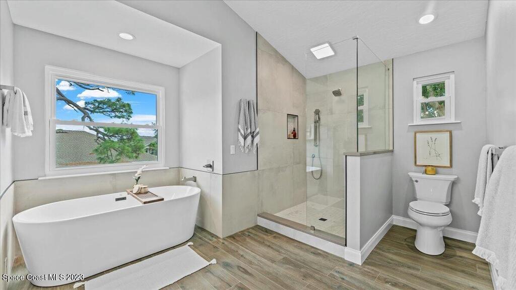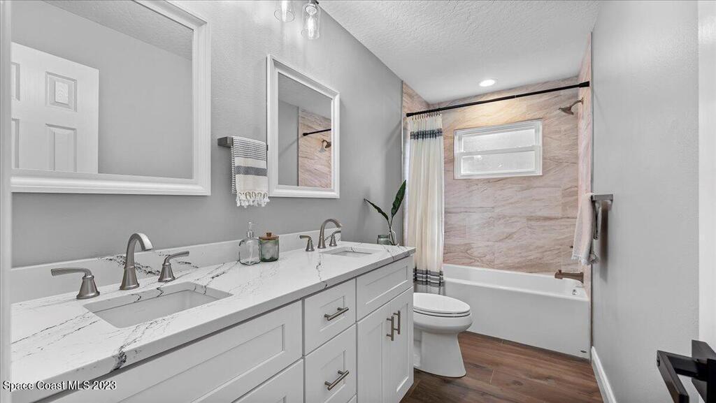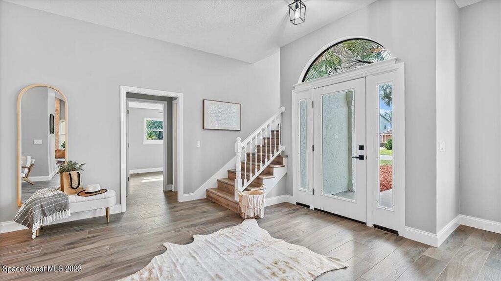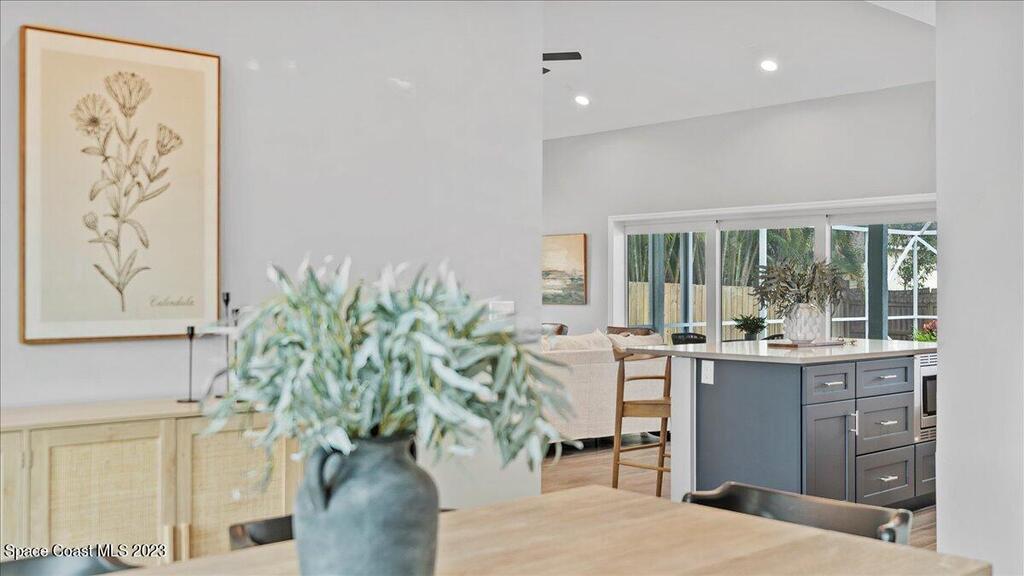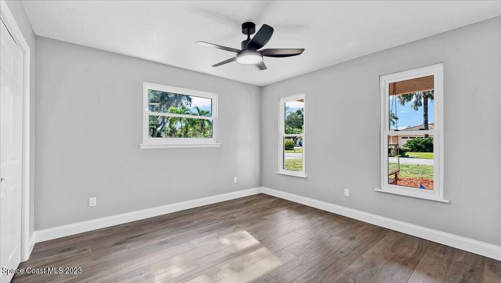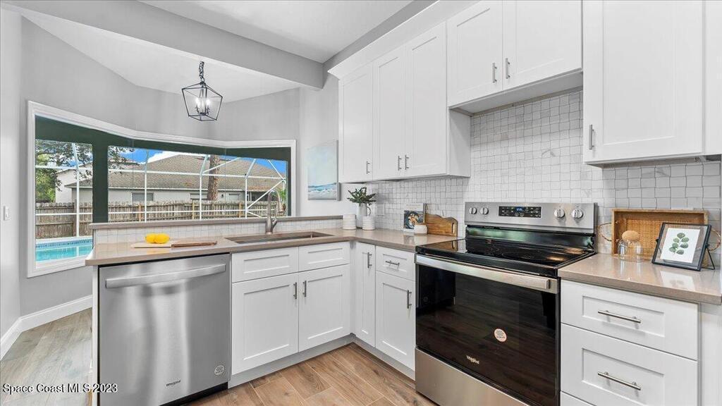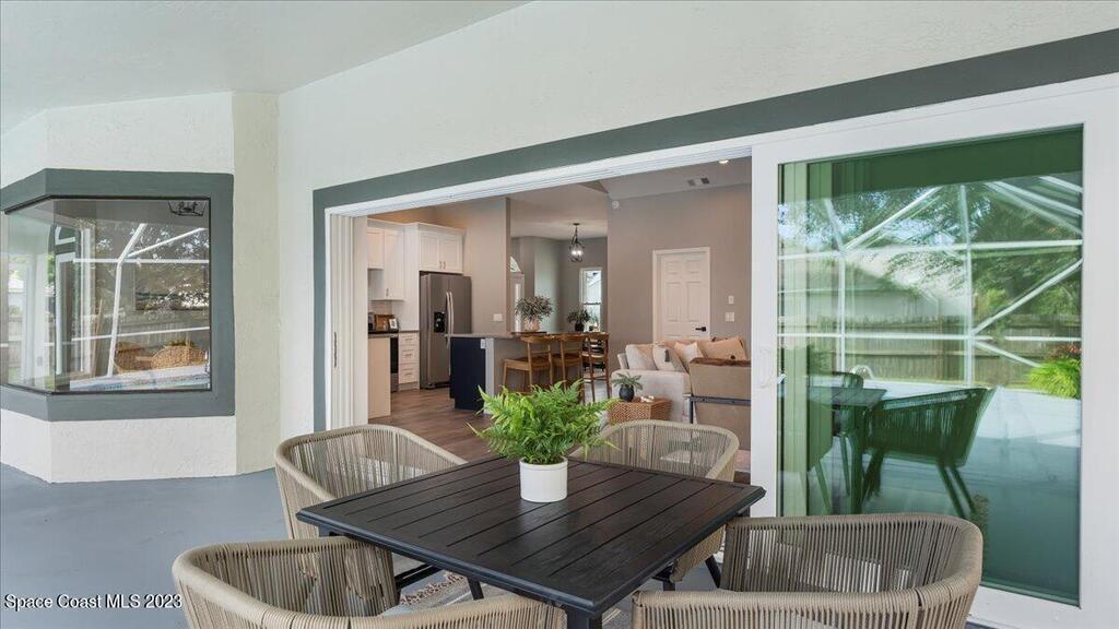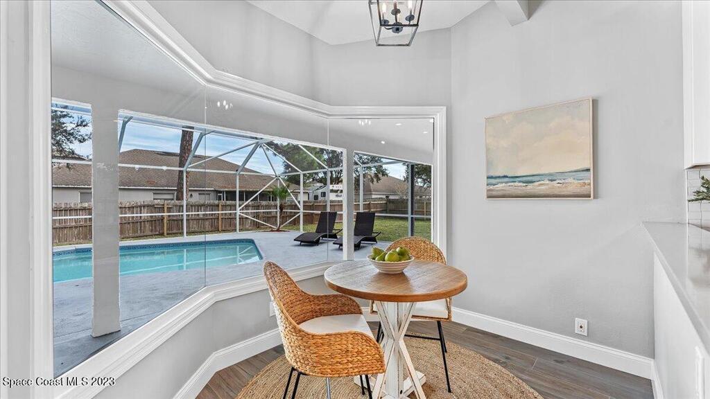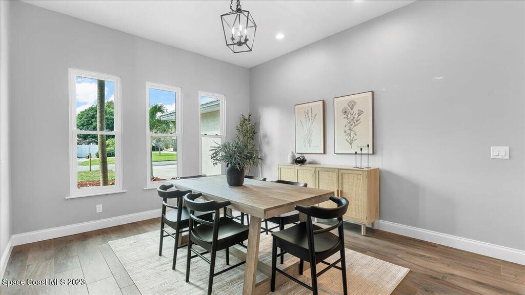 Nestled between the Banana River and Sykes Creek, on a quiet dead-end street, this completely remodeled, pool home boasts modern updates throughout! Main 4 points are all new in 2023, Metal roof, impact windows, 2 AC's, and WH! The new kitchen has Whirlpool stainless appliances, white cabinets with a nice contrasting navy island, quartz countertops and a breakfast nook. It is open to the family room which has an impressive coquina fireplace as the focal point along with a triple collapsible impact slider that allows an abundance of light, and the outside, to flow in. With wood look tile flooring, impact windows/doors, new paint inside/out, all new lighting/ceiling fans, interior doors, and fully remodeled bathrooms there is no honey-do list!