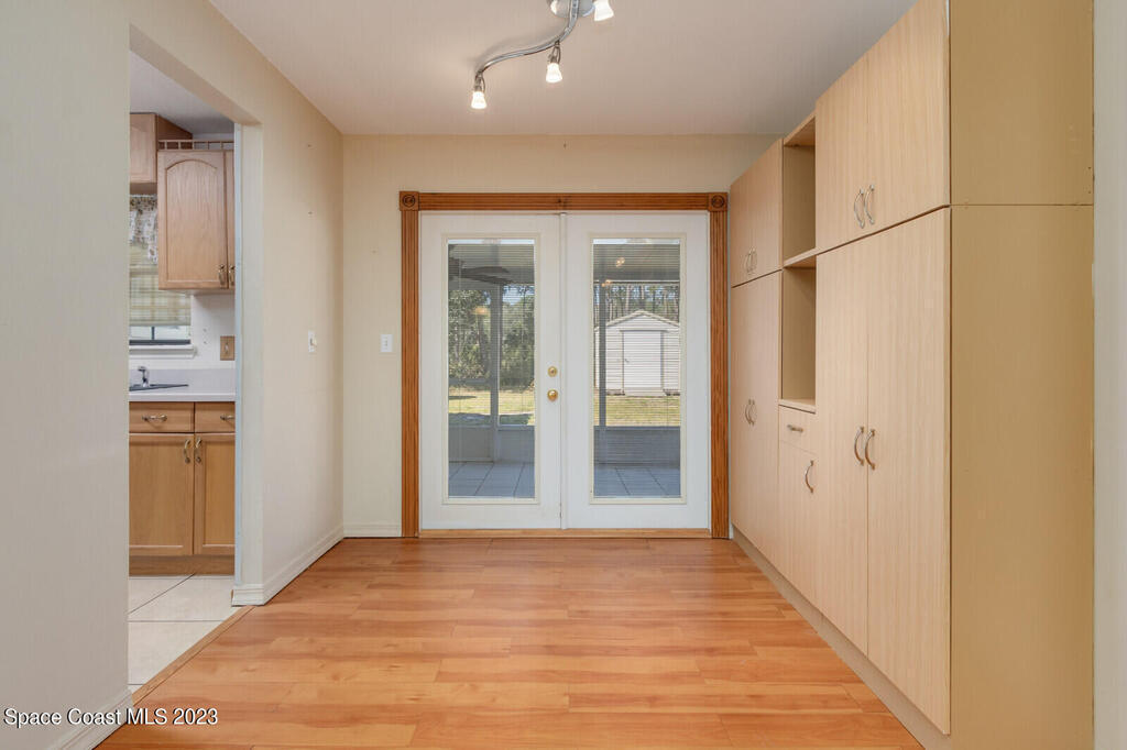 This charming 3 bed 2 bath home is located on a .29 quiet desirable corner lot with room for RV parking. Living room features a wall of bookshelves. Dining room has french doors giving access to the covered screen lanai to enjoy the private back yard. Kitchen with breakfast bar overlooks family room making it great for entertaining friends & family. Home boasts lots of storage and no carpet! The 2 sheds convey (1 w/electricity) adding more storage and workspace. 2 car garage has been converted partially to a large laundry/workspace/storage area, remainder portion of garage is used as a workshop. Wall can be removed to restore back for a 2 car garage use.