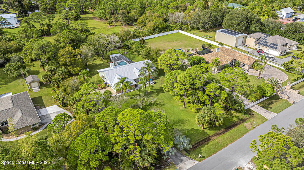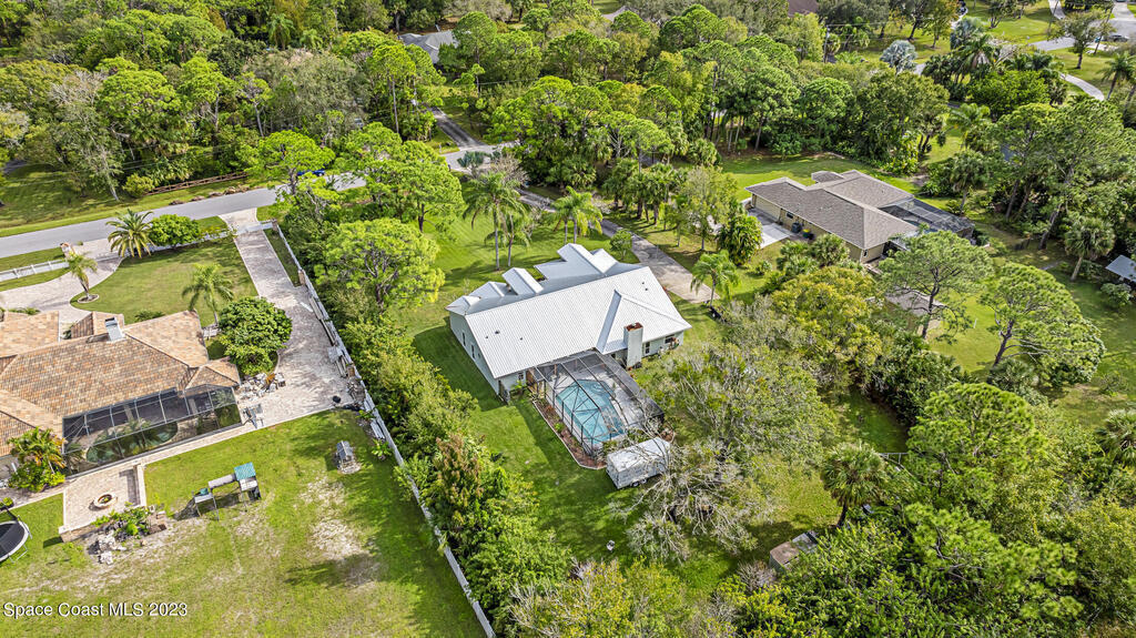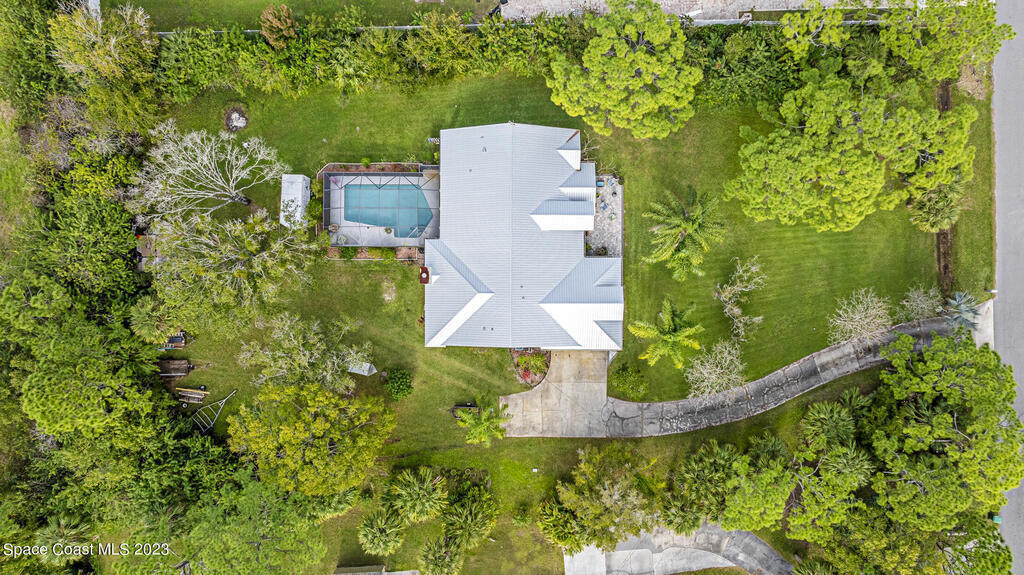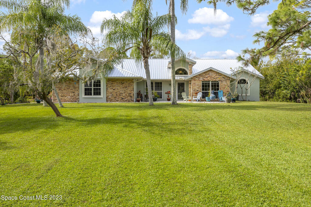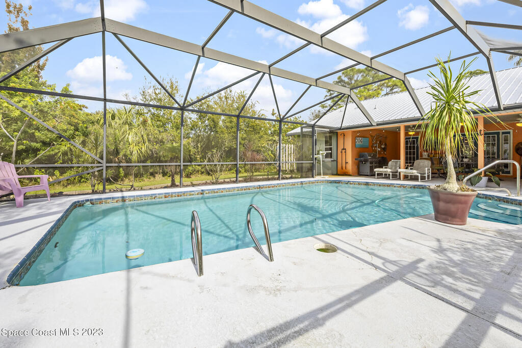 Motivated Seller! Paint Credit Available with Accepted Contract. NEW 2023 Metal Roof, Plumbing AND Water Heater! Location and Land! If that's what you seek, this hidden gem is for you! Tucked away on a peaceful cul-de-sac in a quiet neighborhood off Turtle Mound, this home has a 4/2 split pan and offers a comfortable space to entertain family and friends. Cozy up with the warmth coming from your fireplace on a cool night, and enjoy a refreshing dip in the pool on a hot day. The NEW paver patio up front offers another great space to relax while enjoying the peaceful sounds of nature and the neighbors horses, goats and roosters. You'll likely forget how centrally located you are - just 15 minutes to the beach, Viera, and the Hammock Landing in Palm Bay! This home sits on an attractive one acre lot with plenty of trees. Ample space for your boat or RV!