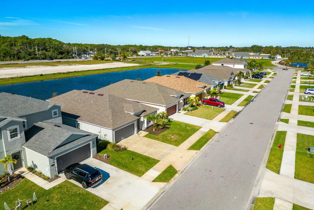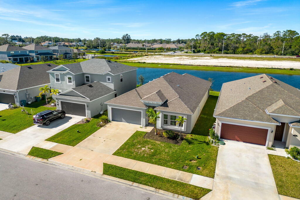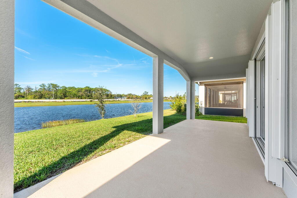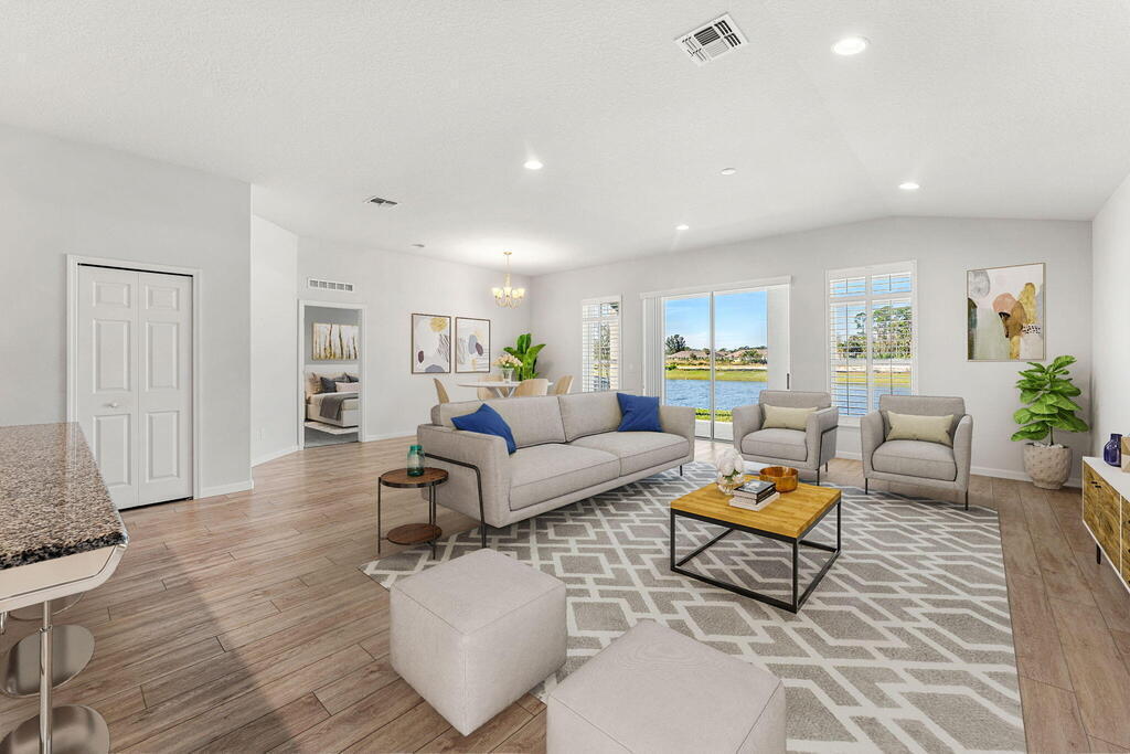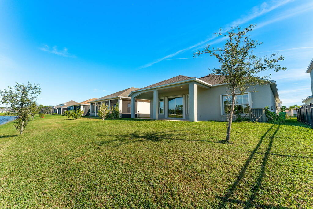 This lakefront lassie boasts 2019 construction & charming modern features. Wood-look solid surface floors & plantation shutters sweep through the bright, open great rm plan. The generous living & dining expanse spills into a granite island kitchen stocked w/SS appliances, taupe-colored cabinetry & a walk-in pantry. The island's seating is ideal for parties & after-school snacks. A slider off the great rm leads to a breezy lanai & lakeside views, perfect for indoor/outdoor entertaining. Relax in the sizable primary retreat replete w/a walk-in closet, double sinks & tiled shower. At the front of the home, 2 extra bdrms & the tub/shower bath are situated together as ample accommodations for kids or guests. The 4th bdrm would be great as a playroom or office. Washer & dryer included!