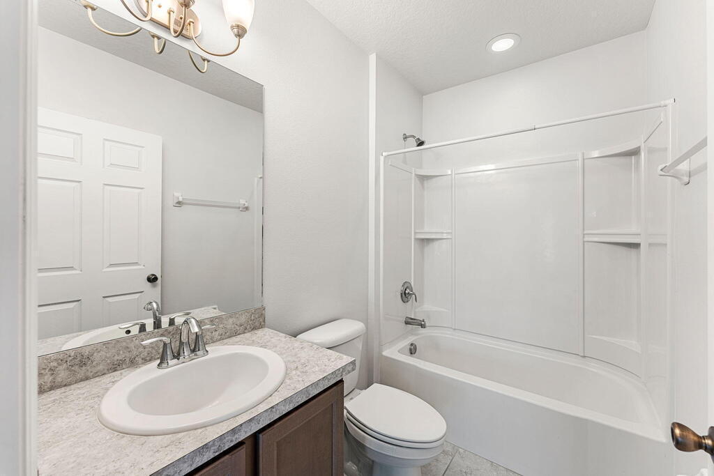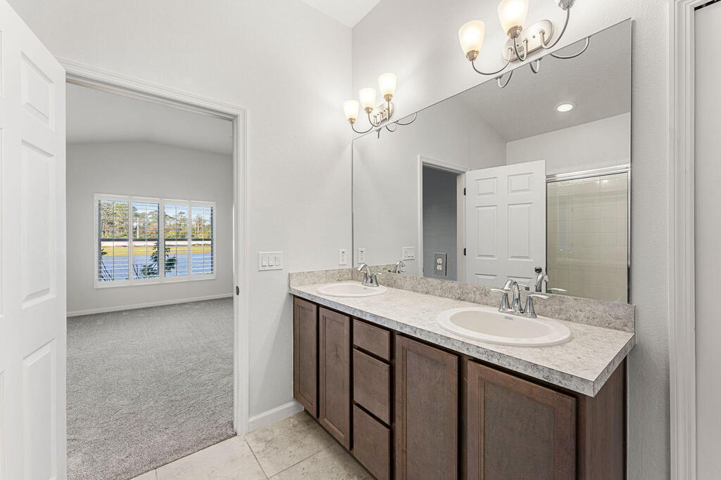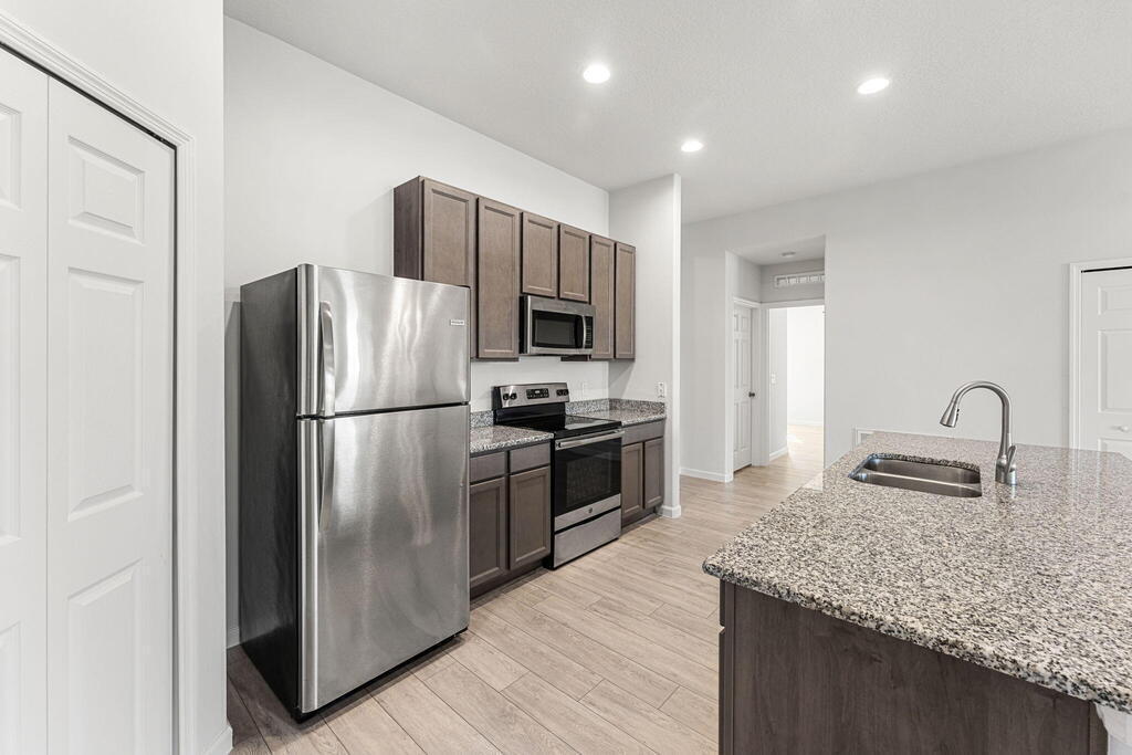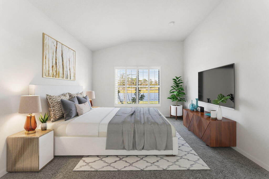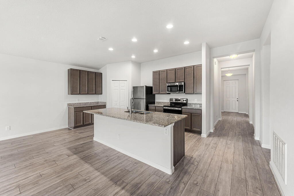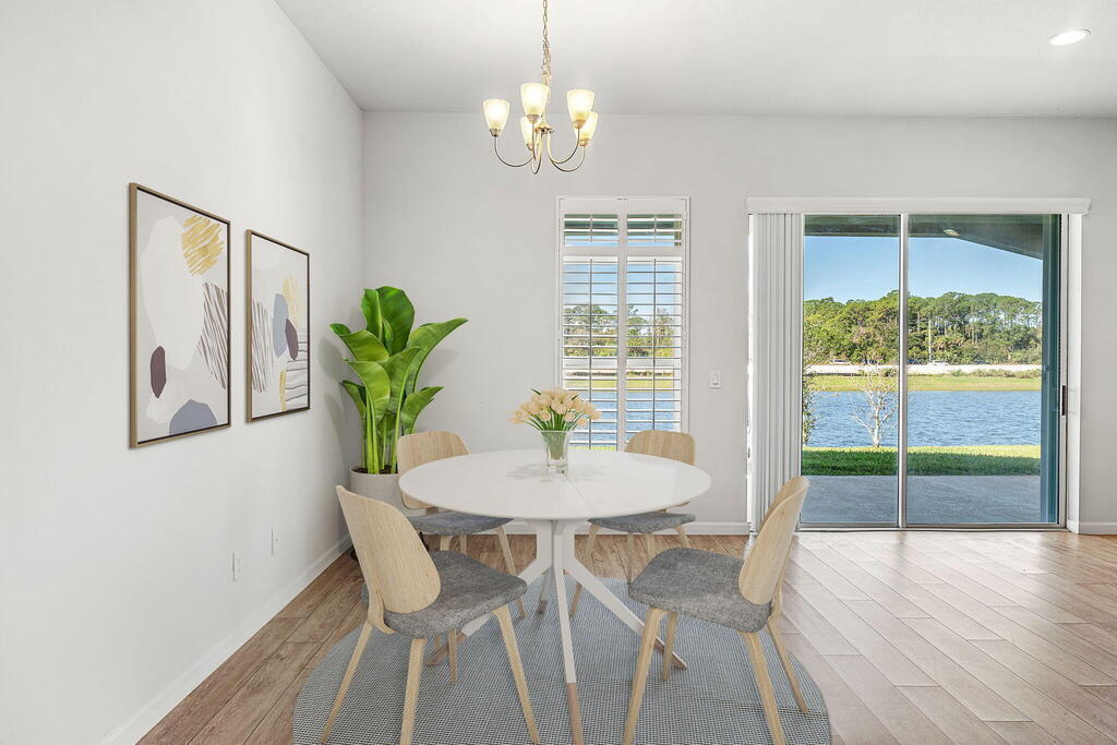 This lakefront lassie boasts 2019 construction & charming modern features. Wood-look solid surface floors & plantation shutters sweep through the bright, open great rm plan. The generous living & dining expanse spills into a granite island kitchen stocked w/SS appliances, taupe-colored cabinetry & a walk-in pantry. The island's seating is ideal for parties & after-school snacks. A slider off the great rm leads to a breezy lanai & lakeside views, perfect for indoor/outdoor entertaining. Relax in the sizable primary retreat replete w/a walk-in closet, double sinks & tiled shower. At the front of the home, 2 extra bdrms & the tub/shower bath are situated together as ample accommodations for kids or guests. The 4th bdrm would be great as a playroom or office. Washer & dryer included!