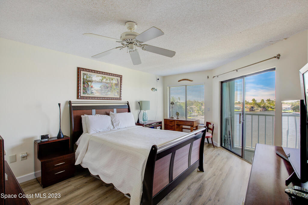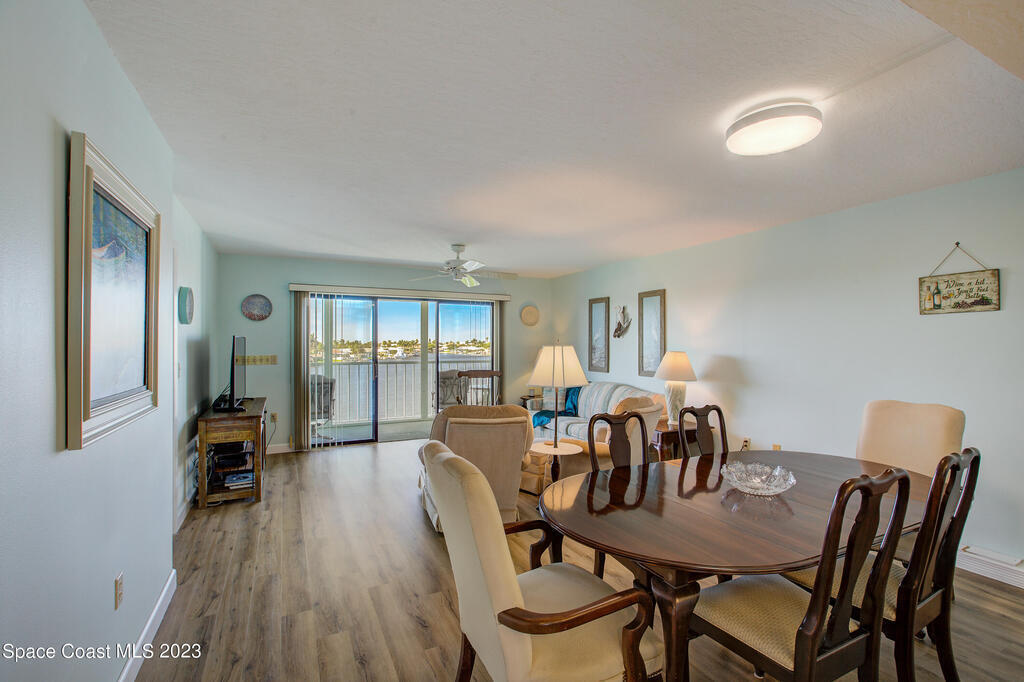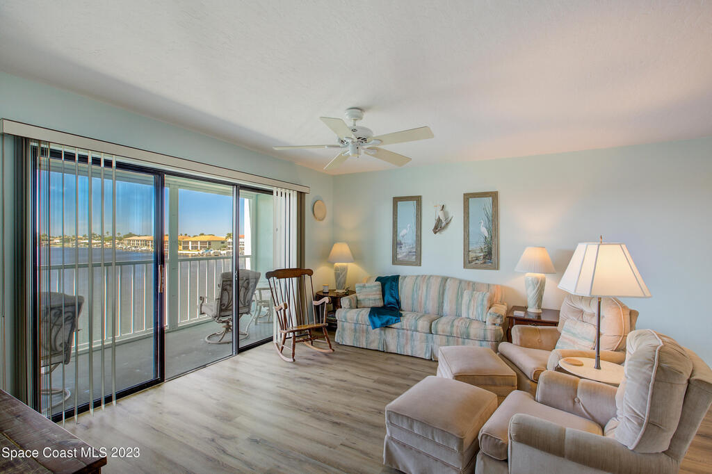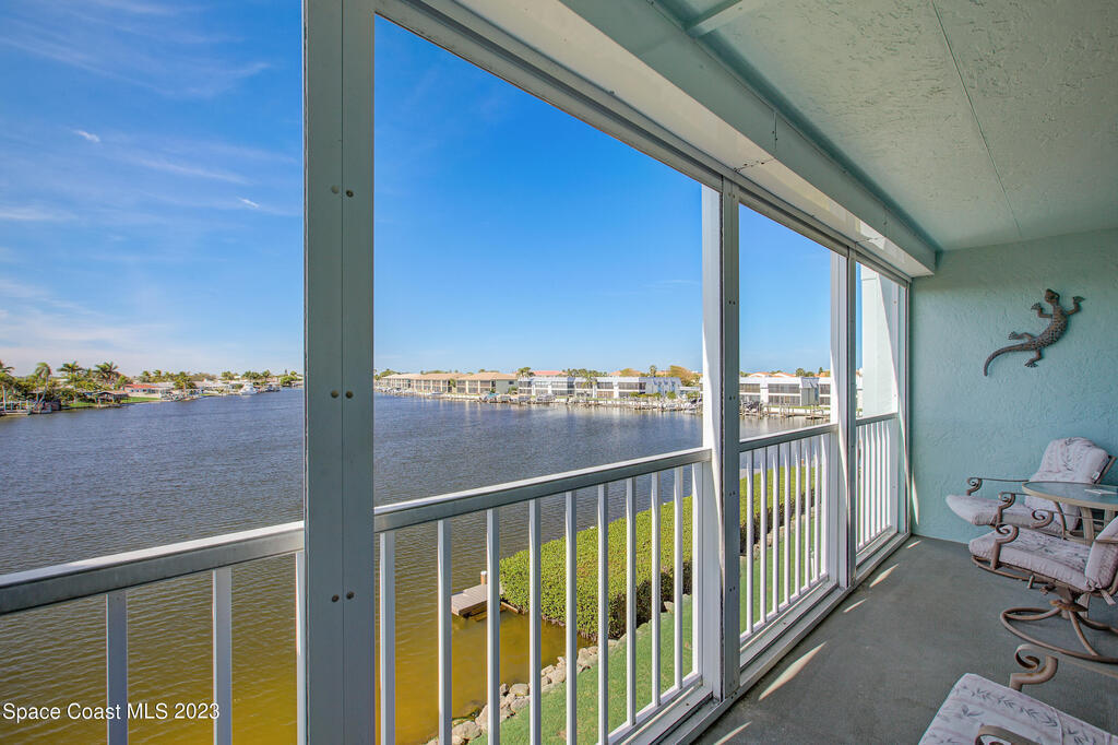 You won't want to miss the AMAZING DIRECT WATERFRONT VIEWS from this 2 Bed, 2 Bath unit. Watch the boats pass by, dolphins swimming & manatees hanging out in the water from your private screened patio. Spectacular sunsets can be viewed from the kitchen, living area, primary bedroom & patio. The charming eat in kitchen opens to the living/dining area which flows seemlessly into the bedrooms with a light coastal plank floor. The primary bedroom boasts generous natural light & access to your screened patio. You'll also enjoy access to the community dock, beautiful pool, hot tub, shuffleboard, tennis court & more! Fantastic location, you are walking distance to the beach, restaurants, grocery store, shopping & parks. Secure building with a 1 car garage and separate storage area under building