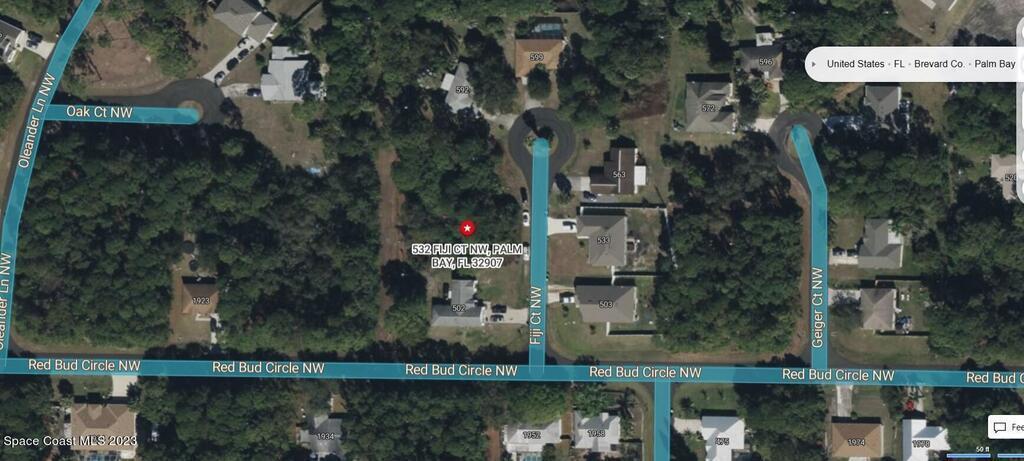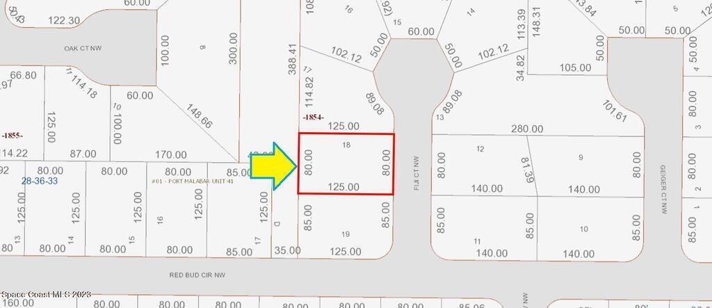 0.23 acre buildable residential lot available in Port Malabar Unit 41 of Palm Bay. Located in the northwest section, this lot has a drainage right-of-way easement canal in the rear allowing more privacy, and is just 3.1 miles - 7 minutes to Heritage High School, 4.8 miles - 12 minutes to the Winn Dixie Supermarket, 15.4 miles - 26 minutes to Melbourne Airport, and 16.2 miles - 37 minutes to the beaches of Indialantic. From exit #180 of I-95 go west on US-192 for .5 miles, left on St Johns Heritage Parkway for 6.1 miles, left on Malabar Road for 1.3 miles, left on Krassner Drive for 1.1 miles, right on Holly Avenue for .1 mile, left on Red Bud Circle, and right on Fiji Court. The lot will be on your left.