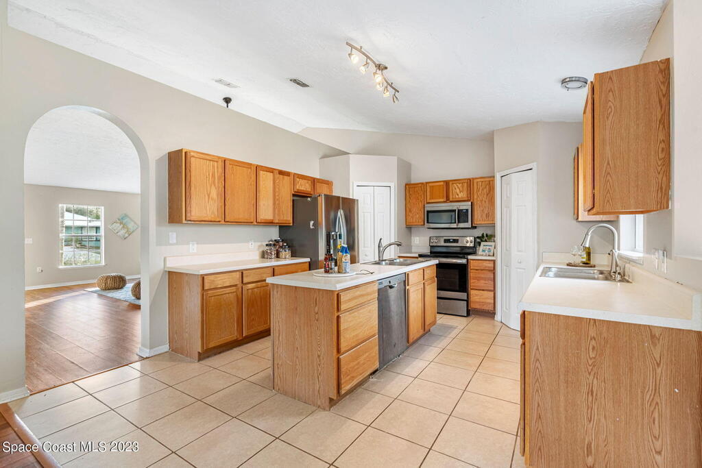 CHECK IT OUT! This attractive abode exhibits a two-year-old a/c & water heater, along w/a BRAND NEW washer, dryer & stainless steel appliances! Vaulted ceilings arc over luxury vinyl plank & tile floors, as they sweep through open spaces defined by arched doorways. Art niches w/custom lighting accent the formal living & dining expanse. A family room & the casual dining area flow into an island kitchen flaunting the shiny NEW SS appliances, two full-size sinks & double pantries. The owner's suite is enhanced w/dual walk-in closets, a soaking tub & separate shower. Across the home are the two extra bedrooms & the 2nd tub/shower bath. A hallway closet discreetly houses the NEW washer & dryer set. Enjoy outdoor celebrations on a breezy open-air patio overlooking a grassy, sunlit backyard!