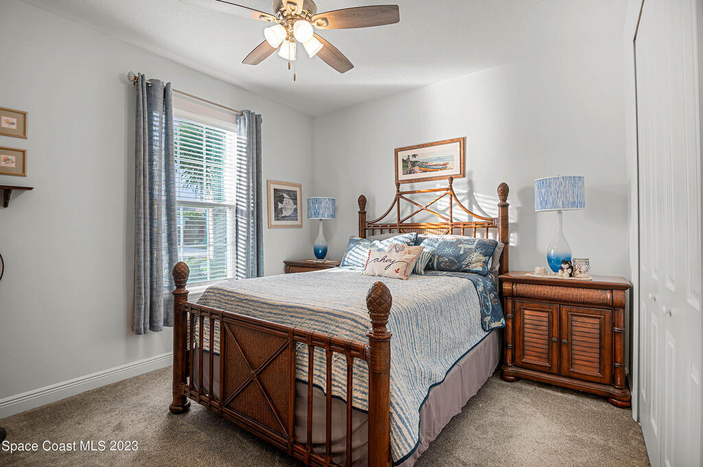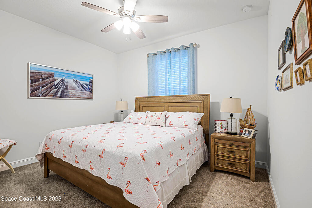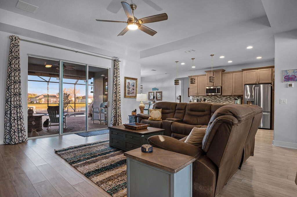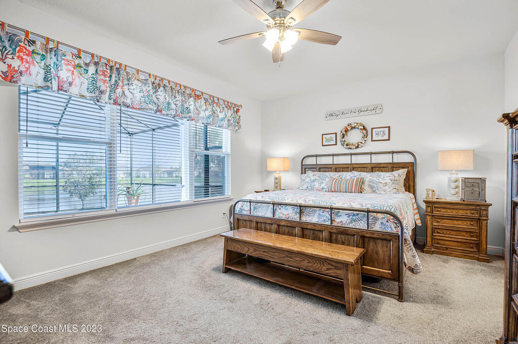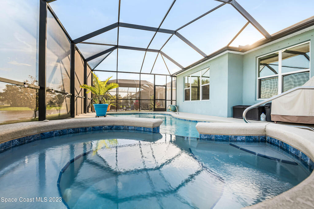 Beautiful, move-in ready lakefront home with four bedrooms, three baths, a 3-car garage, and an electric heated spa and pool with many upgrades (too many to list; please see attached upgrades list)! The house is in the gated Country Club Estates community of Palm Bay. This spacious home has an open floor plan, 9-foot ceilings, 8-foot doors and closets. No expenses spared: granite countertops, large walk-in closets, upgraded landscaping, electrical upgrades, ceiling fans and lighting throughout, upgraded sprinkler system, roll-out awning to the back porch with lights. The spacious Kitchen has a large island with two pantries; one is a hidden walk-in with lots of shelving to store everything and plenty of cabinets for storage equipped with pull-out racks! Enjoy your evenings in the serene backyard. The heated in-ground saltwater pool and spa allow for year-round use with a lake view. The screened enclosure will keep all the bugs away. The home has newly installed gutters and a generator