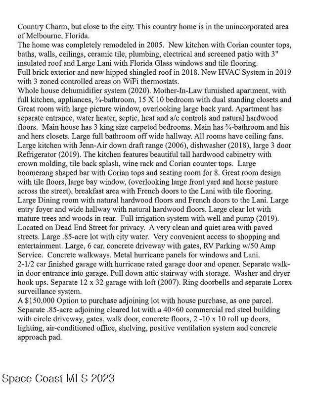 Charming country home with NO HOA ,fully remodeled in 2005, featuring a new kitchen, baths, ceramic tile, plumbing, electrical, and a screened patio with a 3'' insulated roof. The brick exterior and new roof in 2018 add durability. The main house boasts 3 carpeted king-size bedrooms, a spacious kitchen with high-quality appliances, and a large boomerang-shaped bar. A Mother-In-Law apartment with a separate entrance offers a full kitchen, bathroom, and a great room overlooking the backyard. The property includes a 6-car concrete driveway with RV parking, metal hurricane panels, and a 2-1/2 car garage with hurricane-rated door, a separate garage with loft, Ring doorbells, surveillance system.