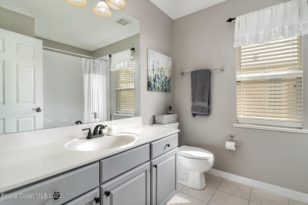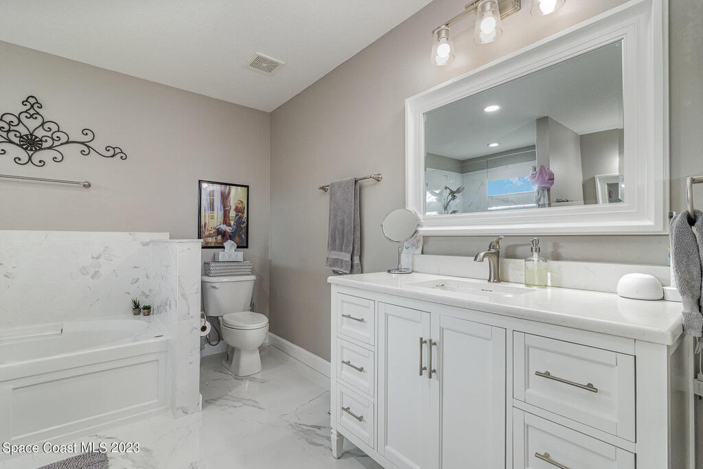 Bright and open floor plan with lake and preserve view. Nicely updated. Wood like laminate and tiled floors. secondary bedrooms are carpeted. Hard surface counters in kitchen, lots of cabinets and long breakfast bar. Amazing totally renovated primary suite. Separate tub and shower, separate his and her vanities and 2 closets. Trussed, screened patio and fenced yard and more! Roof and exterior paint 2022, a/c and water heater 2021. Professional photos coming soon.