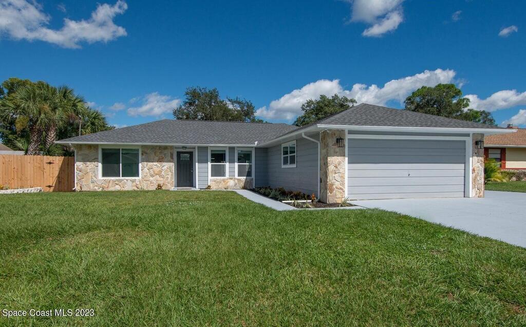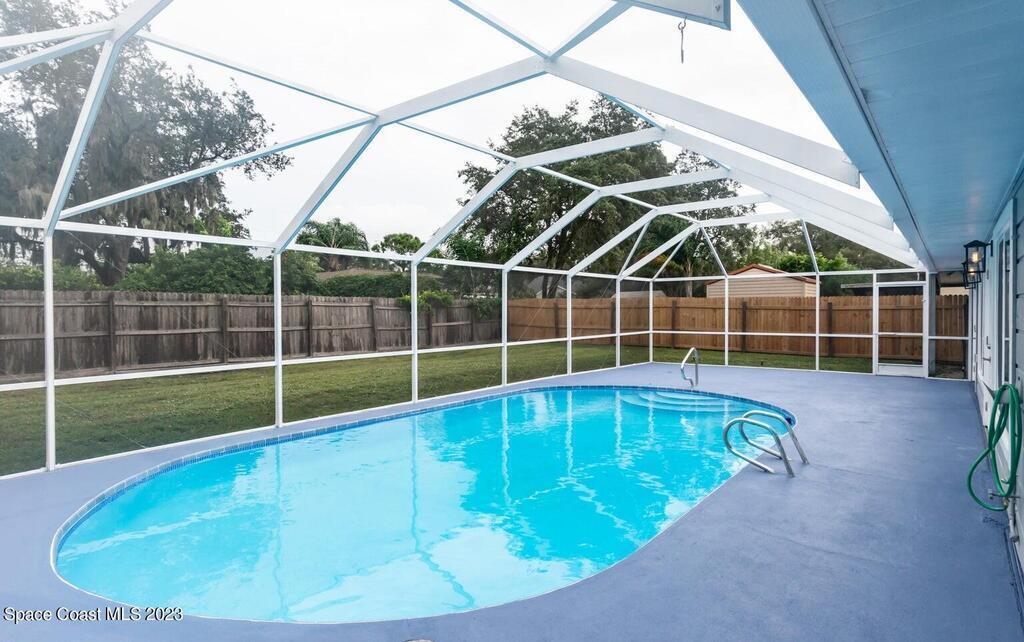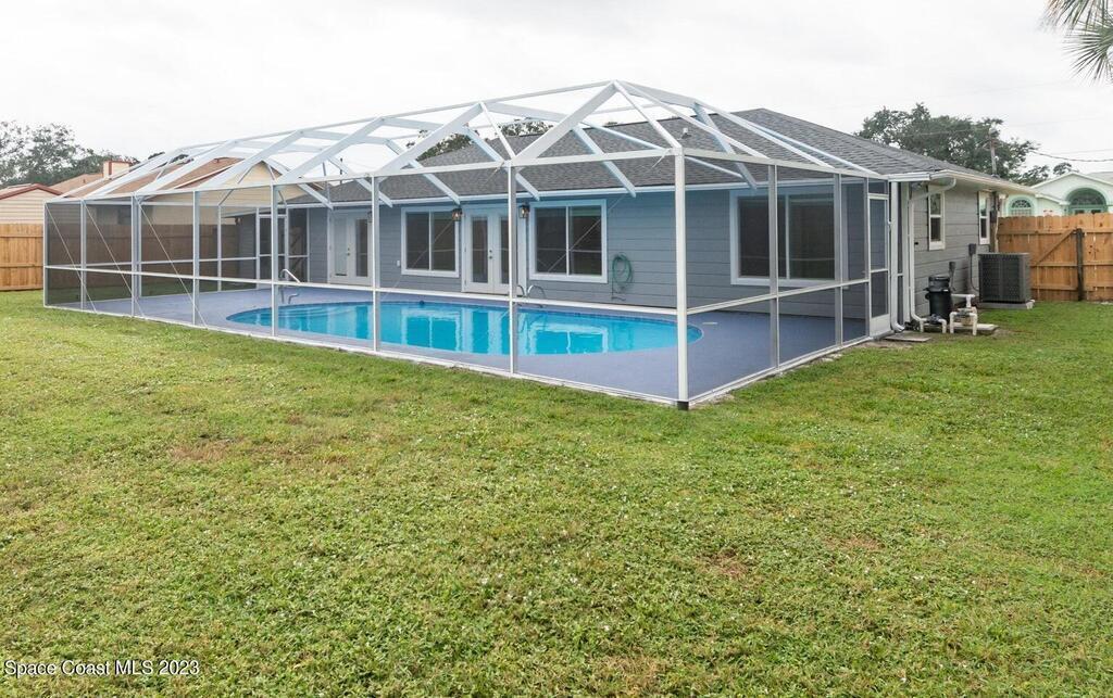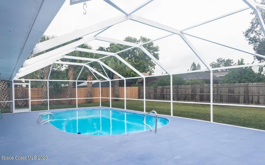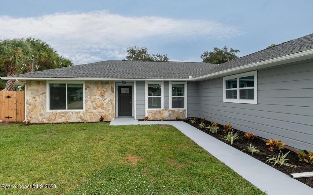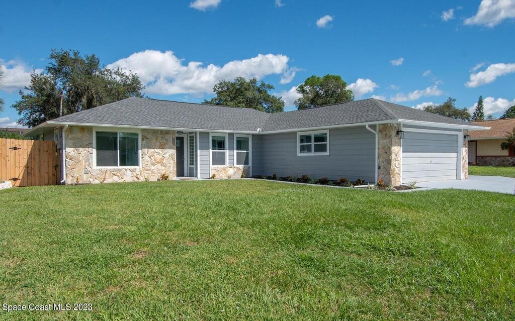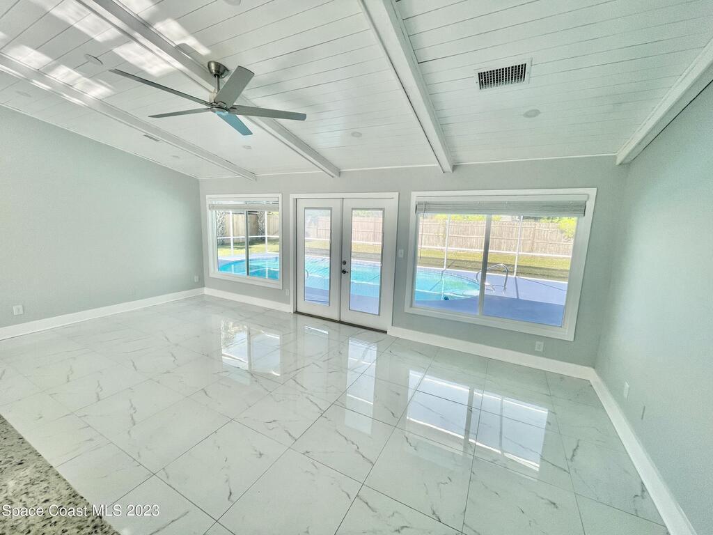 FULLY REMODELED 3 bedrooms/ 2 bathrooms single family home. All upgrades done in 2023!! Beautiful porcelain tile throughout and wooden beams in the living area. ALL BRAND NEW stainless steel appliance, kitchen cabinets, granite countertops, and a large walk-in pantry. Impact sliding glass windows and french doors. Double sink vanity in master suite with a walk-in shower/ closet. NEW roof, A/C, fence, and paint in & out. Private fenced in backyard with screened in, in-ground pool. Huge driveway for boats/ RV parking. Lush landscaping w/ a wonderful quiet neighborhood. Walking steps to elementary school. XLNT location with easy access to KSC, 528, US-1, restaurants, services, amenities, and just 45 mins to Orlando/ attractions. MUST SEE!!