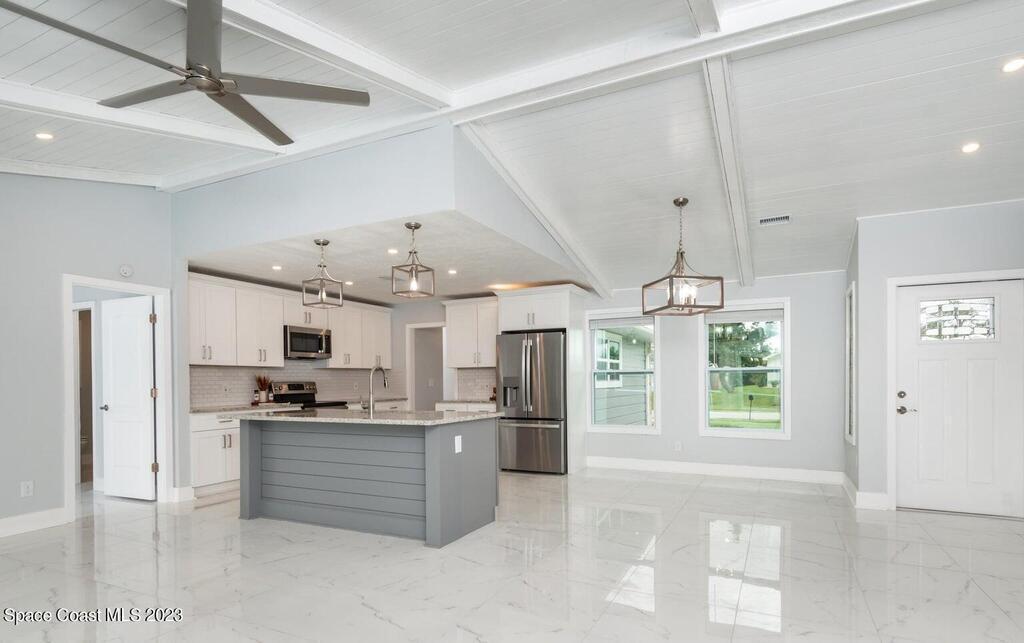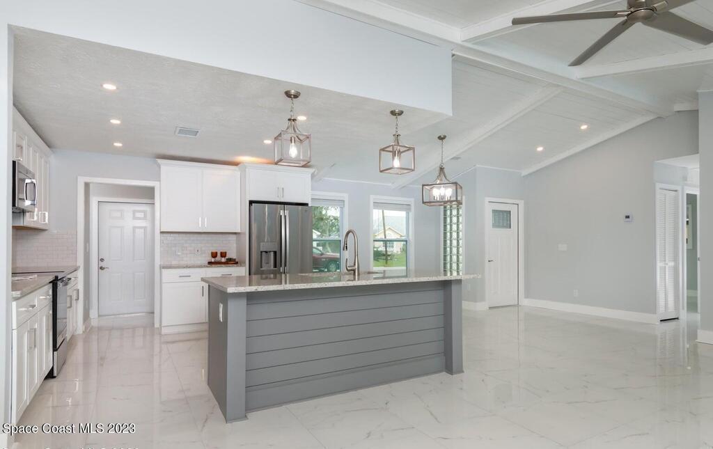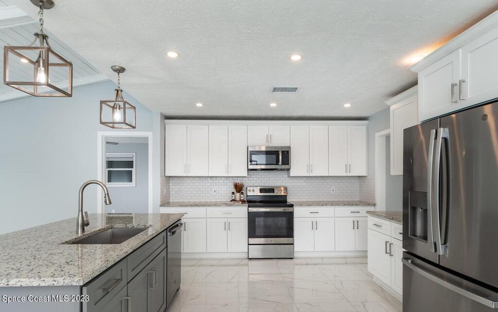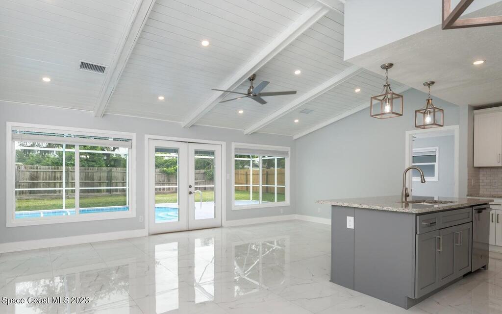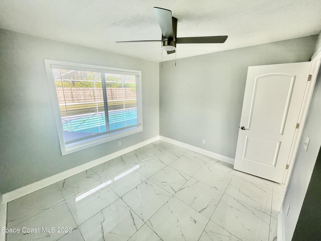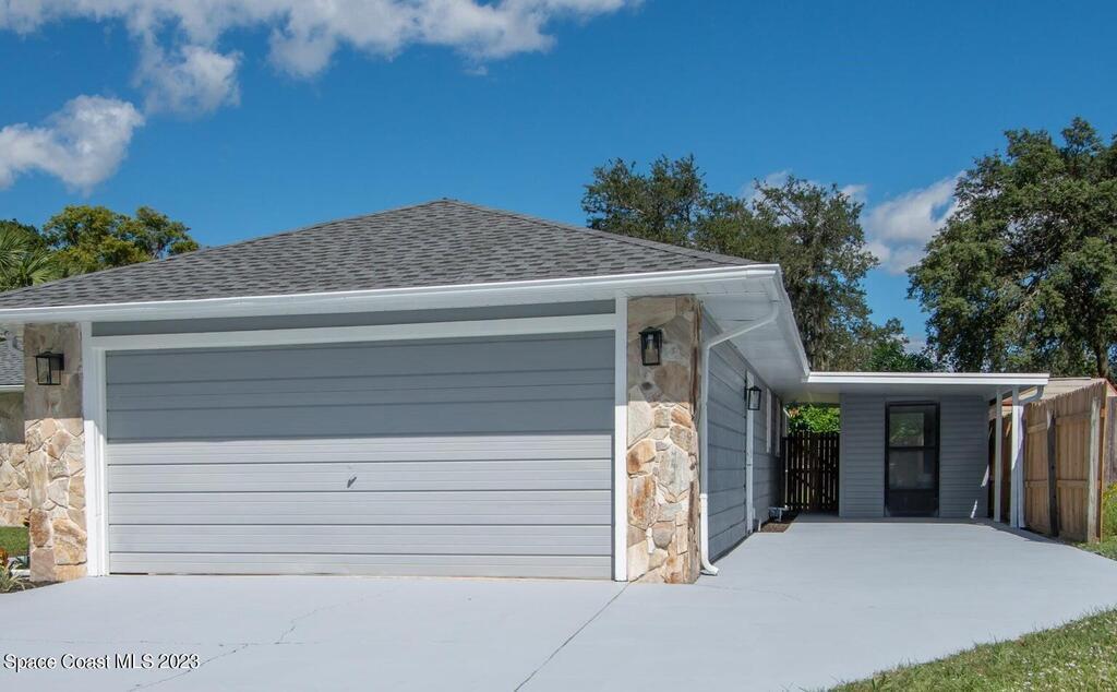 FULLY REMODELED 3 bedrooms/ 2 bathrooms single family home. All upgrades done in 2023!! Beautiful porcelain tile throughout and wooden beams in the living area. ALL BRAND NEW stainless steel appliance, kitchen cabinets, granite countertops, and a large walk-in pantry. Impact sliding glass windows and french doors. Double sink vanity in master suite with a walk-in shower/ closet. NEW roof, A/C, fence, and paint in & out. Private fenced in backyard with screened in, in-ground pool. Huge driveway for boats/ RV parking. Lush landscaping w/ a wonderful quiet neighborhood. Walking steps to elementary school. XLNT location with easy access to KSC, 528, US-1, restaurants, services, amenities, and just 45 mins to Orlando/ attractions. MUST SEE!!